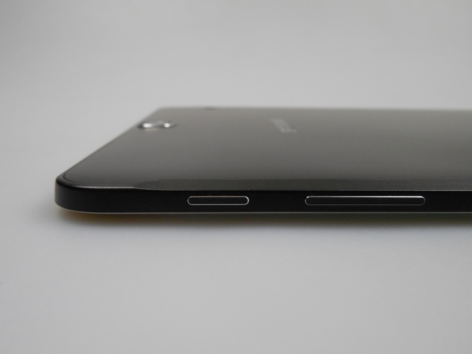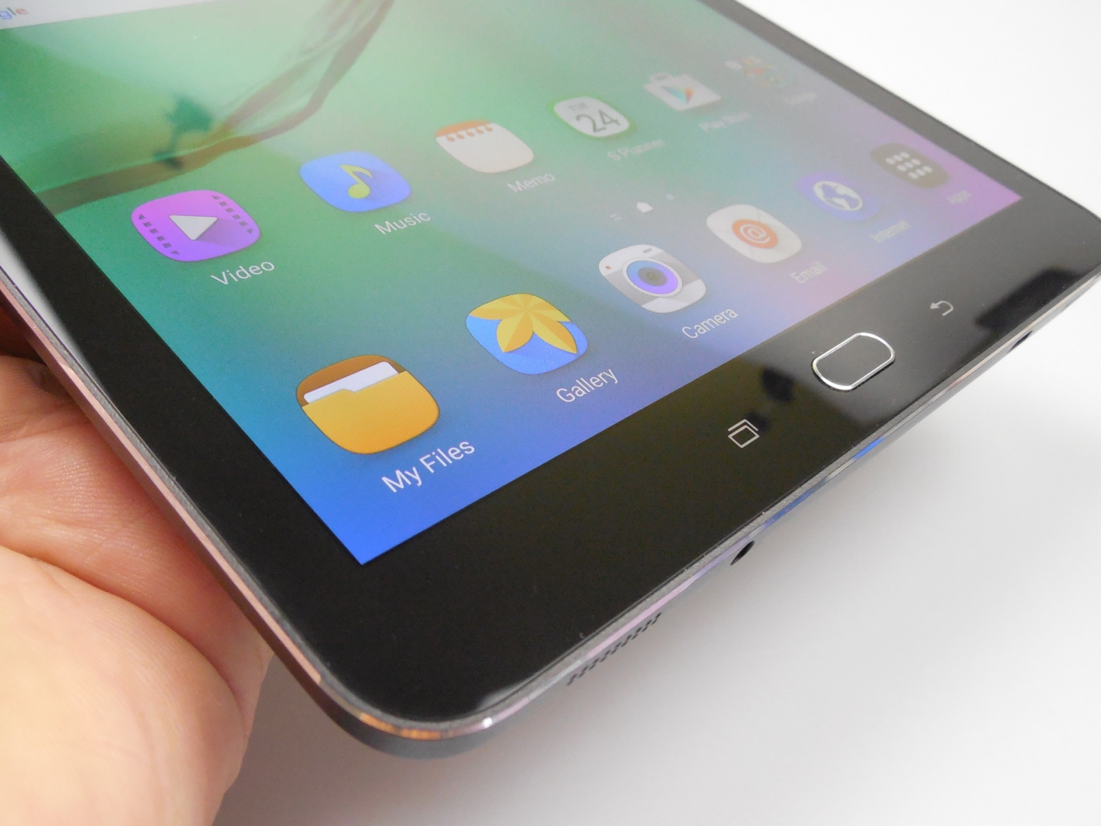 Dacă tot am menţionat abordarea portrait, trebuie spus şi că ea reprezintă o schimbare faţă de predecesor, Tab S 10.5 având format landscape. În zona frontală a lui Tab S2 9.7 se află camera selfie, senzorii, butonul Home fizic cu scanner de amprente integrat şi cele două butoane capacitive, plus ecranul cu muchii destul de mari, dar acceptabile în contextul în care trebuie să avem cum să ţinem tableta mai comod la gaming.