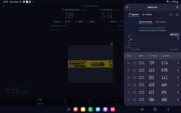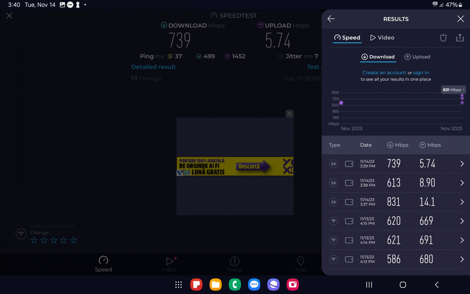 Ele se aud OK, le-am purtat prin căştile Galaxy Buds FE pe care le testăm simultan. Cat despre SpeedTest, la testul Wi-Fi am ajuns la 621 Mbps la download în reţeaua Digi România şi la 691 Mbps la upload. La testul 5G în reţeaua Orange România am ajuns la 831 Mbps. la download şi 14.1 Mbps la upload. Asta în Parcul IOR.