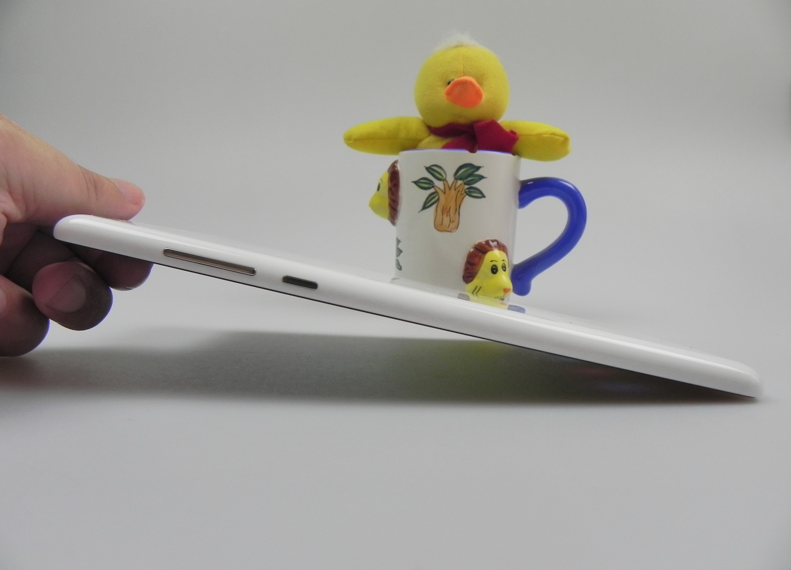 în spate descoperim camera principală, două microfoane și două difuzoare în partea inferioară, în vreme ce în zona superioară a tabletei se află un jack audio, iar jos portul microUSB folosit pentru încărcare. în dreapta regăsim butoanele de volum și butonul On/Off, care au un feedback bun și sunt ușor de folosit. în cele din urmă, în stânga se afla slotul microSD, accesibil cu ajutorul unei cheițe metalice oferite la pachet cu tableta.