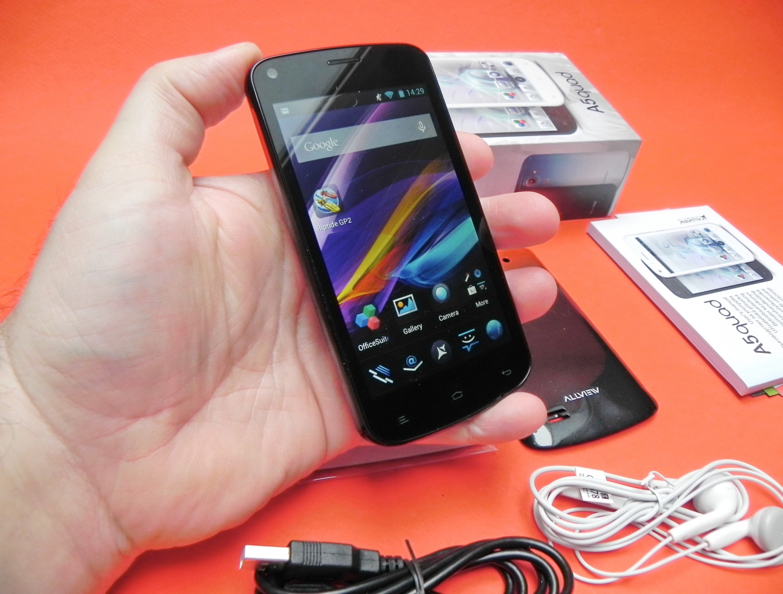 Ecranul de 4.3 inch are o margine mare, iar acest telefon are o cameră care iese în evidență printr-o protuberantă în zona din spate. Butoanele fizice ale lui A5 Quad oferă un feedback bun, iar în zona frontală regăsim și butoane capacitive sub ecran. Per total acest telefon este masiv, dar și destul de solid și rezistent.