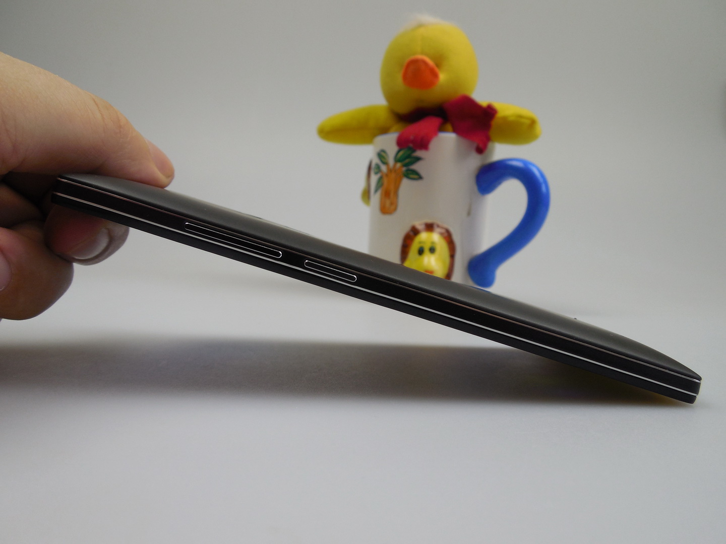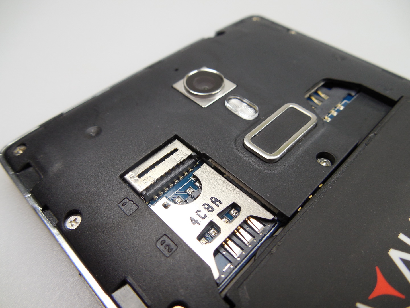 După ce înlăturăm capacul bateriei găsim două slot-uri SIM, un slot microSD, bateria şi difuzorul, care e mai mic decât fac orificiile exterioare să pară. În zona superioară se află un emiţător infraroşu şi jack audio, iar jos găsim un microfon şi port microUSB. În stânga nu se află nimic, iar în dreapta avem butonul On/Off şi butoanele de volum, toate cu feedback OK.