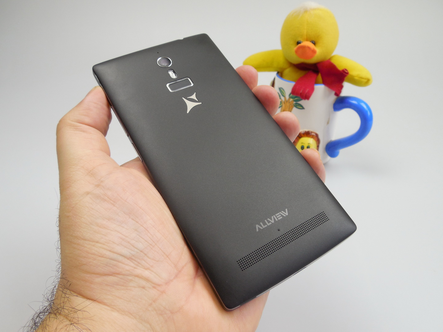 La pachet cu terminalul vine şi o husă, care are şi rol de capac spate al bateriei, plus protecţie pentru ecran. În zona frontală a lui Allview E3 Sign se află o bărbie, care aduce cu cea care se iluminează de pe Oppo Find 7, plus earpiece-ul, camera frontală, senzorii şi butoanele capacitive. Nu avem LED de notificări. În spate regăsim camera, bliţul, un microfon, scannerul de amprente şi difuzorul.