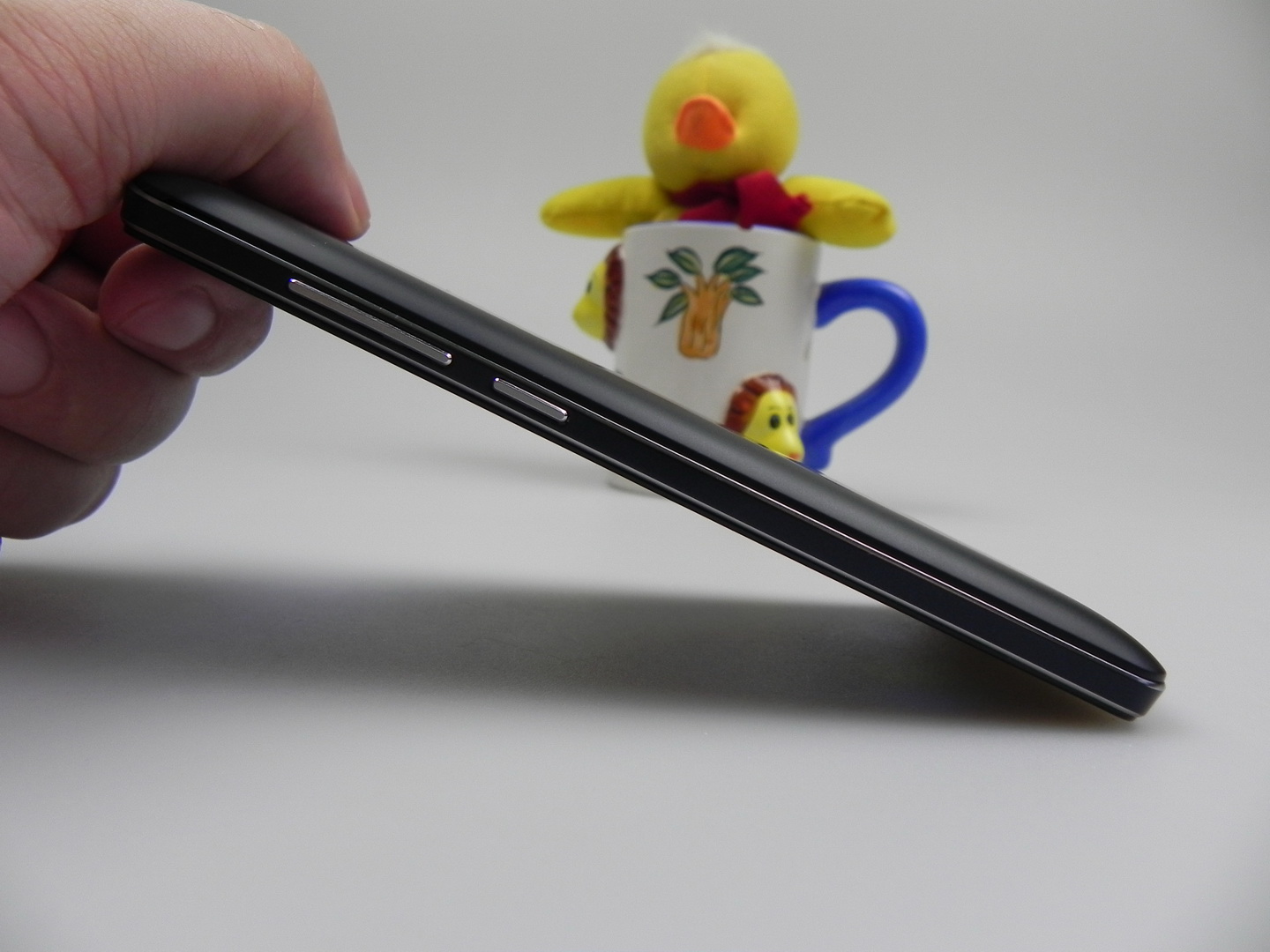 Capacul din spate se înlătură relativ ușor, iar sub el se află două slot-uri microSIM, un slot microSD și o baterie neînlăturabilă. în zona superioară găsim jackul audio, iar în cea inferioară portul microUSB și încă un microfon. în stânga nu se află nimic, iar în dreapta avem butoanele de volum și cel On/Off, toate cu feedback bun. Acest model are foarte puține curbe și aduce un design OK, solid și cu o ramă laterală destul dură, cu o zonă ce pare metalică.