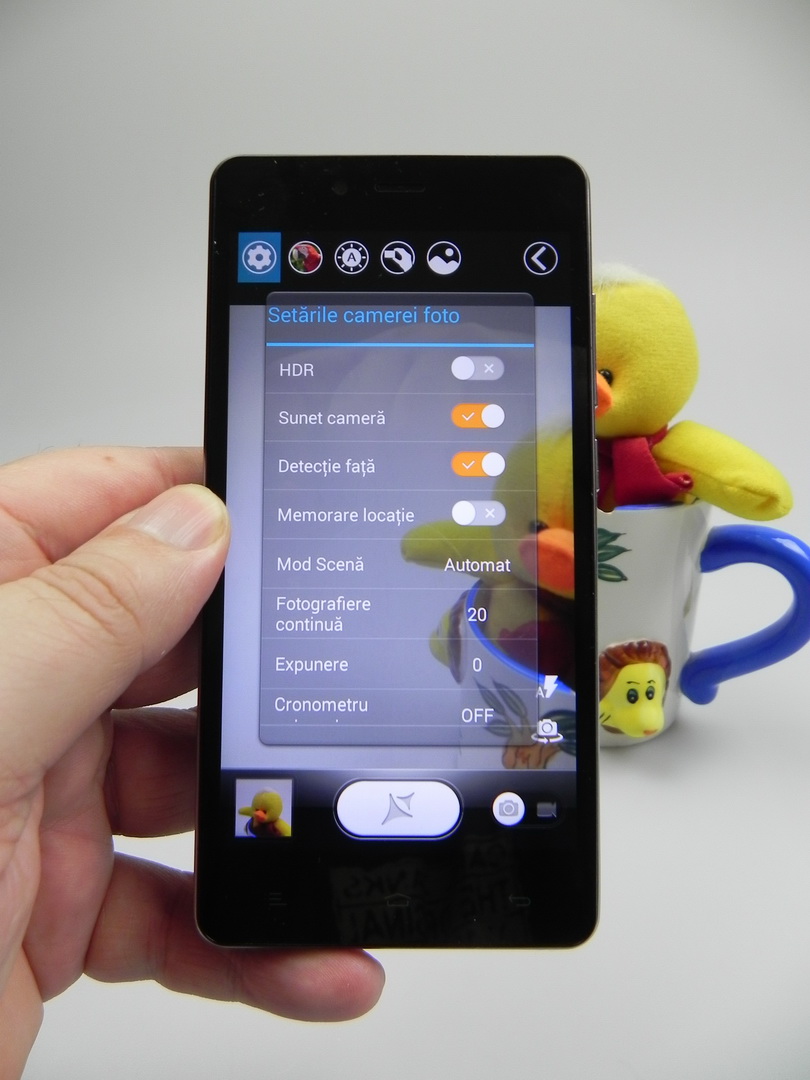 Nivelul de luminozitate e rezonabil la 370 LUX și deși în ultima vreme am testat mai multe telefoane midrange ce ating 400+ LUX, diferența nu se simte prea mult aici, deci luminozitatea e bună. Setările ecranului nu includ opțiuni deosebite. în ce privește camera, ea este o unitate de 8 MP, cu senzor OV 8830, pe care îl știm de la Allview V1 Viper (versiunea inițială), P4 Alldro și P5 Quad.