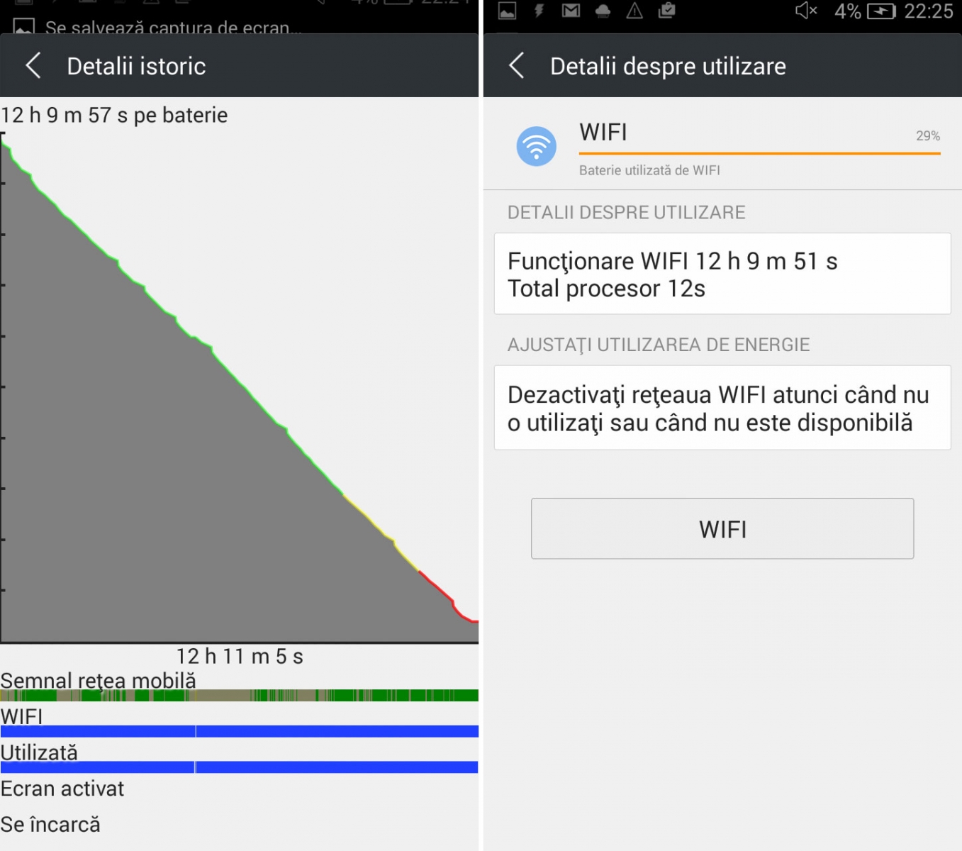 încărcarea e destul de lungă, durând 4 ore. Partea bună e că puteți încărca și alte terminale via cablu USB OTG și veți putea primi energie de la alte handset-uri sau tablete în același mod. în zona de Setări găsim opțiunea Economisire CPU, care scade performanța procesorului pentru a economisi energie. Ca o ultimă mențiune, acesta este telefonul cu ecran de 5 inch cu bateria cea mai bună testată la Mobilissimo.ro vreodată.