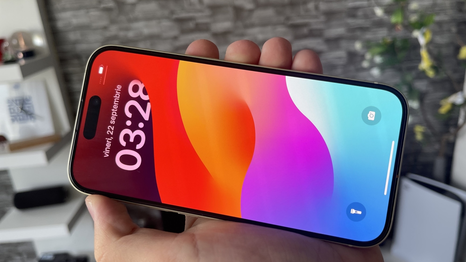 Diagonala rămâne la 6.1 inch și avem un raport corp/ecran care crește cu puțin, de la 86 la 86.4%. Avem protecție Ceramic Shield, iar panoul are un nume fancy în stilul caracteristic Apple și anume Super Retina XDR OLED. Bifăm și HDR10, Dolby Vision și o luminozitate maximă de 1000 nits. Rezoluția este de 2556 x 1179 pixeli, iar muchiile nu sunt atât de înguste ca pe un iPhone 15 Pro, dar măcar sunt simetrice și nu te vor deranja atât de tare.