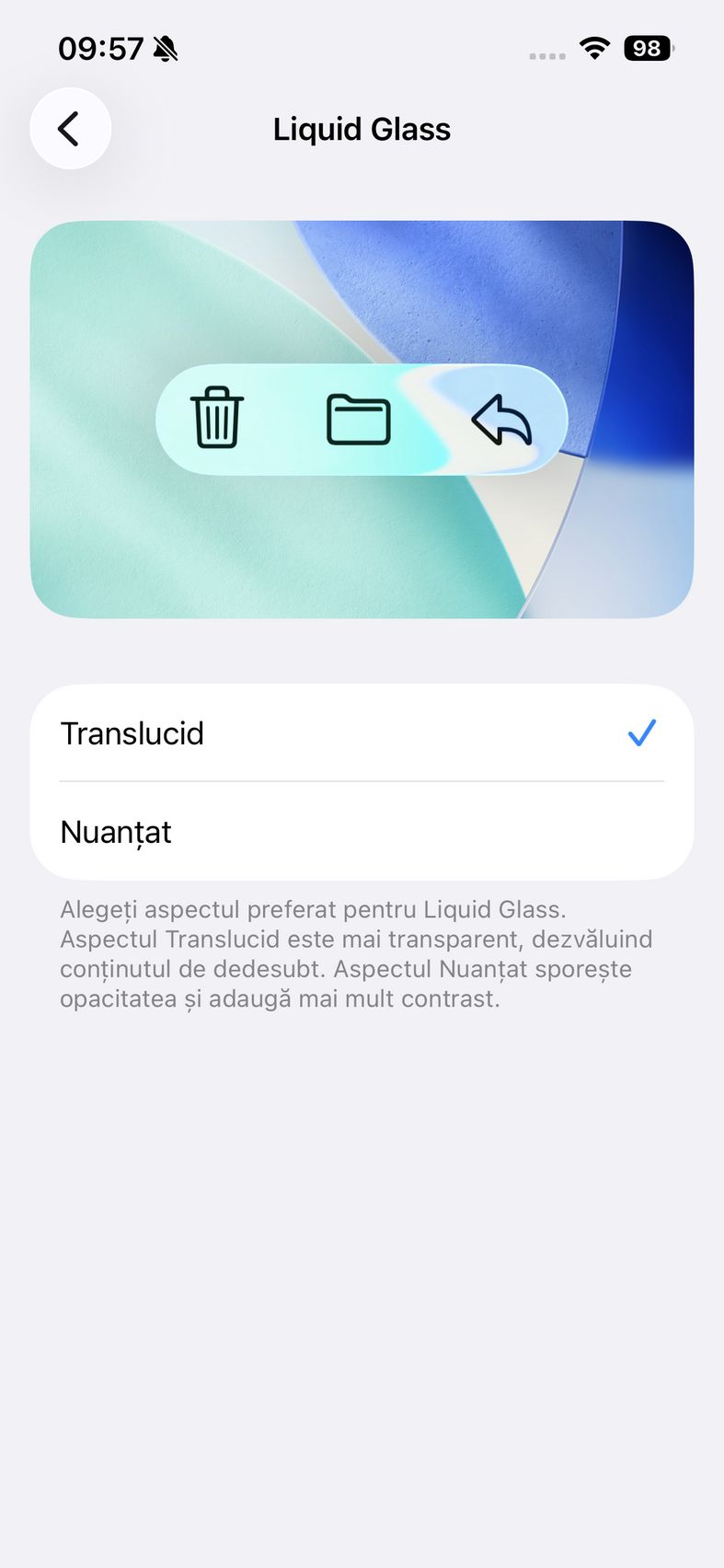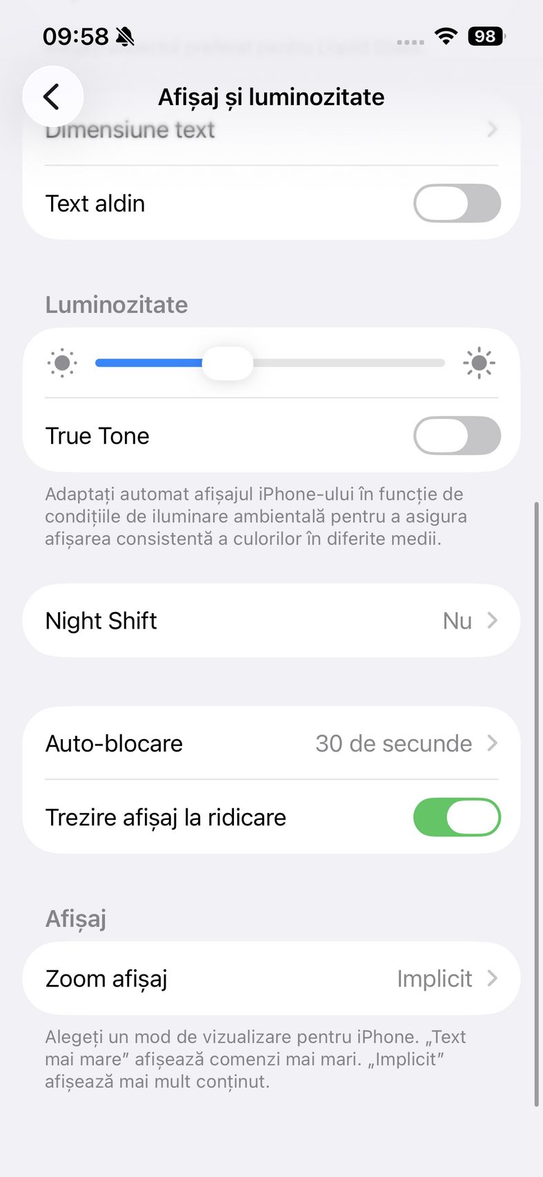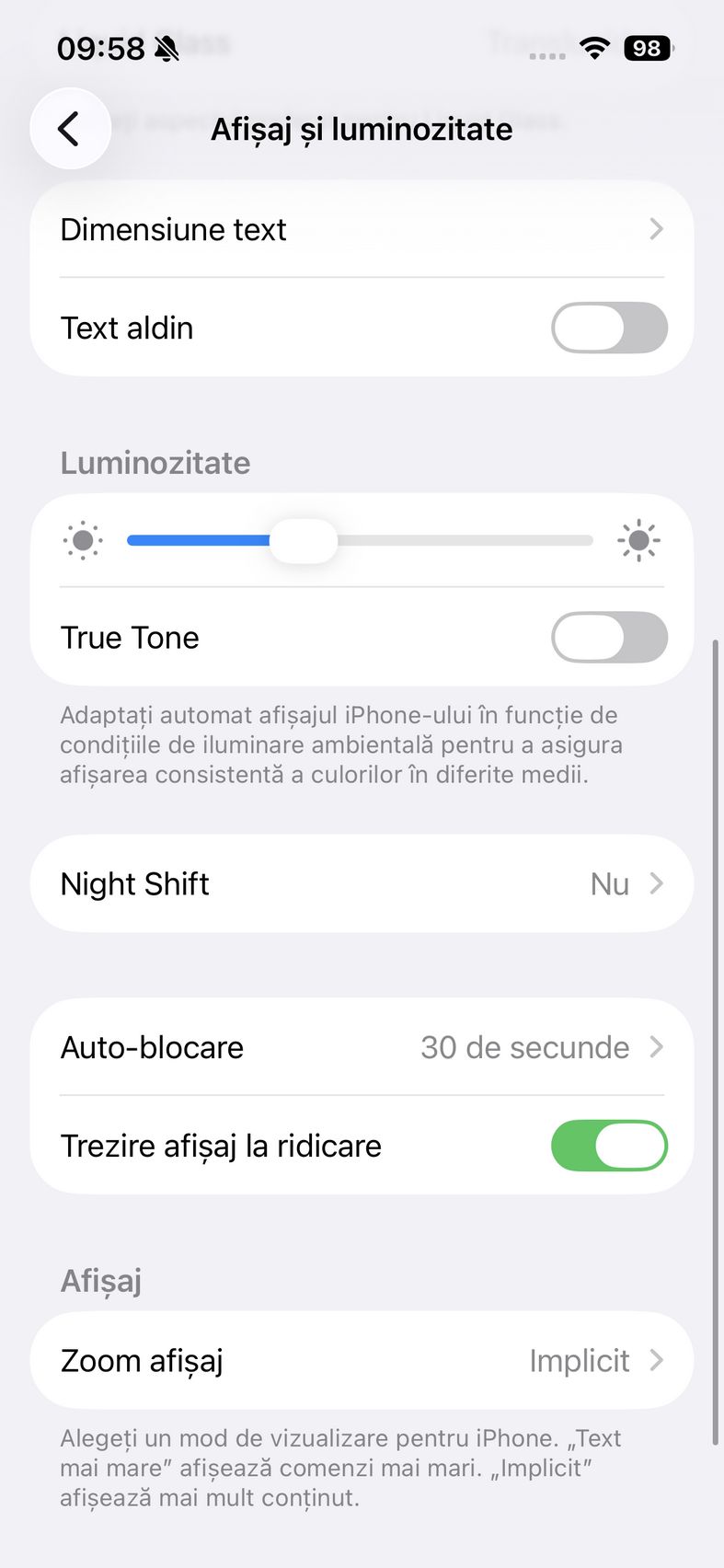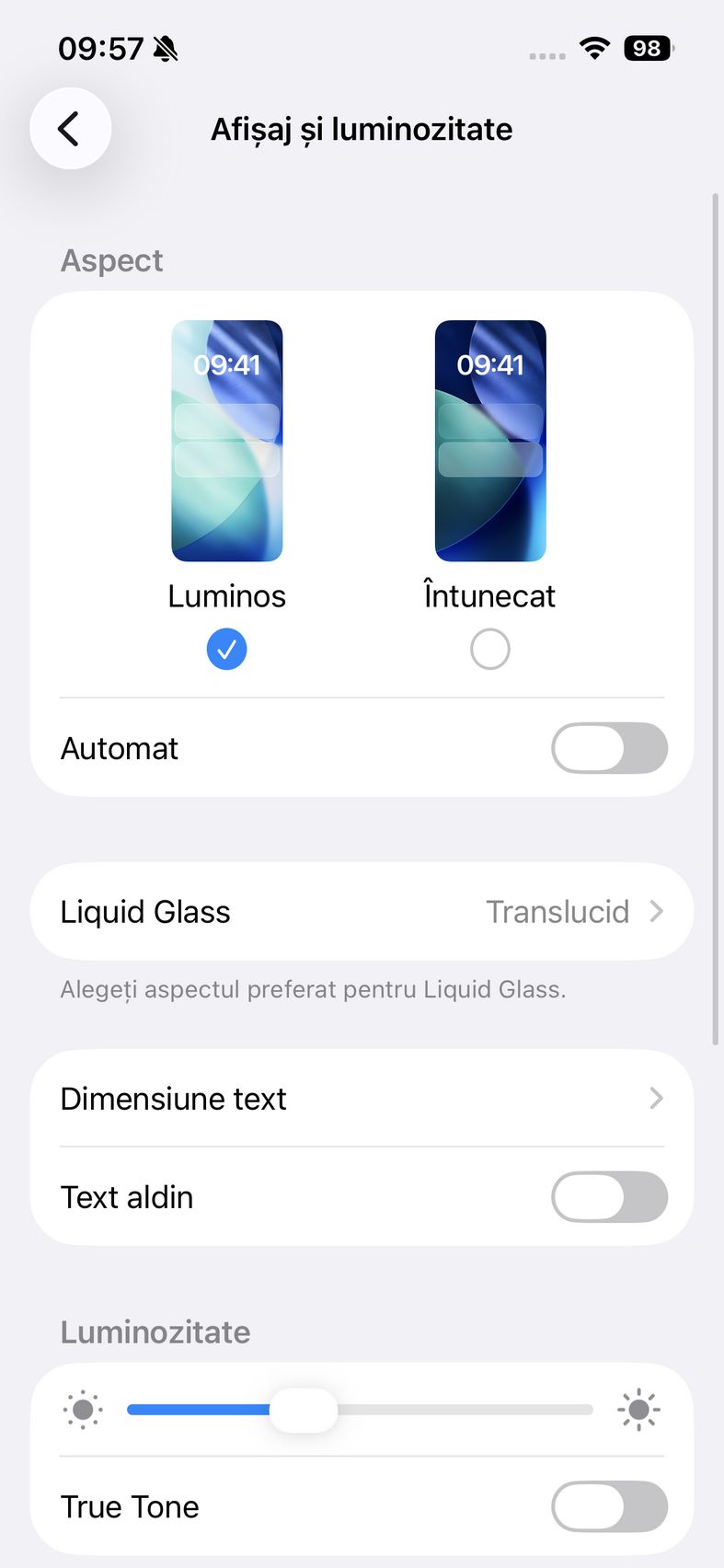 În rest setările asociate ecranului sunt cele clasice Apple. Am găsit modul Luminos și pe cel Întunecat, plus bifa de Automat, iar mai jos la setările Liquid Glass se poate alege dintre Translucid sau Nuanțat, pentru a fi mai ușor de vizualizat conținutul în anumite scenarii.