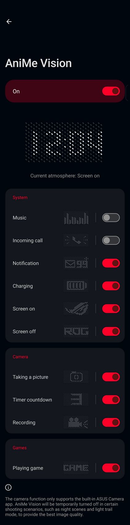 Tot de aici controlezi și matricea AniMe Vision și poți activa/dezactiva această afișare mini LED din spate pentru opțiuni precum Muzică, Apeluri, Notificări, Încărcare, Ecran aprins, Ecran stins, cât și timer pentru cameră, înregistrare video sau simbol pentru cameră foto. În jocuri ai un text personalizat afișat. Nu am găsit de unde să setez un text personalizat, dar am văzut că se poate.