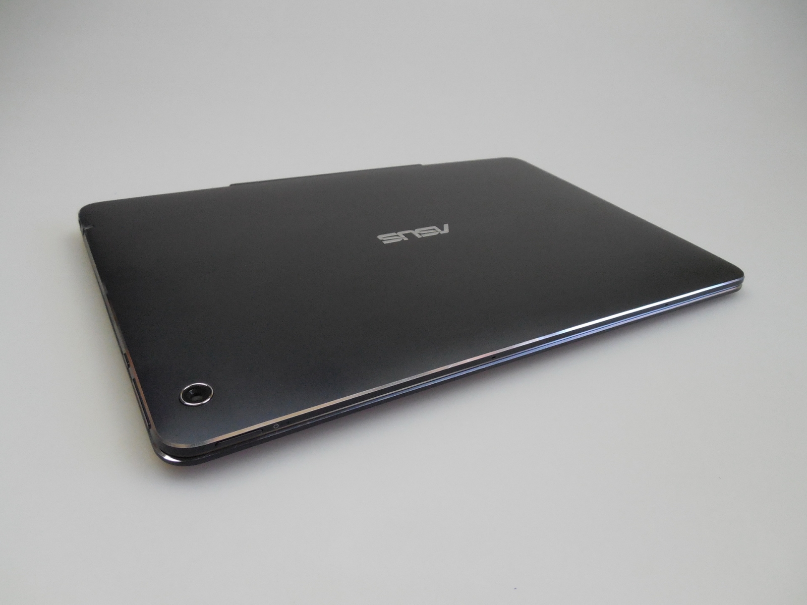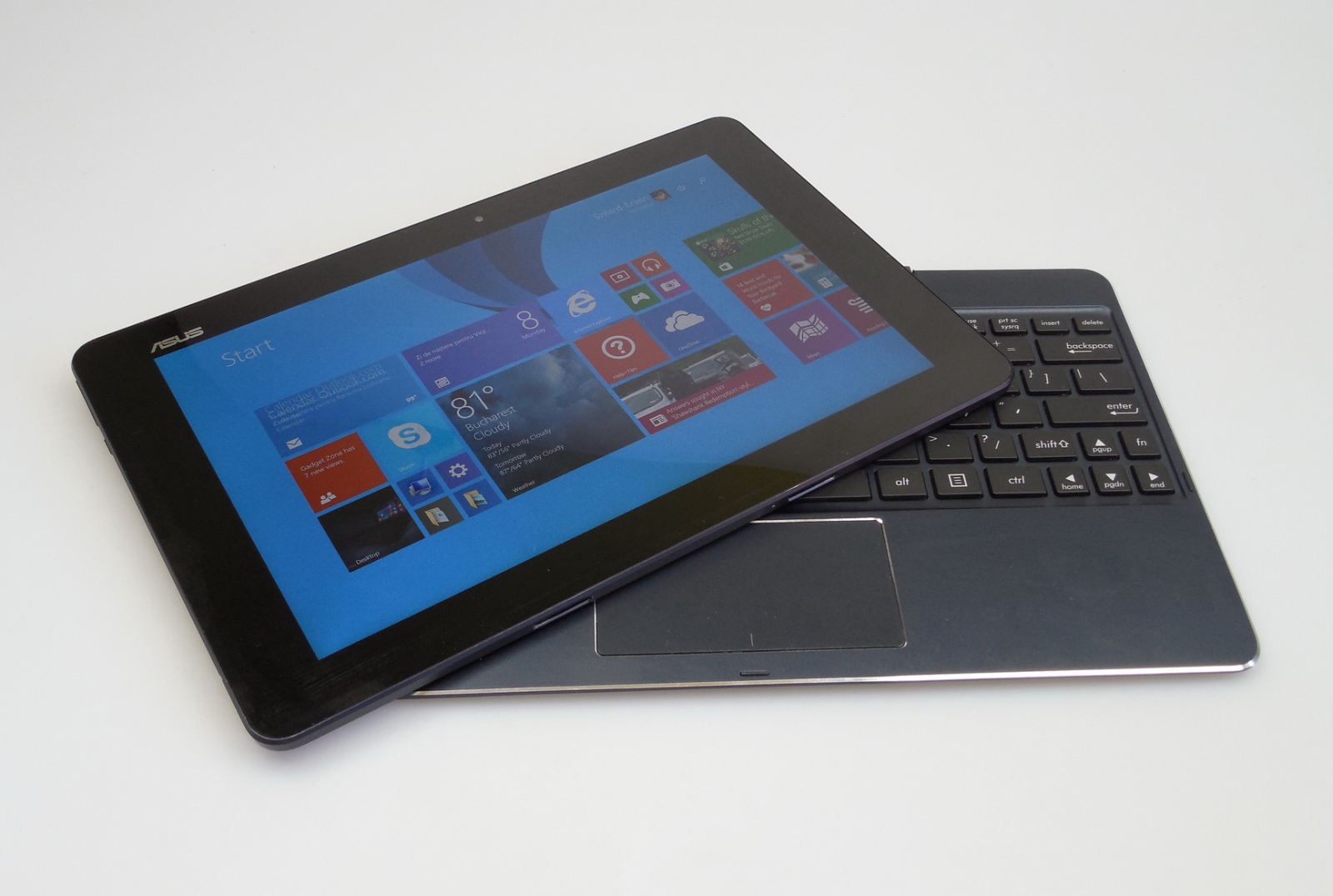 Tableta include în zona frontală o cameră şi ecranul, în spate camera principală, iar în zona superioară avem butonul On/Off, care e greu de găsit pe pipăite şi uneori nu răspunde 100% la comenzi. Lângă acest buton se află şi un LED care se aprinde atunci când tableta se încarcă. În zona inferioară se află mecanismele de conectare la tastatură, iar în stânga găsim butoanele de volum şi butonul Home, toate cu feedback OK.