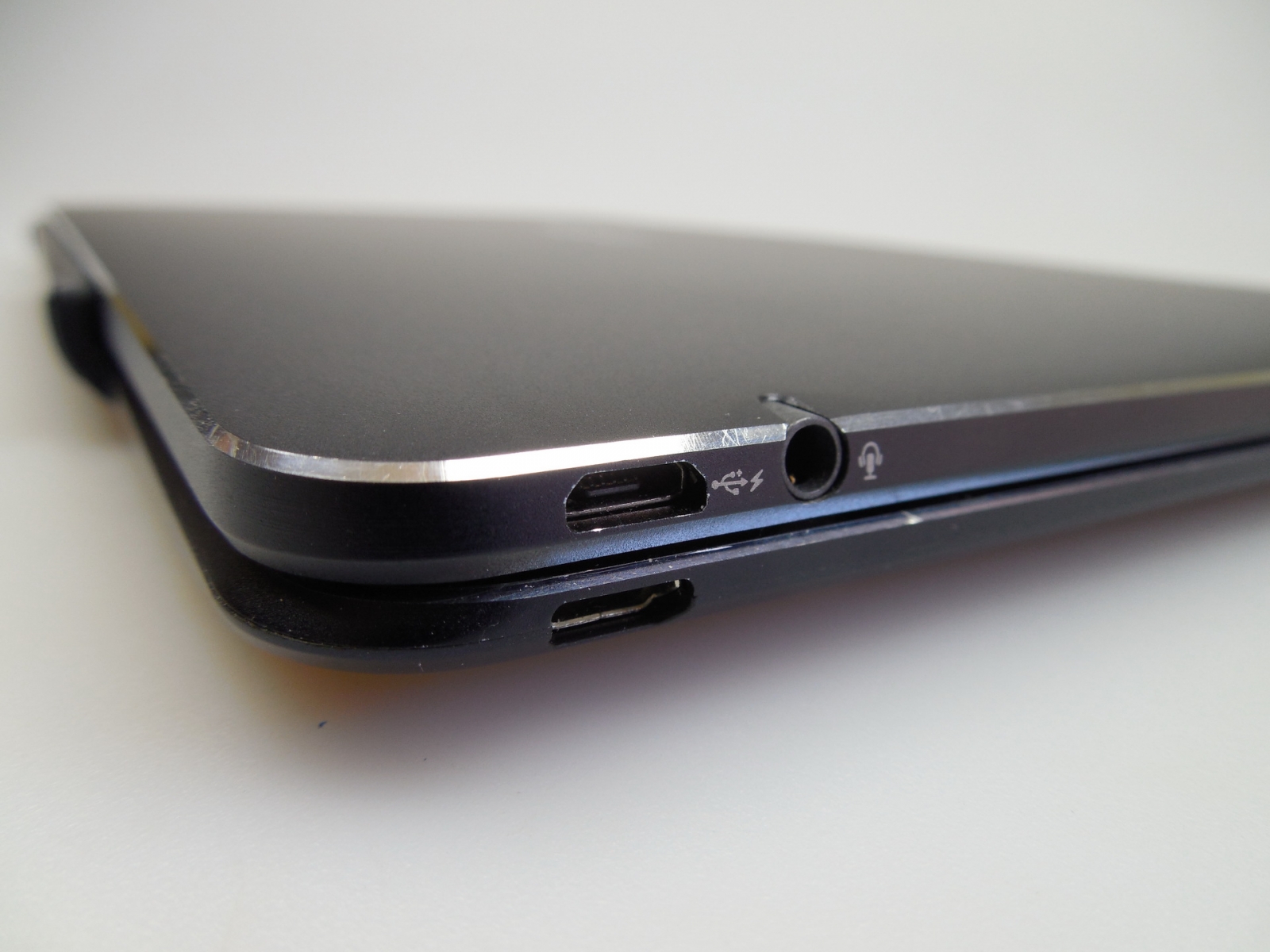 Există şi un buton cu 3 poziţii pentru conectarea via Bluetooth/On/Off. Există aici şi un port microUSB lateral folosit pentru încărcarea dockului. Dockul e fabricat din plastic şi metal, cu o ramă solidă. Trecem la hardware şi descoperim aici un display de 10.1 inch cu rezoluţie Full HD şi aspect 16:10. Acesta este un ecran TruVivid, cu panou IPS şi iluminare LED. Procesorul este unul quad core Intel Atom Z3775, tactat la 1.46 GHz (Bay Trail T), ce poate ajunge până la 2.39 GHz. Avem la bord şi Intel HD Graphics, 2 GB RAM DDR3, 32, 64 sau 128 GB stocare, slot microSD, o cameră de 5 MP în spate şi una frontală de 2 MP.