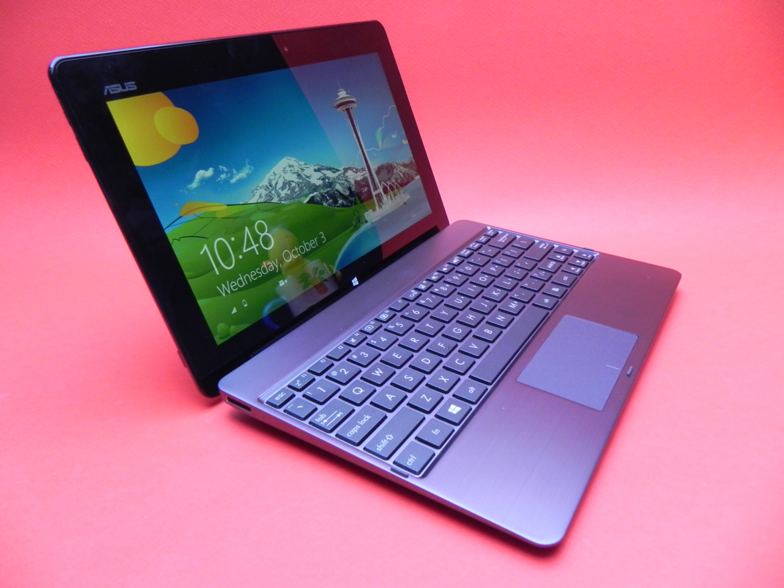 Despre tastatura dock nu sunt multe de zis, ea fiind un model QWERTY foarte comod și la fel de apreciată de noi ca și variante de pe modelele Transformer. De menționat și faptul că atunci când tableta e atașată la dock, rezultatul este un “laptop” cu alură destul de slim, cu design metalic atractiv. Se observă și că îmbinarea dintre tableta și laptop nu mai e atât de vizibilă ca la tabletele Android, fiind practic ascunsă într-un mod foarte inteligent de către ASUS.