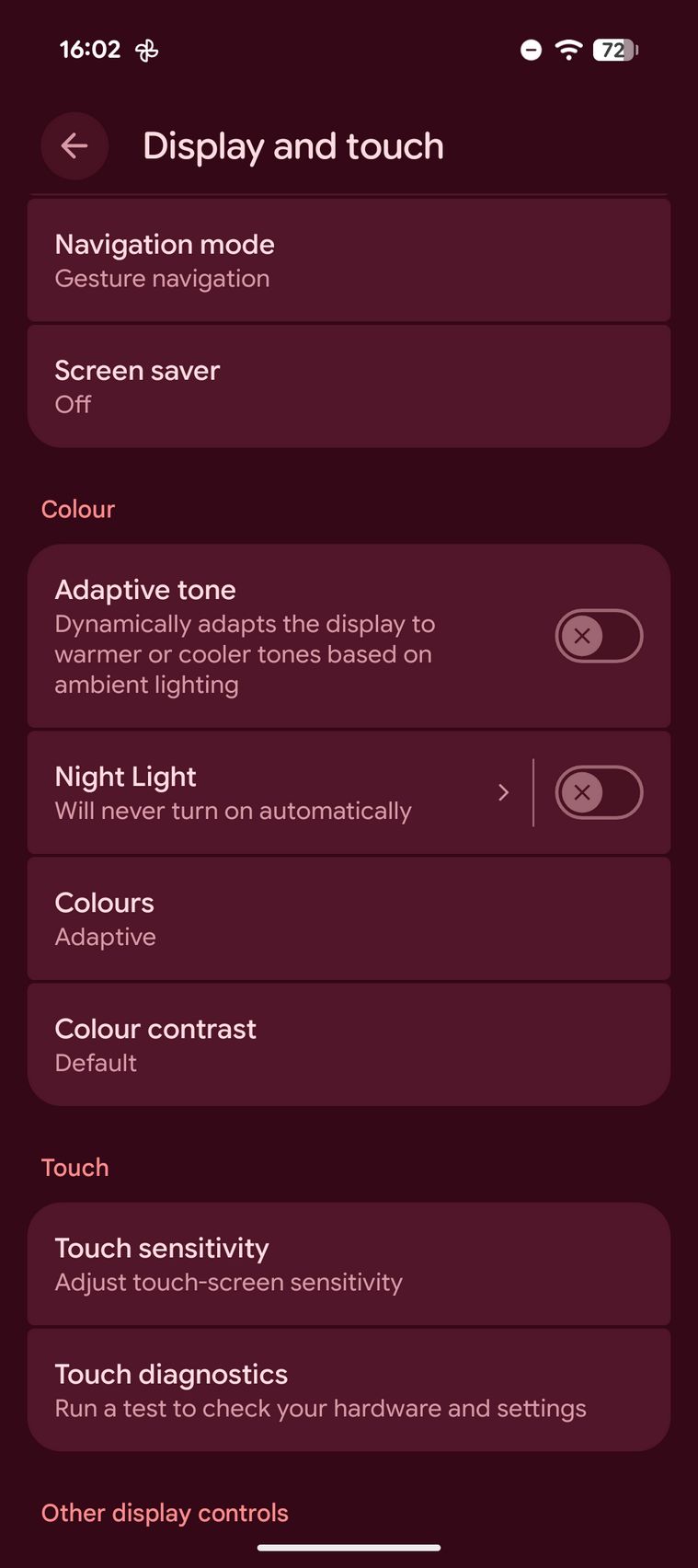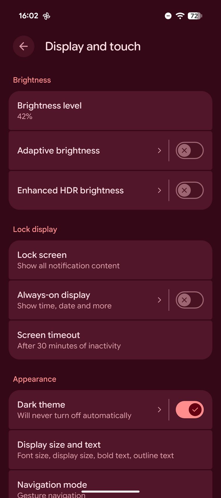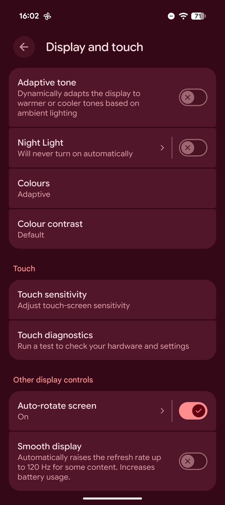 De fapt din top 10 cele mai luminoase smartphone-uri, 7 sunt telefoane Google! Excelent! Setările asociate sunt cele clasice Google. Am găsit Night Light, Dark Theme, slider de luminozitate și Smooth Display pentru refresh rate până la 120Hz.