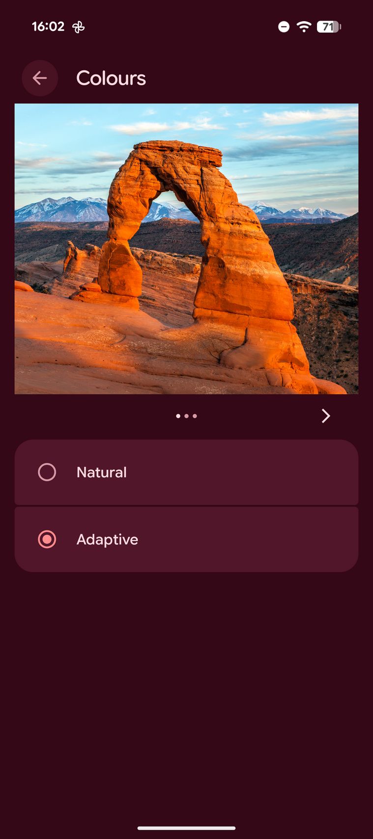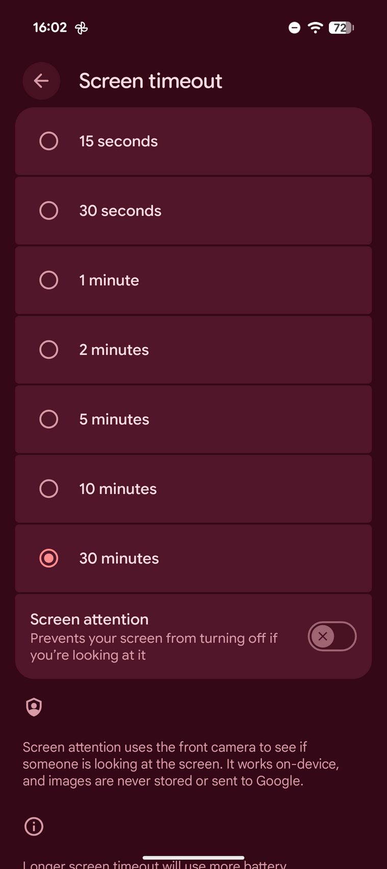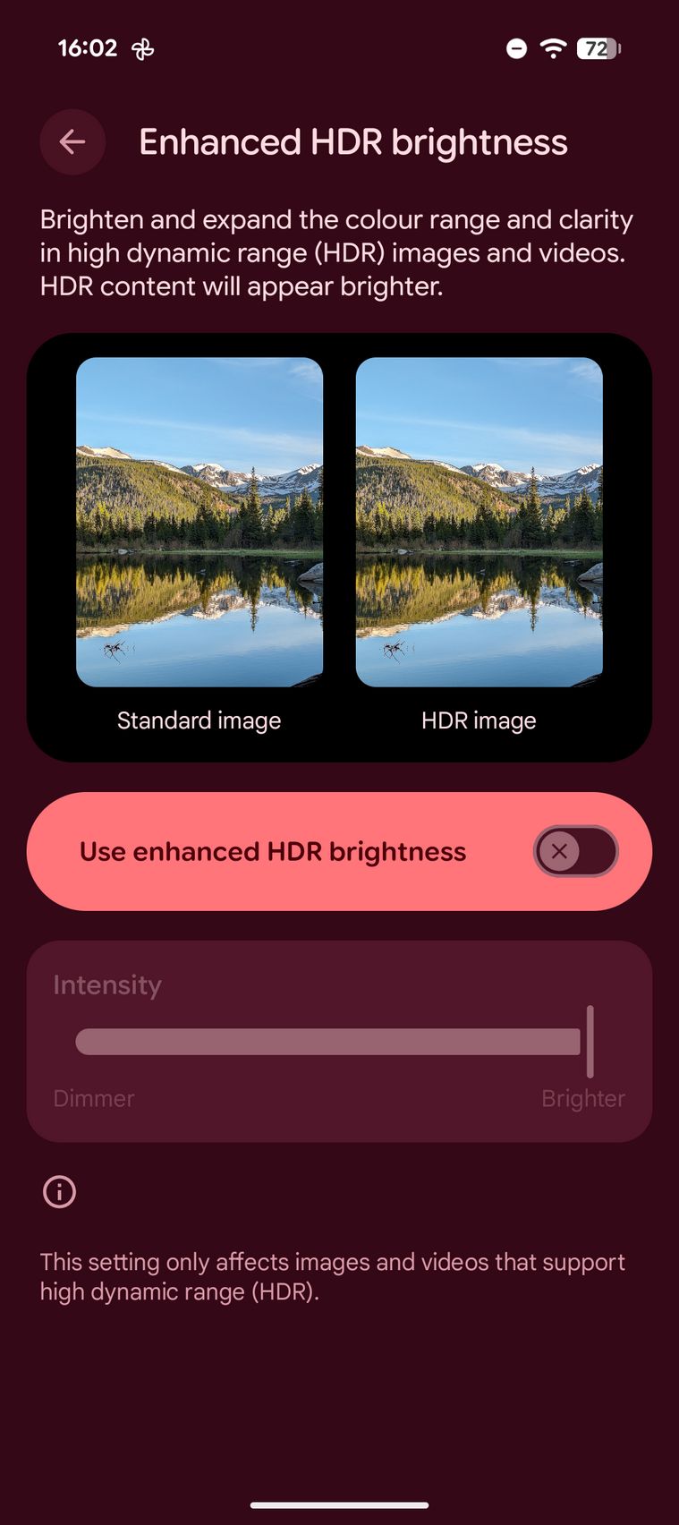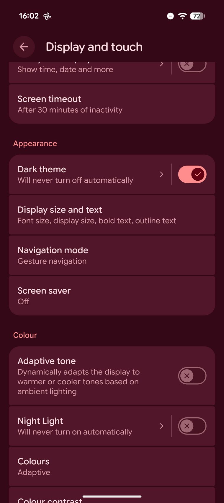 De fapt din top 10 cele mai luminoase smartphone-uri, 7 sunt telefoane Google! Excelent! Setările asociate sunt cele clasice Google. Am găsit Night Light, Dark Theme, slider de luminozitate și Smooth Display pentru refresh rate până la 120Hz.