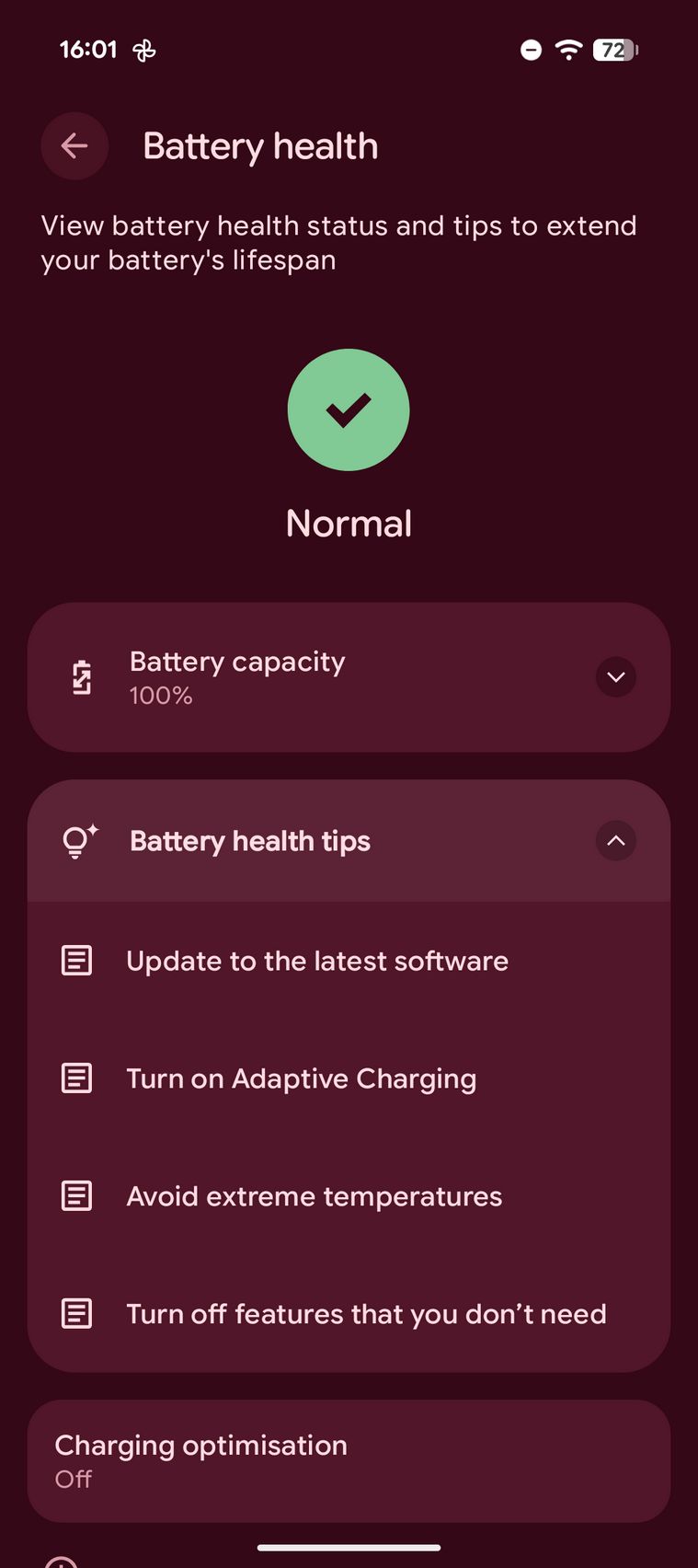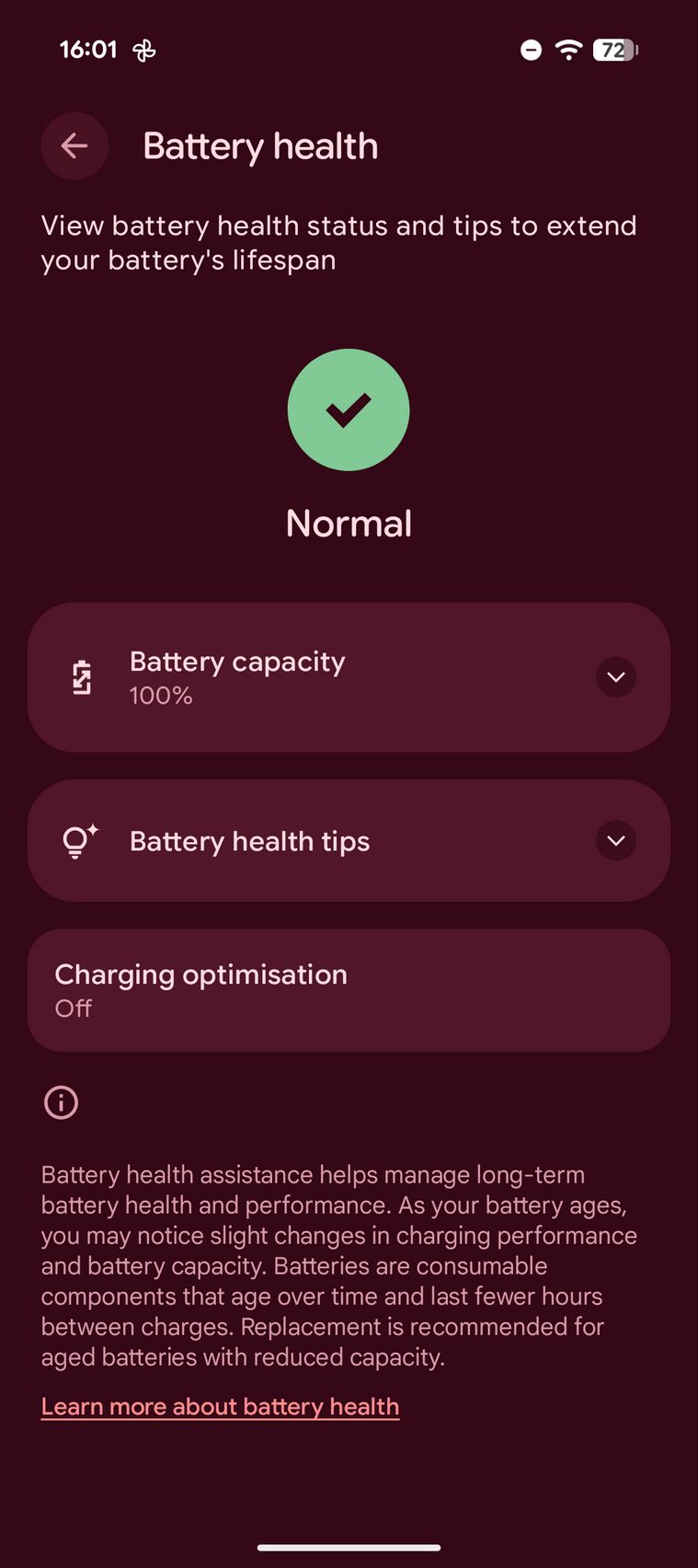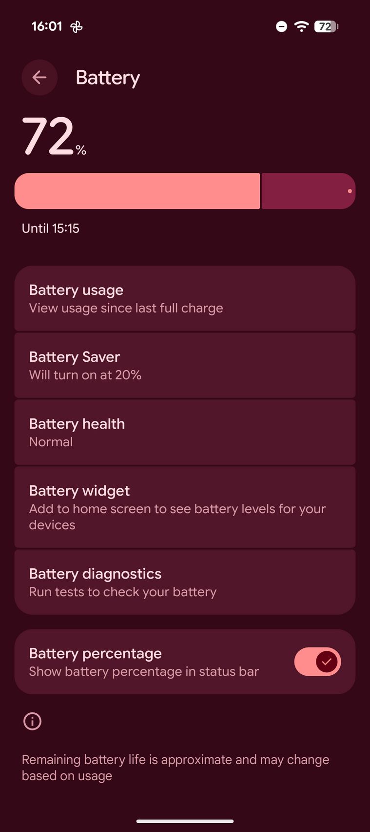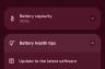 În 5 minute eram la 14%, în 15 minute la 33% iar în 30 de minute la 59% (9a era la 50%). Prin setări am găsit grafic utilizare, Battery Saver, detalii despre sănătatea acumulatorului, un widget de baterie și posibilitate de a activa o optimizare de încărcare prin care se extinde durata de viață a bateriei.