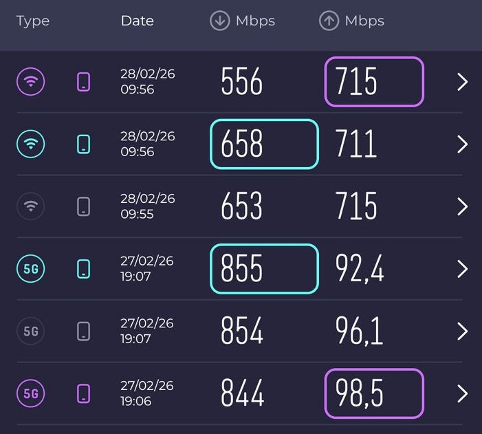 Am realizat și testele de conectivitate SpeedTest. Întâi pe 5G în zona Cișmigiu unde pe Orange am urcat la 855 Mbps la download și 98.5 Mbps la download. Acasă cu DIGI 1 Gbps și router WiFi 7 am prins 658 Mbps download și 715 Mbps la upload. Pentru muncă în deplasare 5G-ul este excelent la descărcare, iar odată ce prinzi un WiFi urci date foarte rapid.