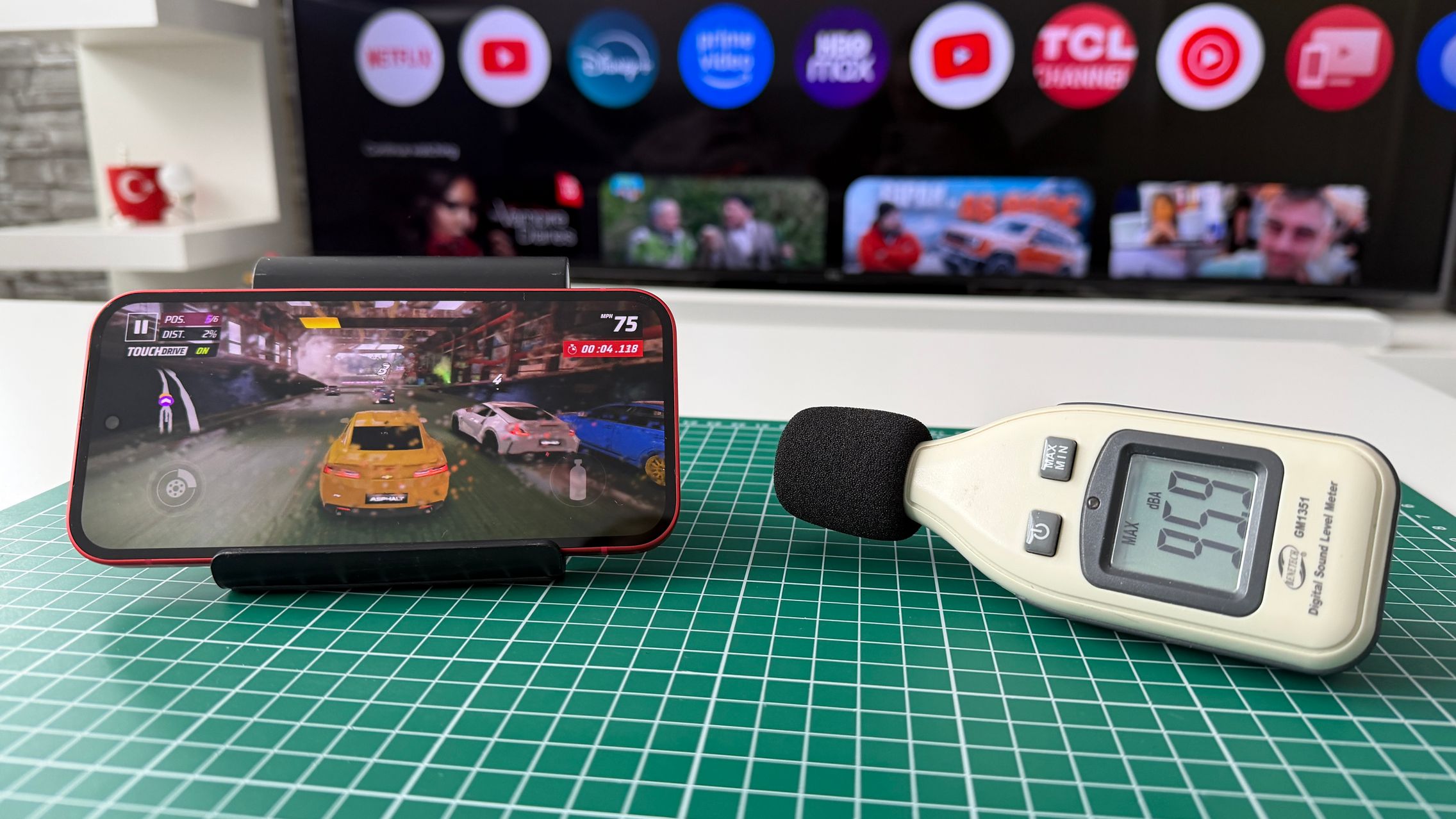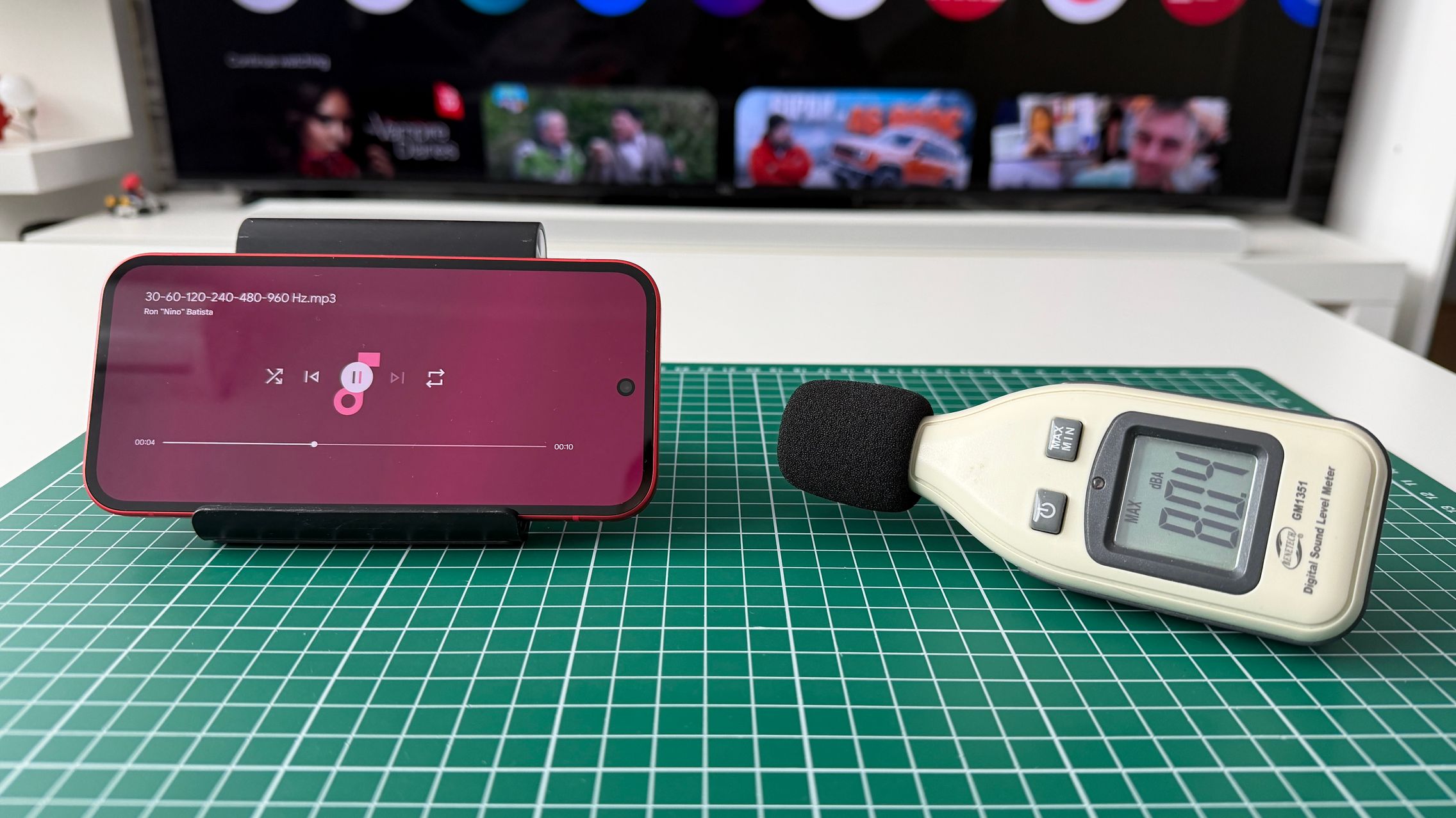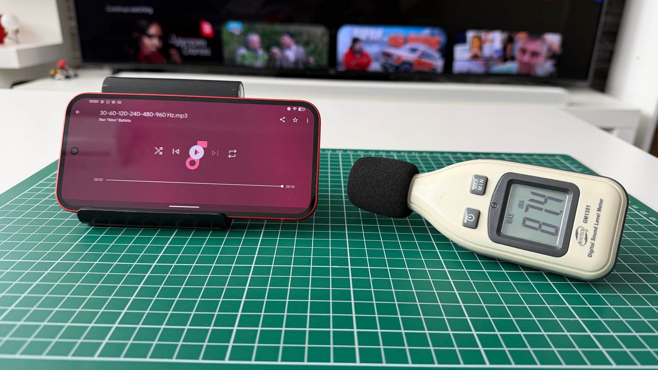 Întâi avem sample-ul acustic cu 80,4 dBA la difuzorul de sus și 87,4 dBA la cel de jos. Îmi amintesc că la predecesor difuzorul de jos era mai gălăgios, pe la 96 dBA, dar eu nu aș vedea asta ca un downgrade ci mai degrabă ca o încercare de echilibrare a potenței audio. Difuzoare în echilibru înseamnă și acustică mai precisă și bogată, ceea ce primești aici.