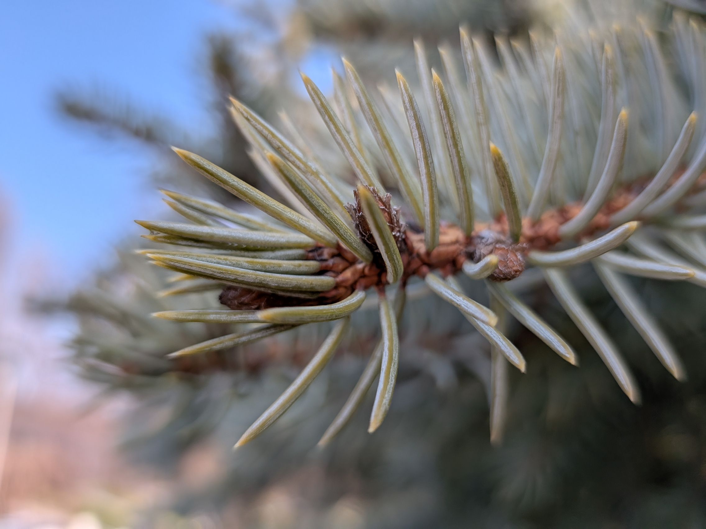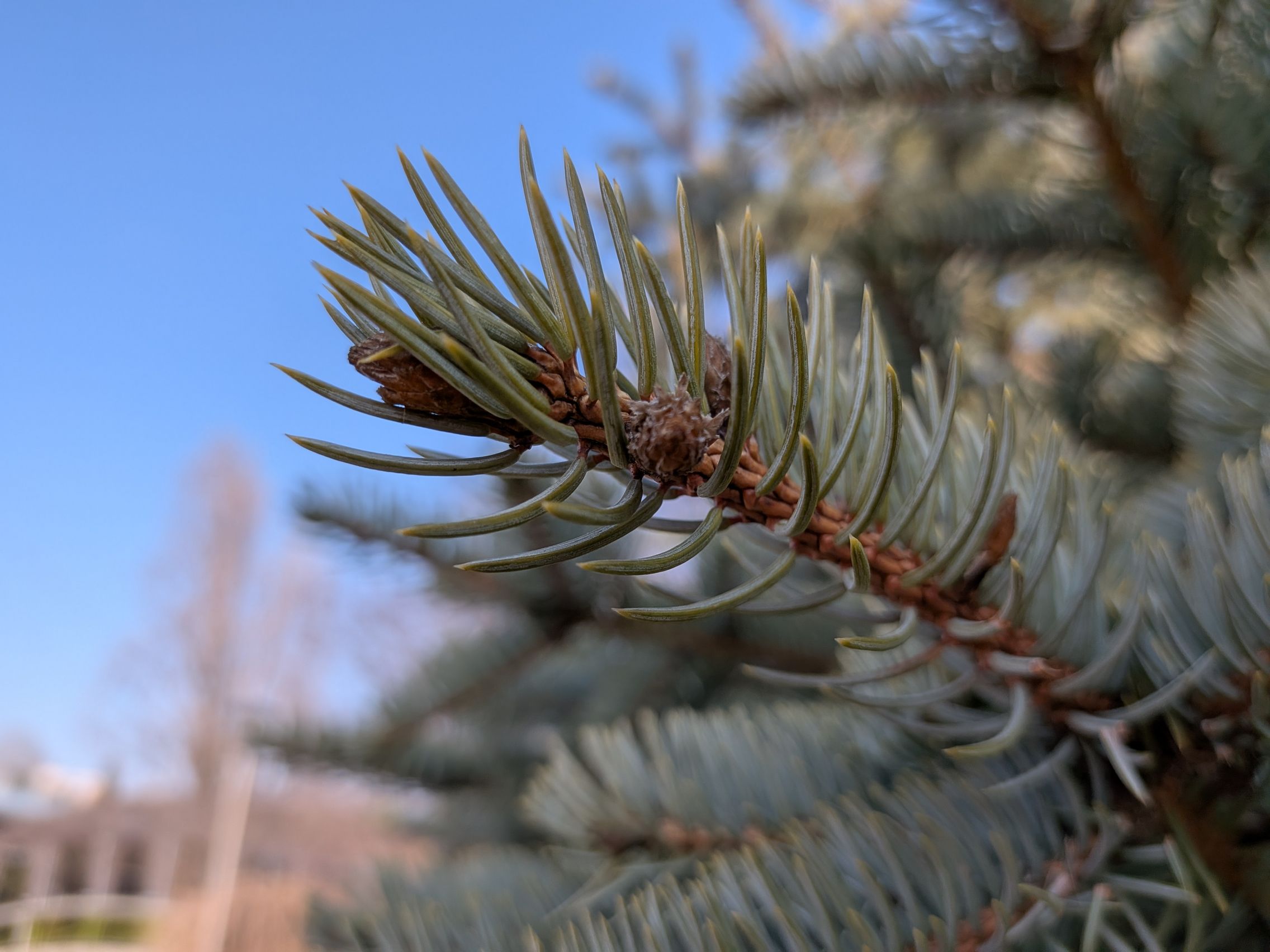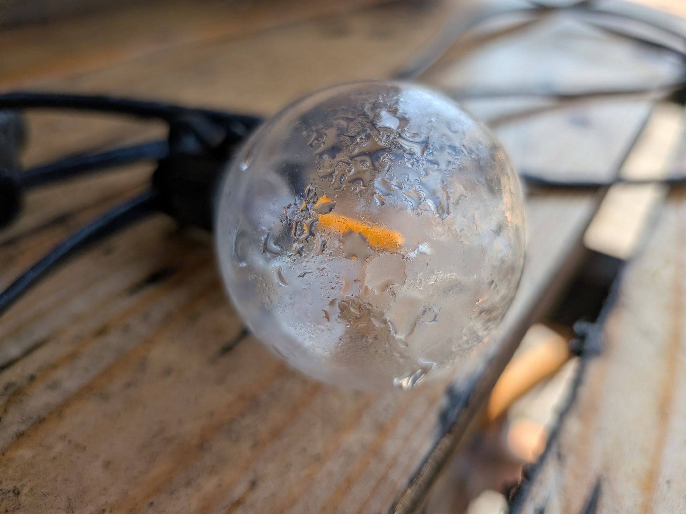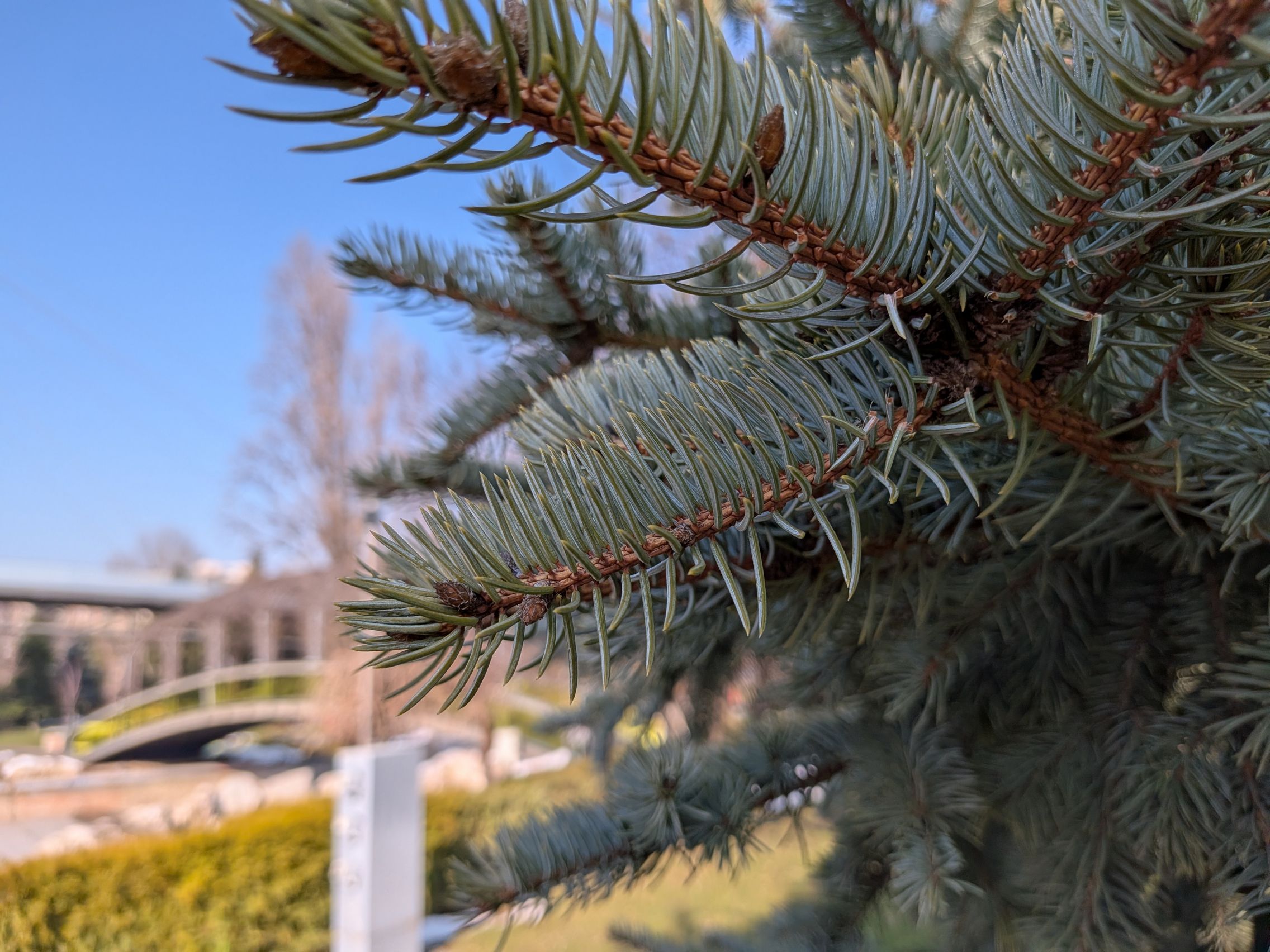 Camera lui Pixel 10a știe și macro și îi iese bine, chiar dacă nu este prea intuitiv. Mi-ar plăcea să am un buton dedicat de fotografiere macro și nu să intre în acțiune doar când simte și apare acel simbol floricică. La prima încercare cu acele fructe roșii nu prea am fost mulțumit, dar de la beculețul acoperit de apă s-au mai schimbat lucrurile în bine. Acele ace de brad parcă îți intră în ochi, iar textura lemnului se simte în poză.