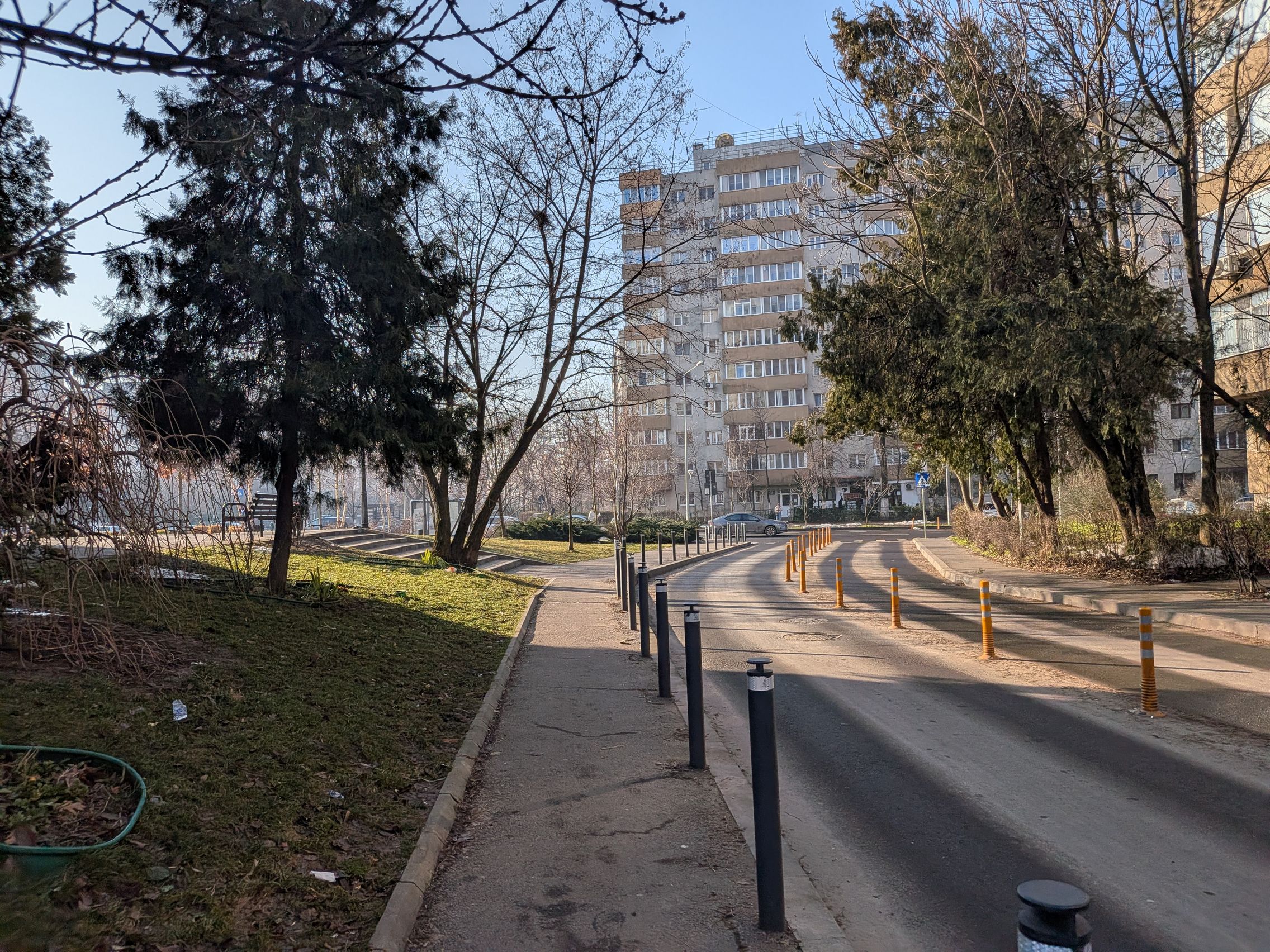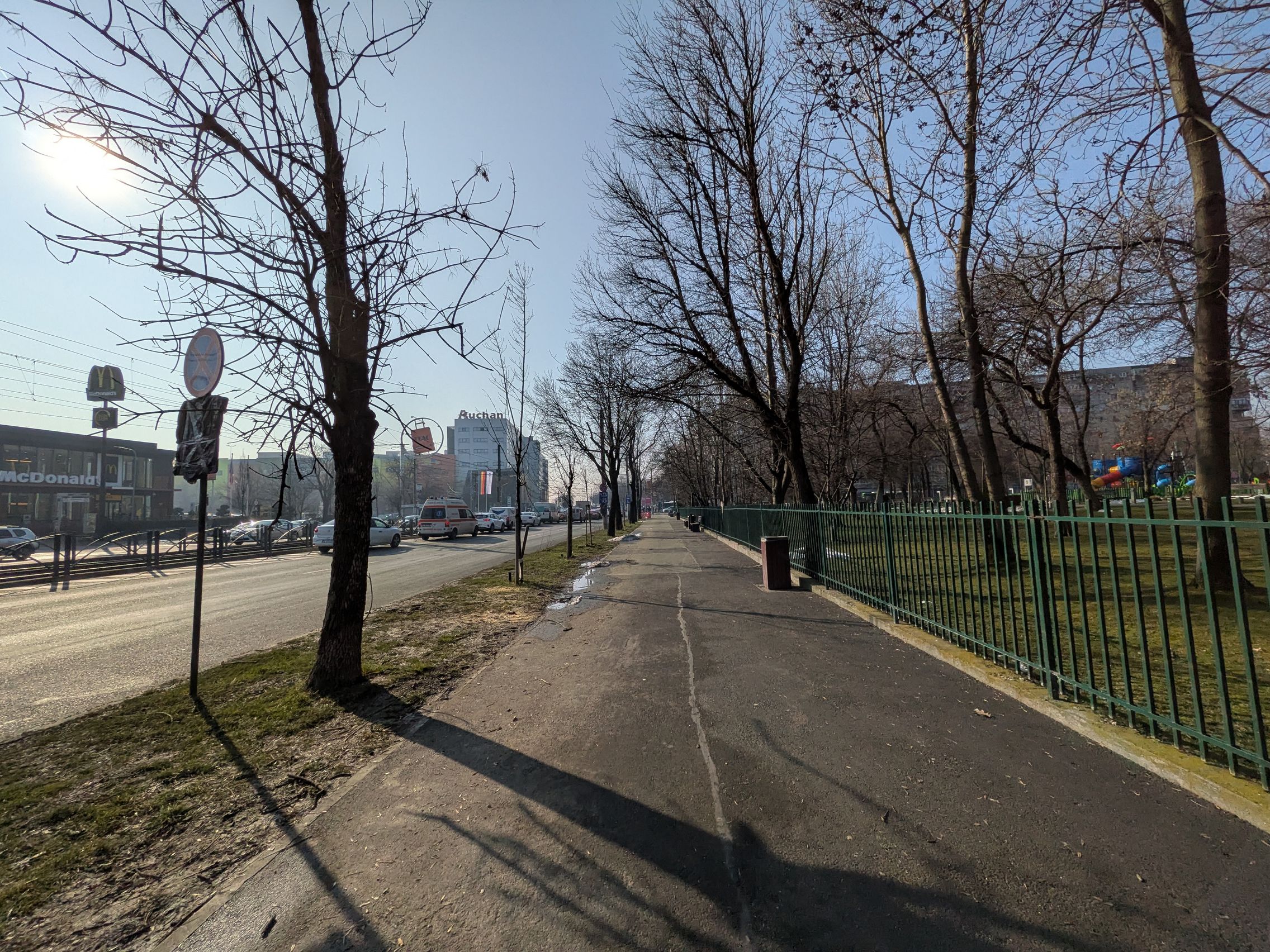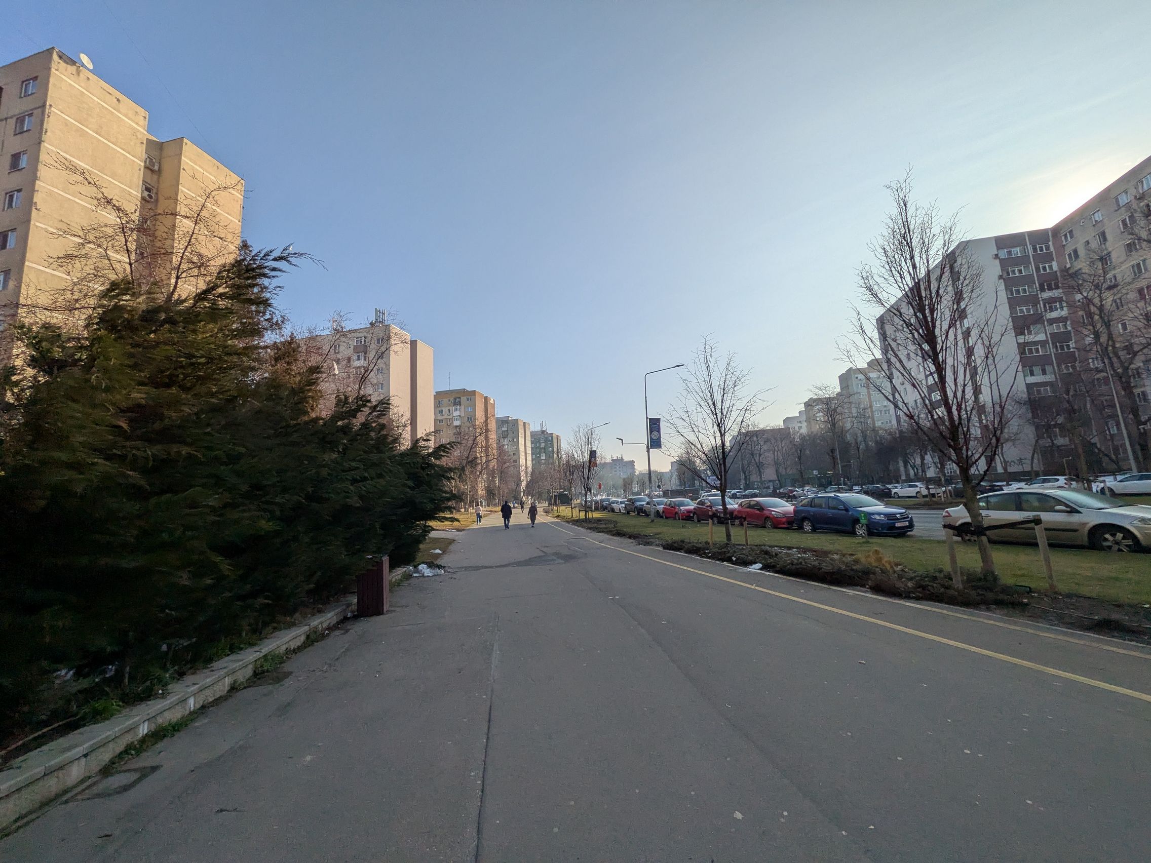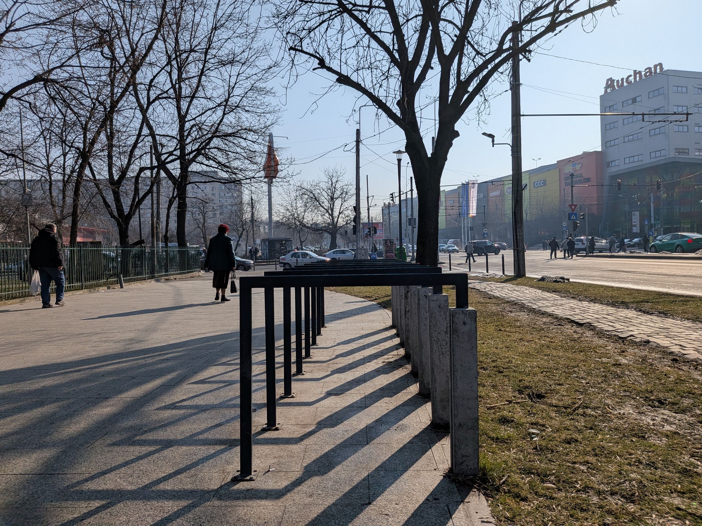 Mai spre stradă mi-a plăcut jocul umbrelor de la acei stâlpișori cu un HDR care a echilibrat corect lucrurile. Ultrawide-ul e ușor mai întunecat și deformează spre margini dat fiind unghiul atât de larg. Camera s-a descurcat apoi binișor și cu soarele în față, a redat corect roșul magazinului Vodafone, dar au mai fost și scene în care HDR-ul părea să ezite și a lăsat zone mai întunecate.
