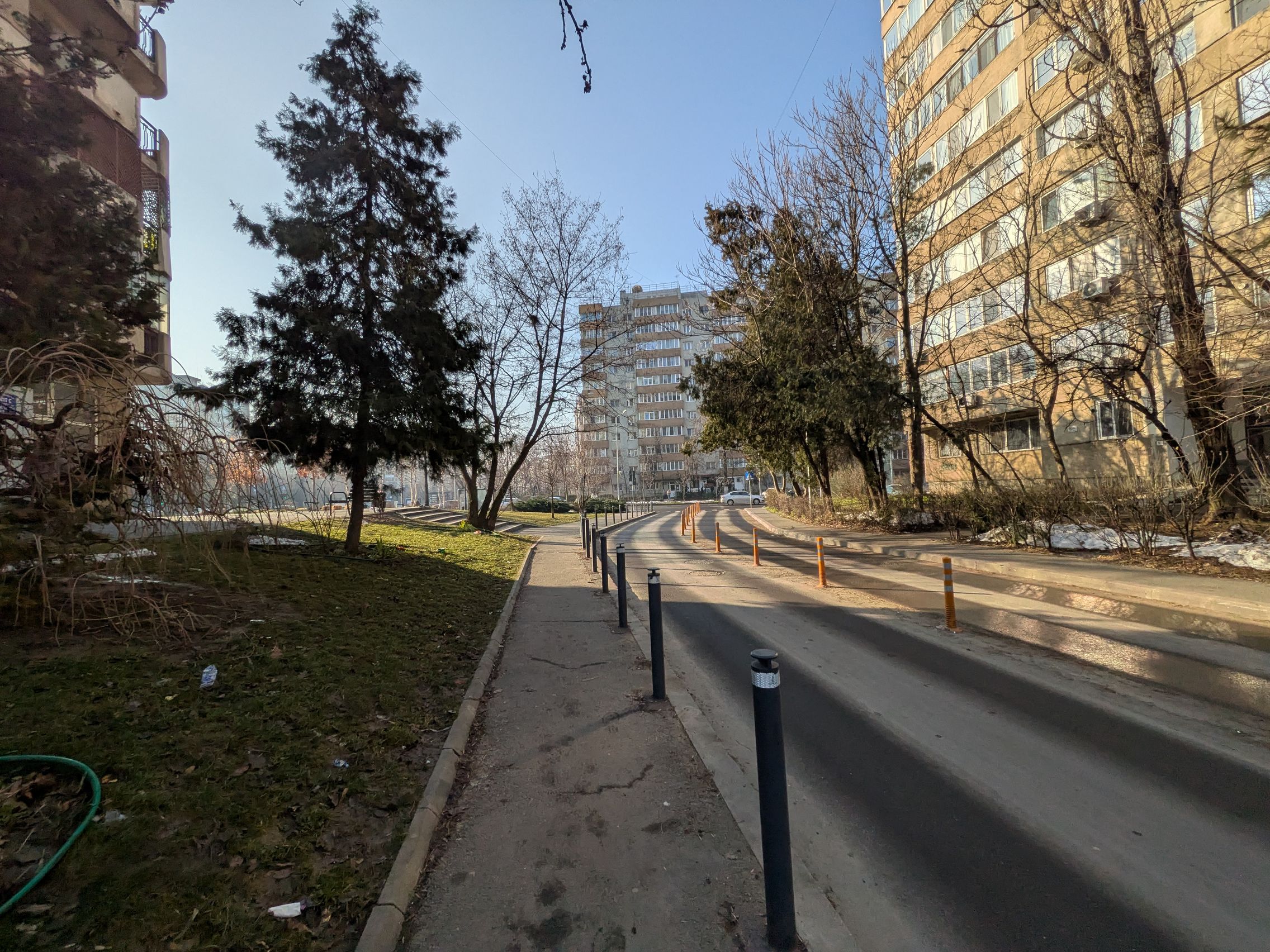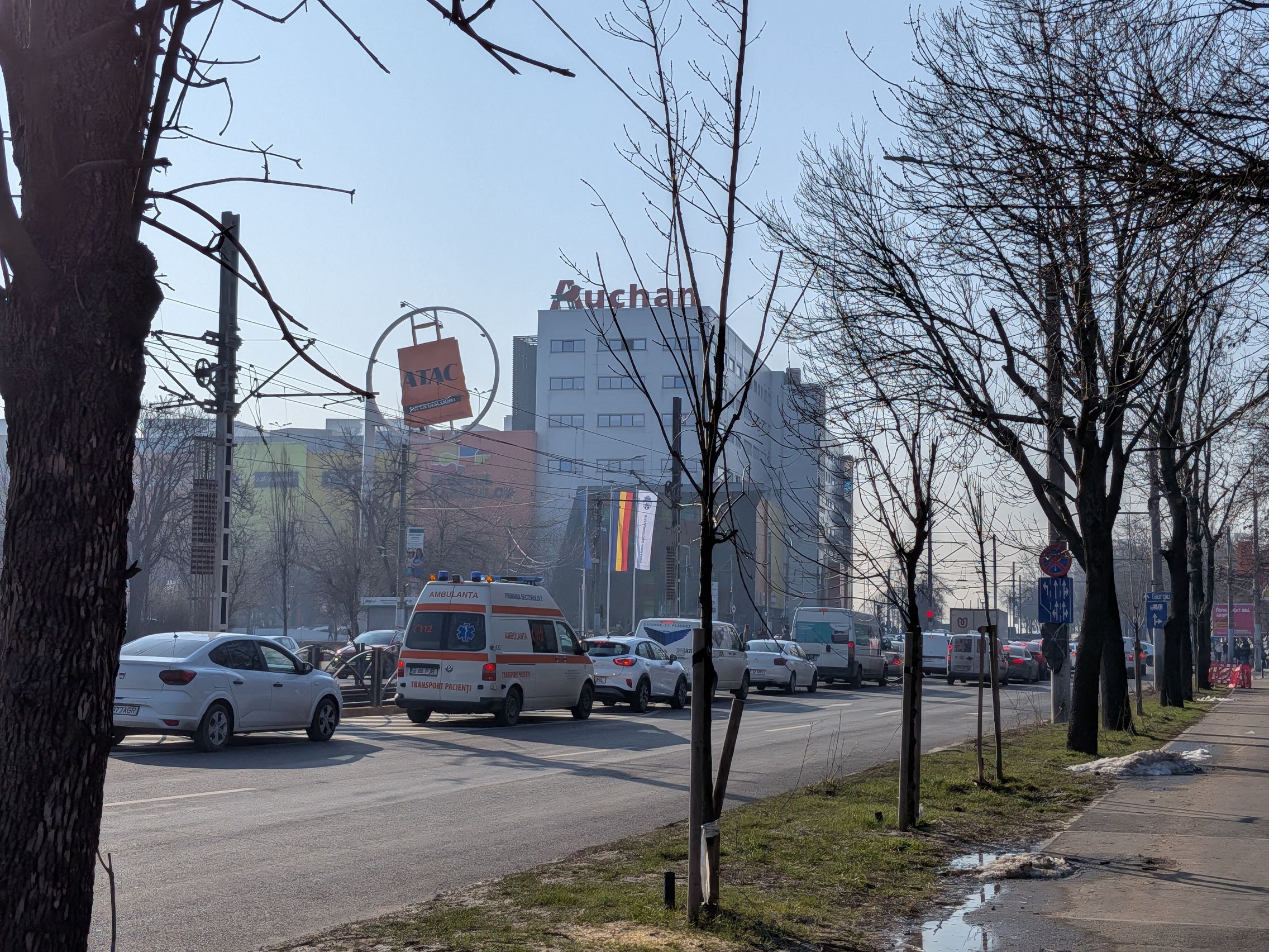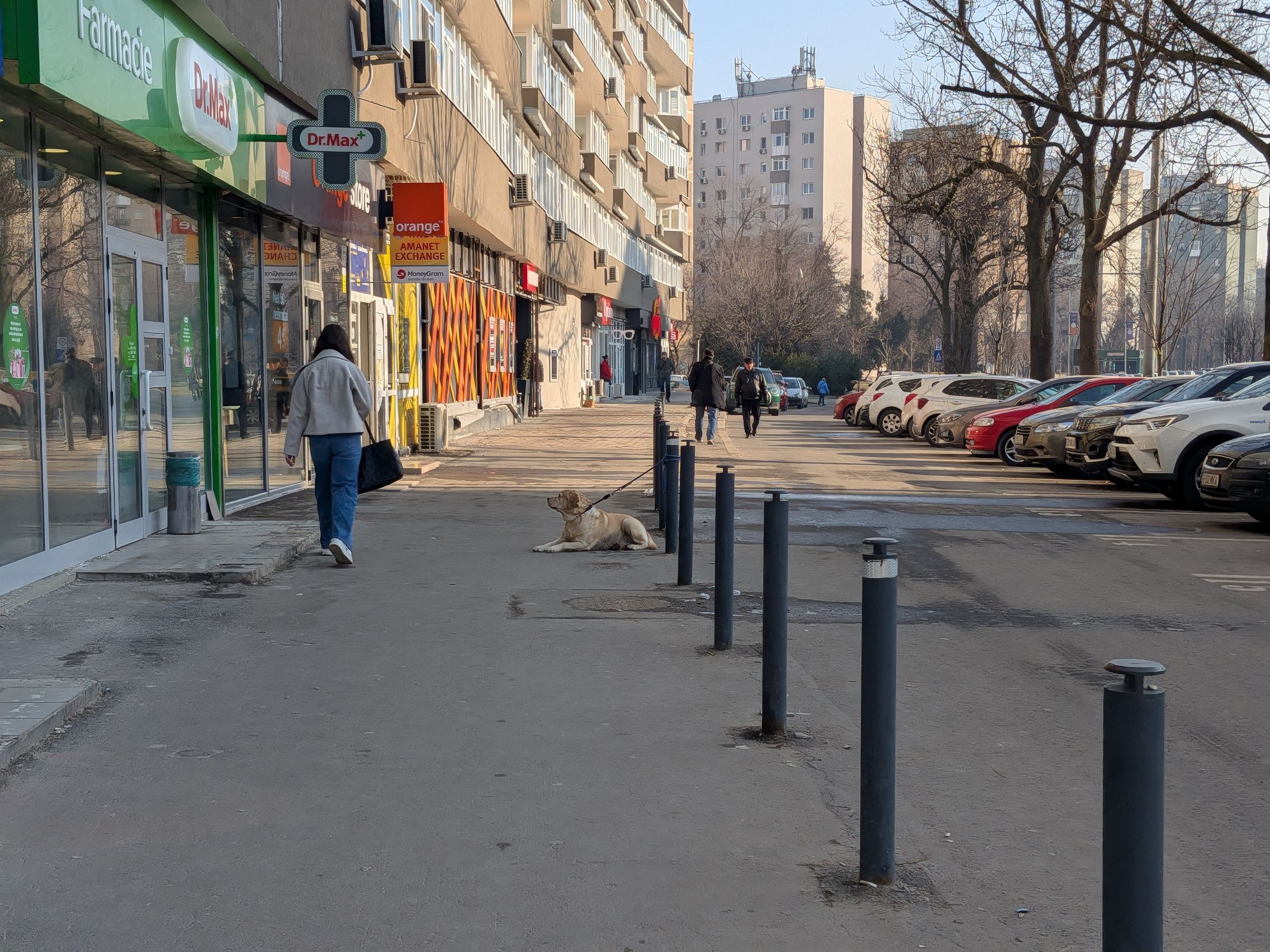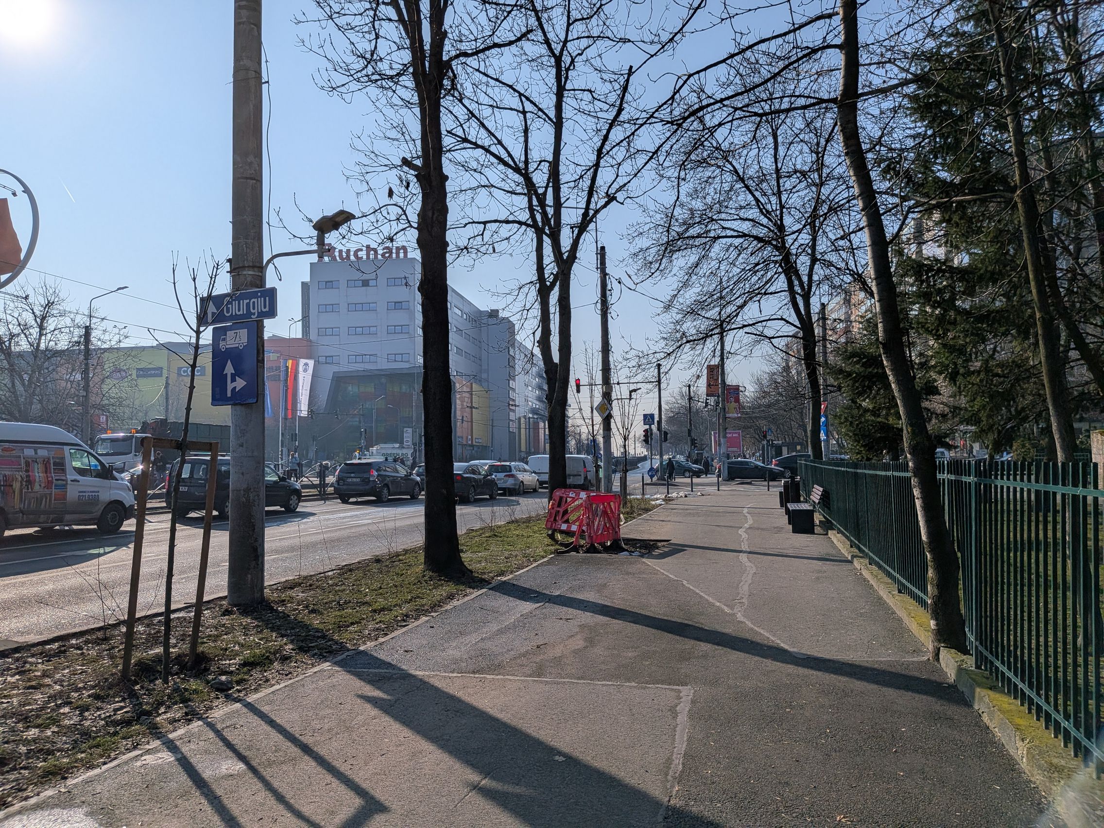 Mai spre stradă mi-a plăcut jocul umbrelor de la acei stâlpișori cu un HDR care a echilibrat corect lucrurile. Ultrawide-ul e ușor mai întunecat și deformează spre margini dat fiind unghiul atât de larg. Camera s-a descurcat apoi binișor și cu soarele în față, a redat corect roșul magazinului Vodafone, dar au mai fost și scene în care HDR-ul părea să ezite și a lăsat zone mai întunecate.