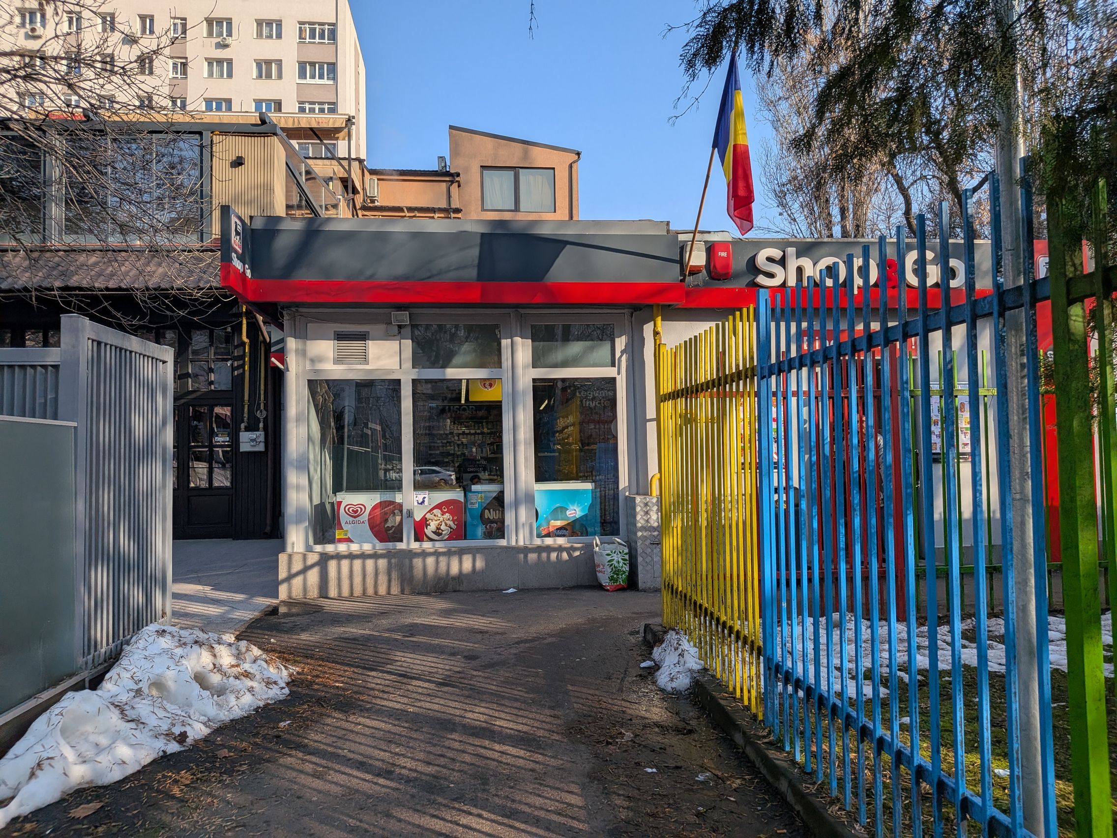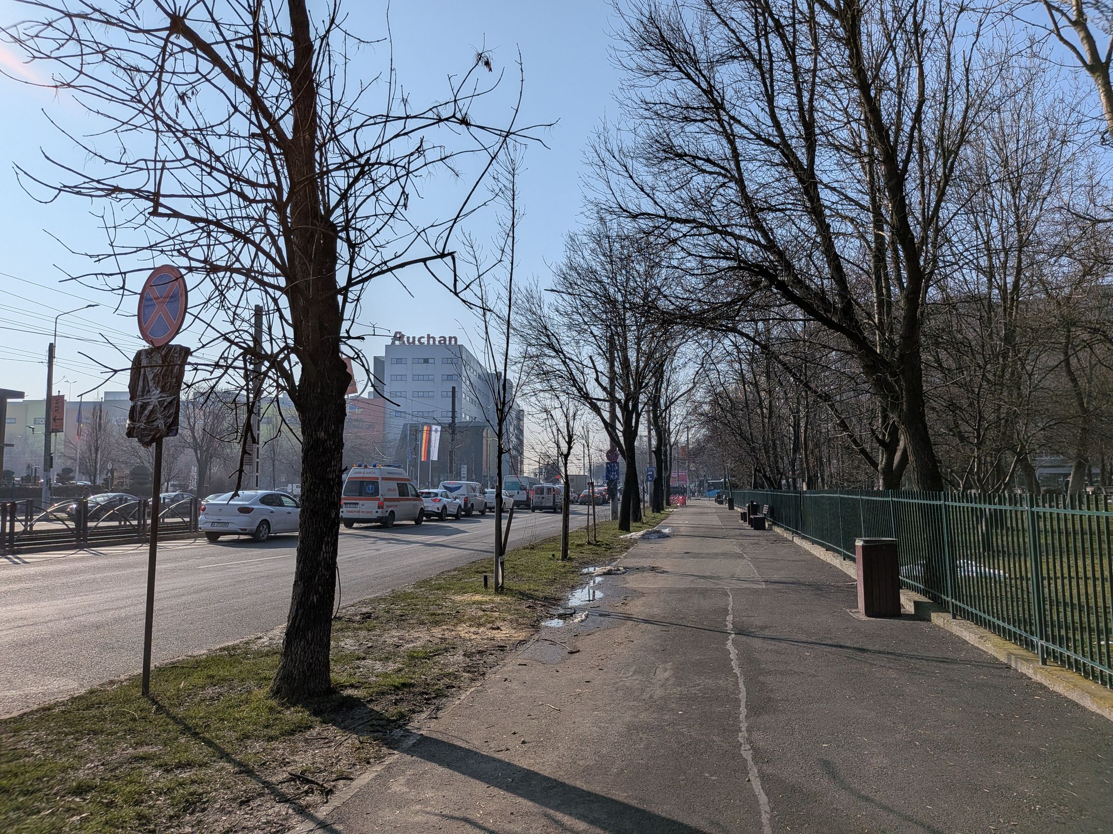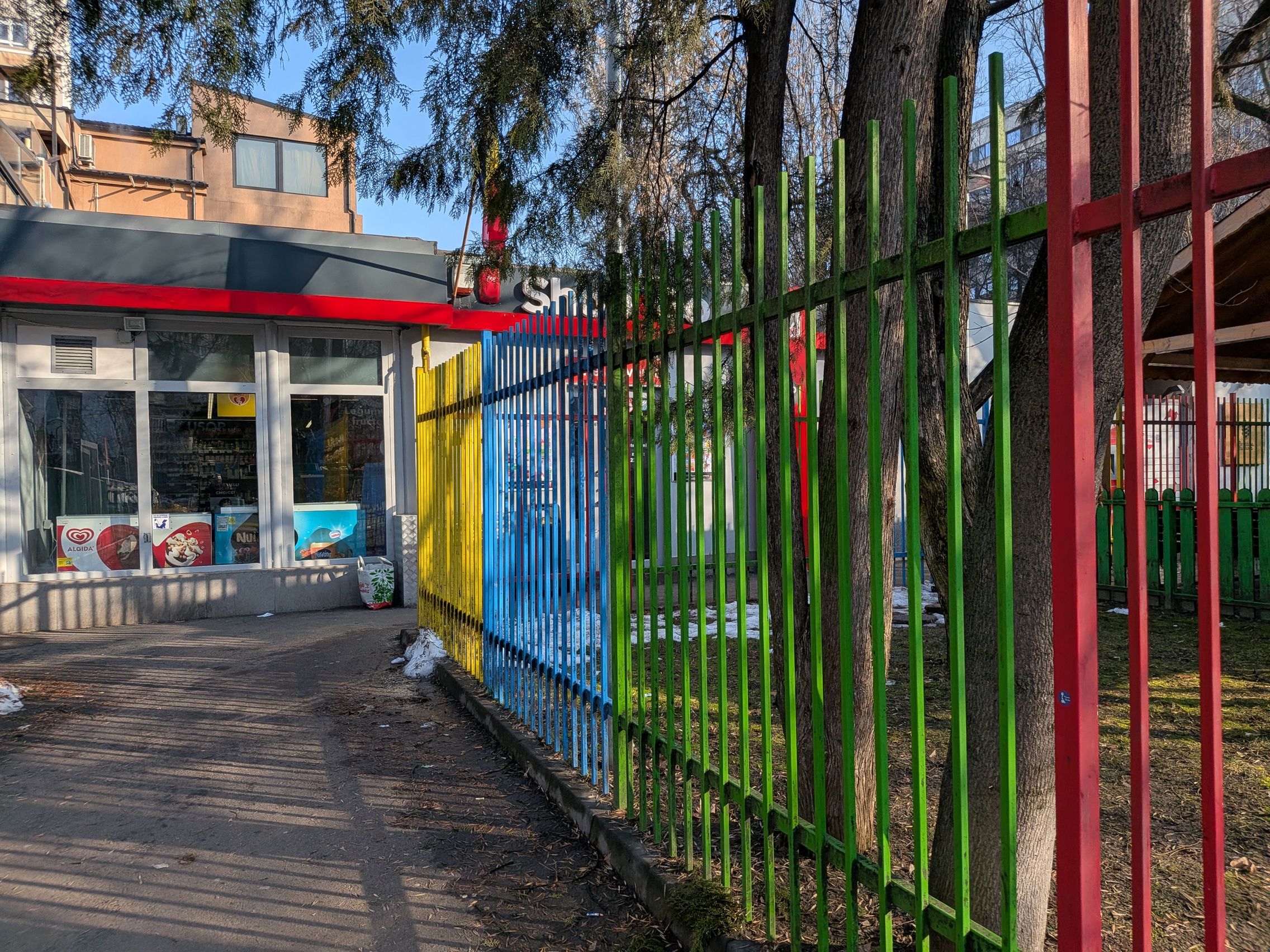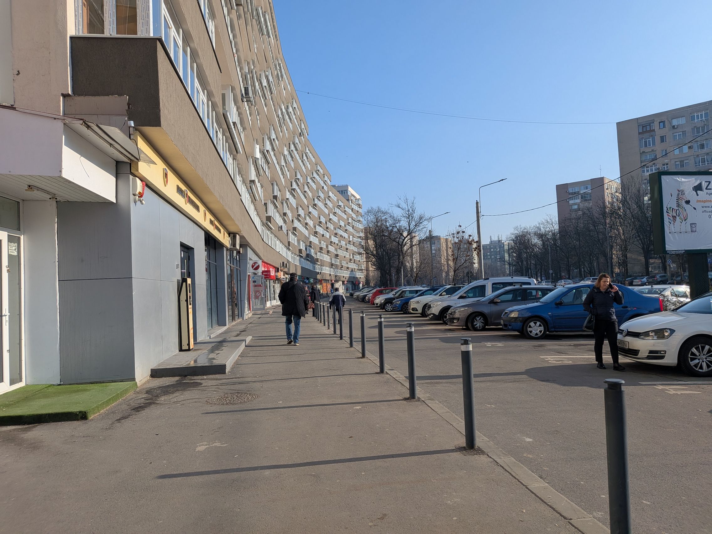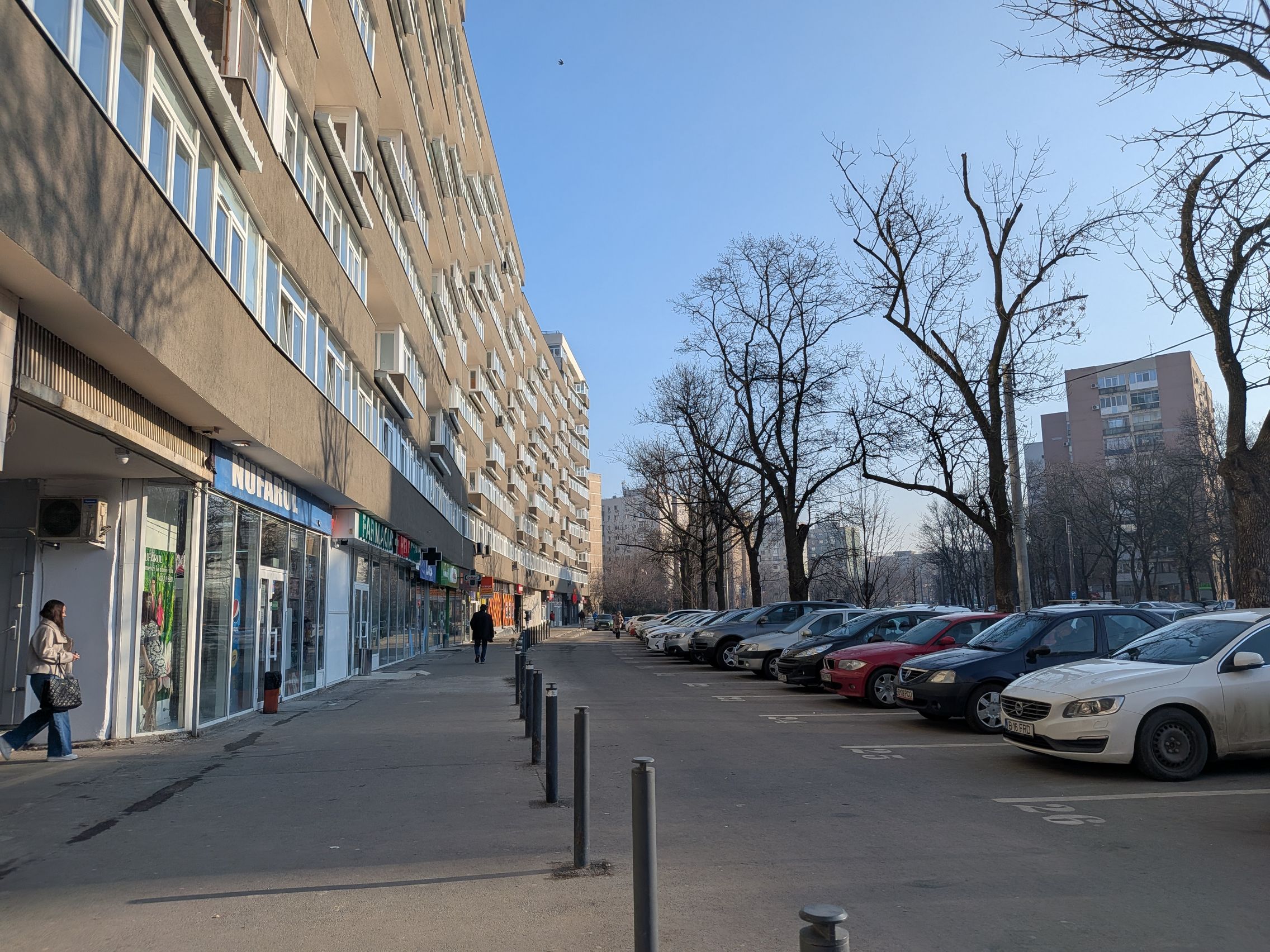 Mai spre stradă mi-a plăcut jocul umbrelor de la acei stâlpișori cu un HDR care a echilibrat corect lucrurile. Ultrawide-ul e ușor mai întunecat și deformează spre margini dat fiind unghiul atât de larg. Camera s-a descurcat apoi binișor și cu soarele în față, a redat corect roșul magazinului Vodafone, dar au mai fost și scene în care HDR-ul părea să ezite și a lăsat zone mai întunecate.