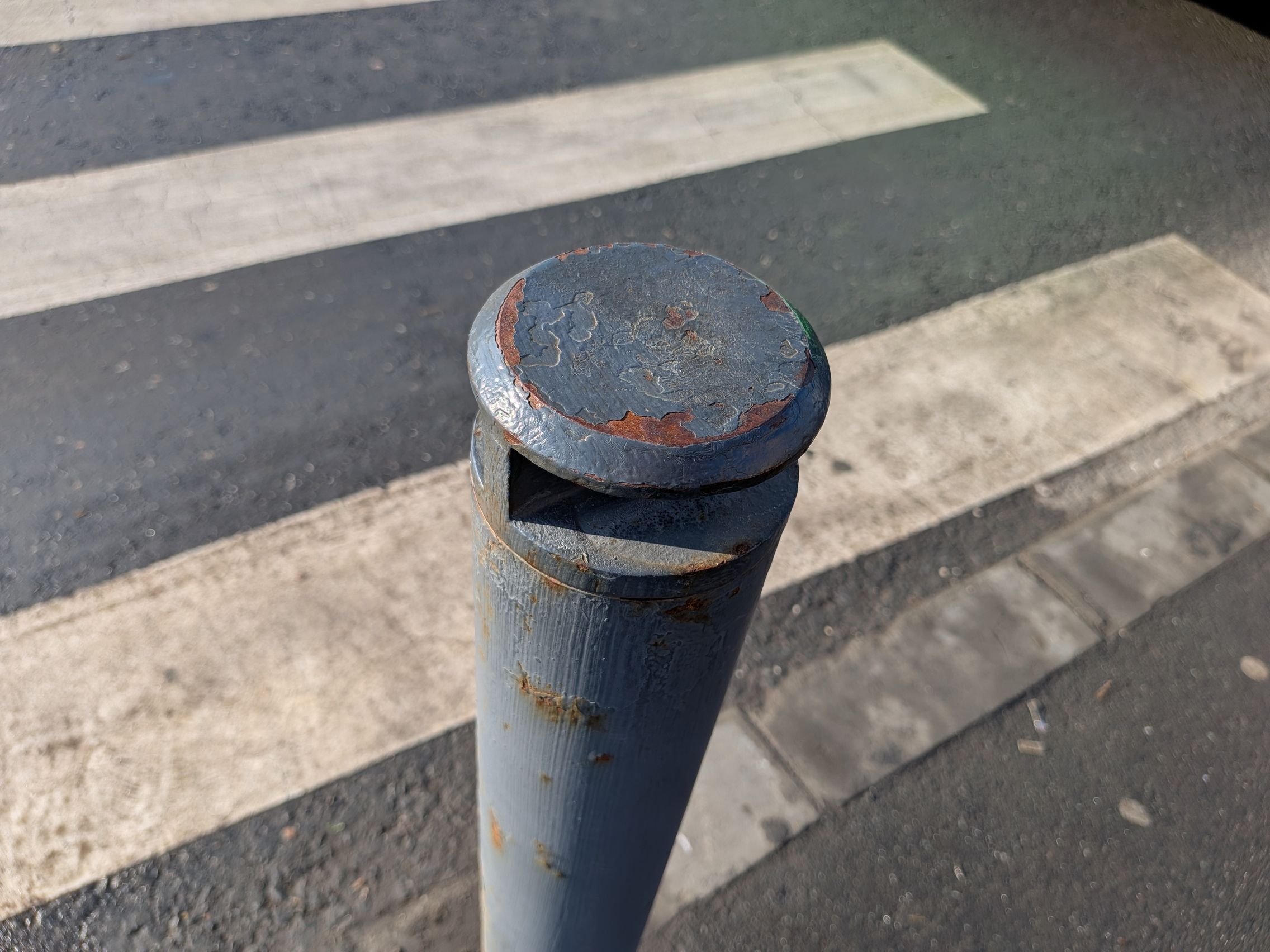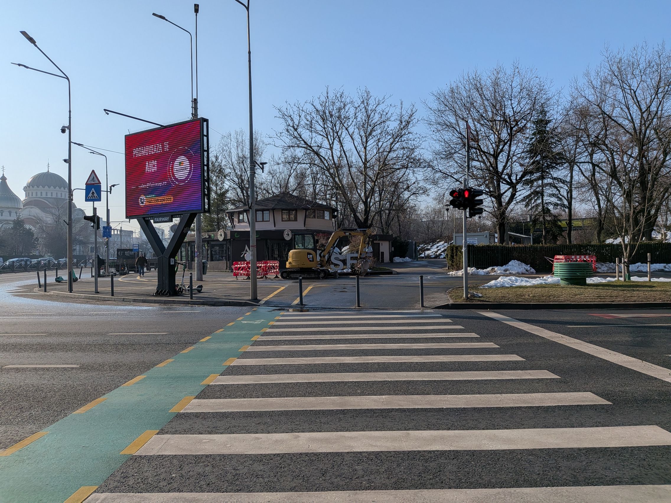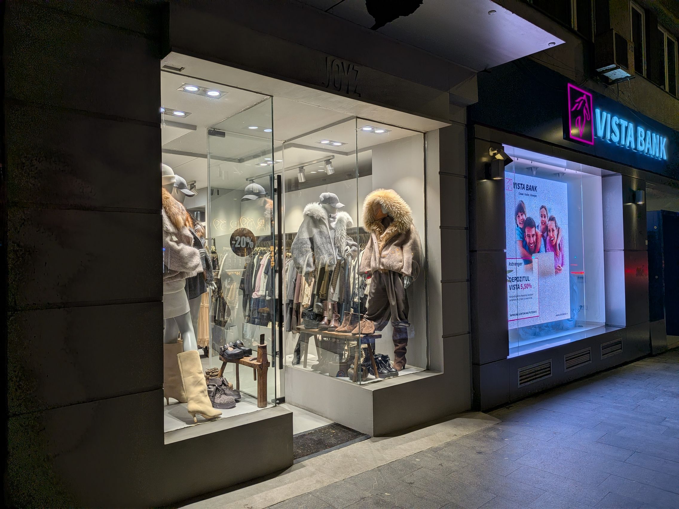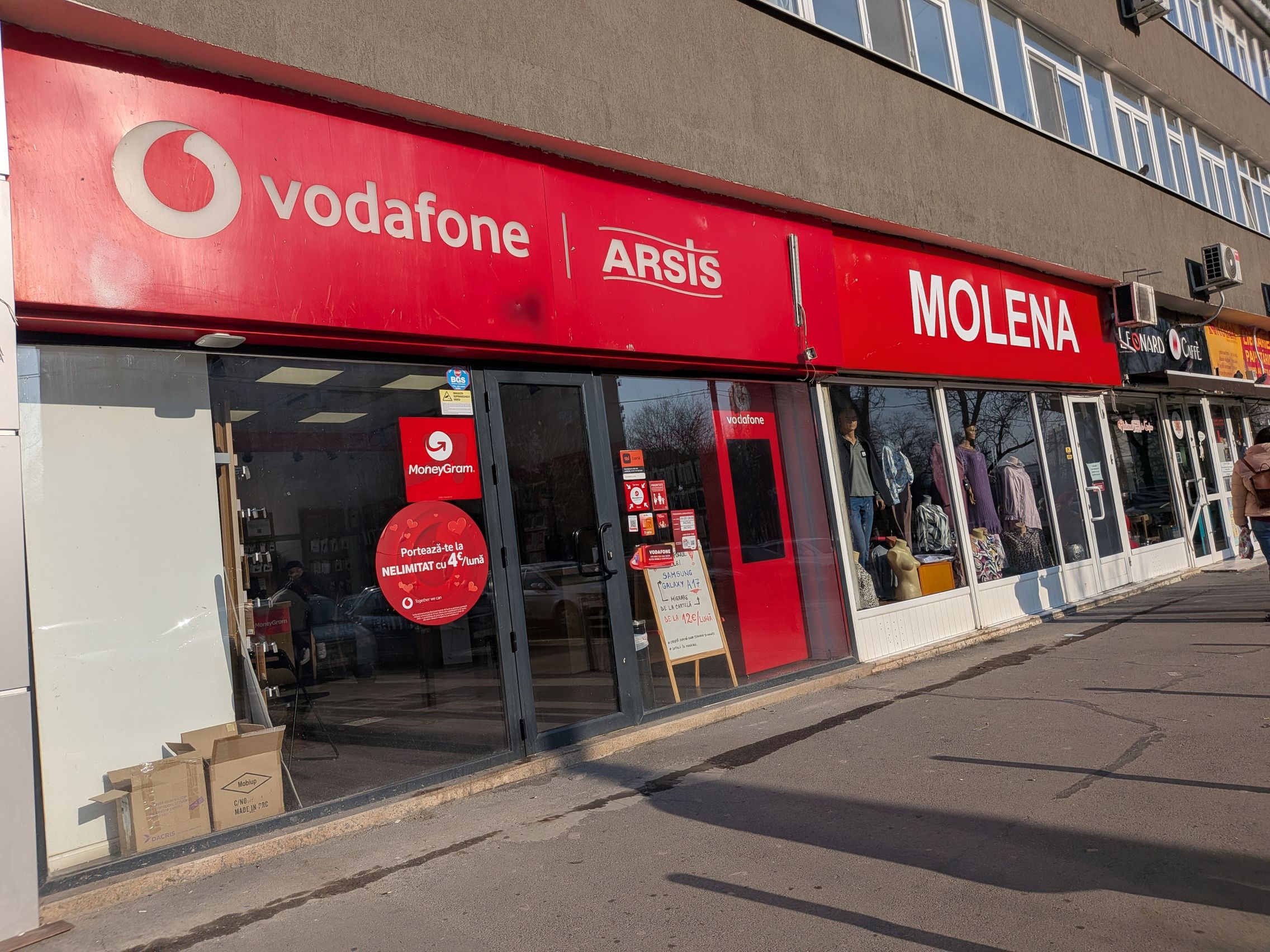 Mai spre stradă mi-a plăcut jocul umbrelor de la acei stâlpișori cu un HDR care a echilibrat corect lucrurile. Ultrawide-ul e ușor mai întunecat și deformează spre margini dat fiind unghiul atât de larg. Camera s-a descurcat apoi binișor și cu soarele în față, a redat corect roșul magazinului Vodafone, dar au mai fost și scene în care HDR-ul părea să ezite și a lăsat zone mai întunecate.