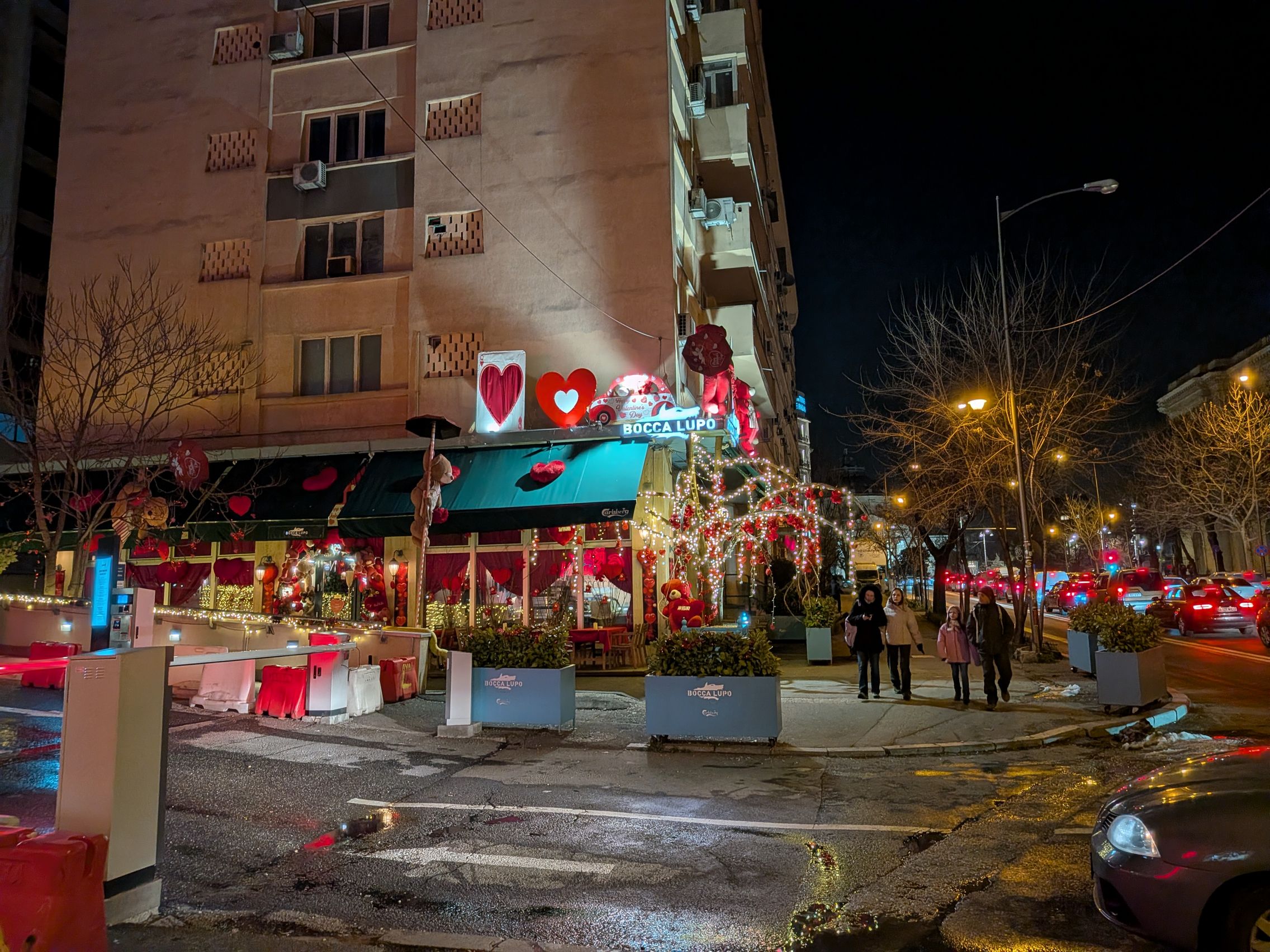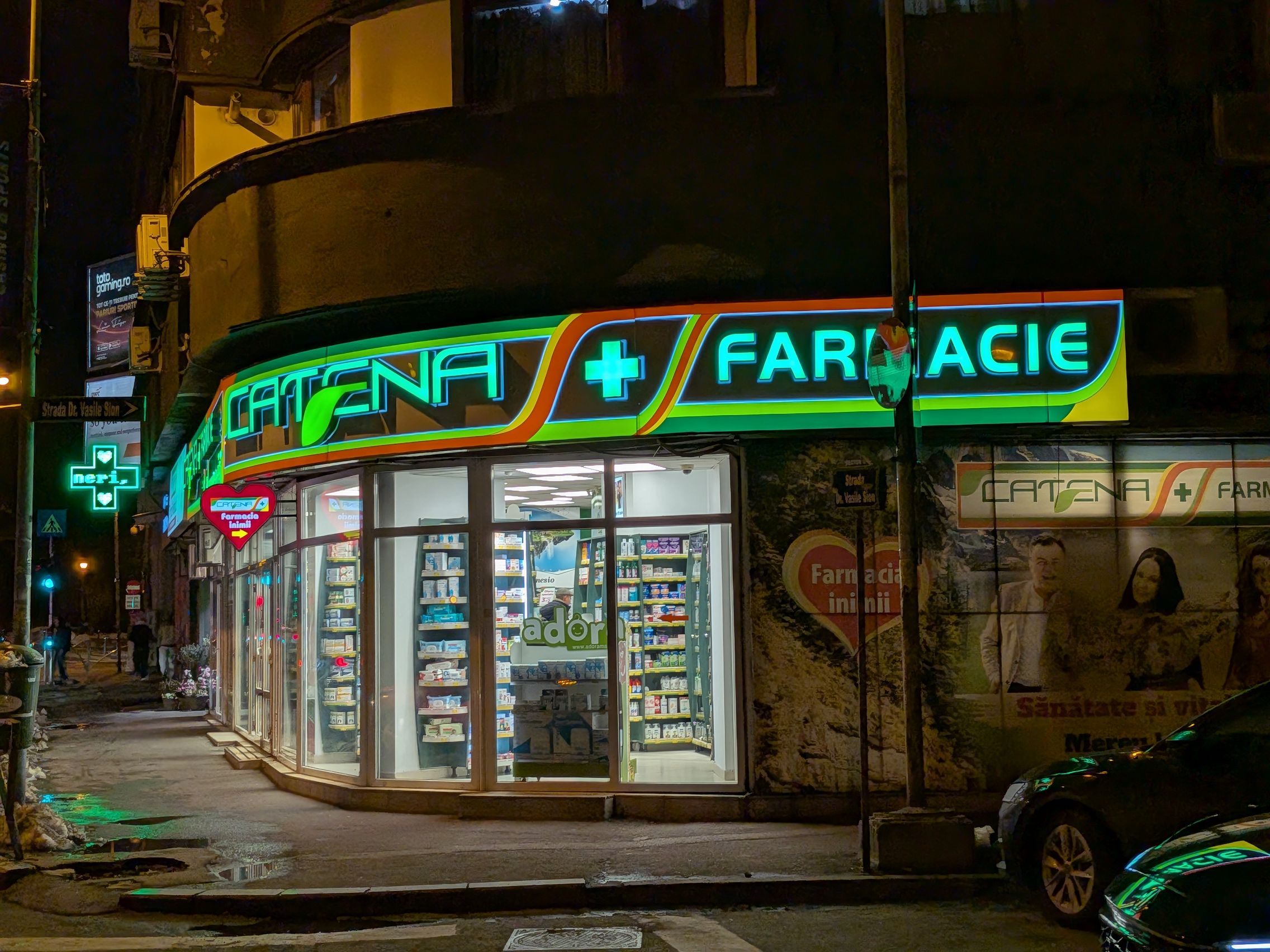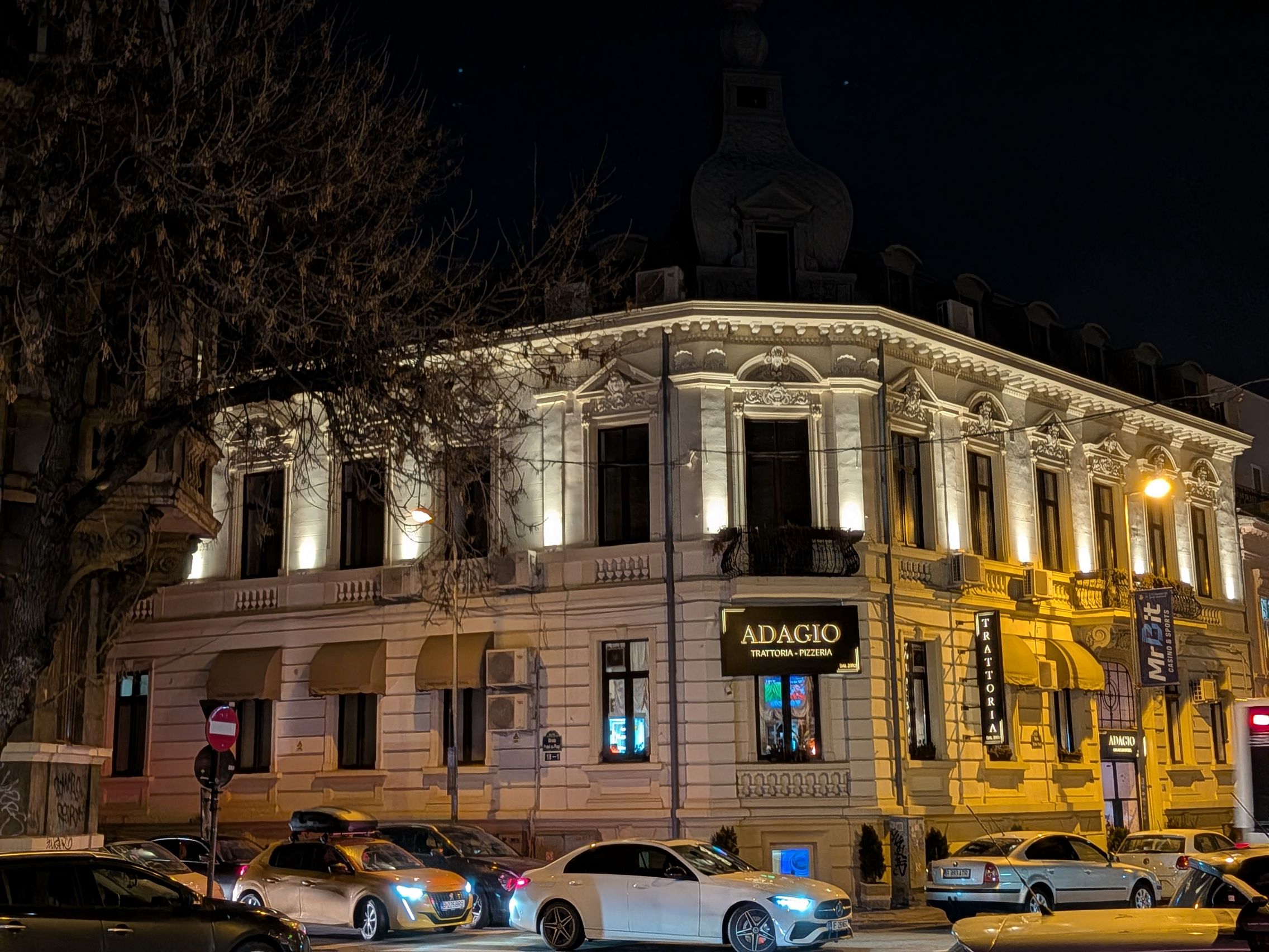 Camera și bokeh pe noapte și am încercat și pe un hidrant de pe Victoriei, reușit! Casa care găzduiește pizzeria Adagio are un iz parizian dacă nu te-ai uita la bannere-le de pariuri. Îmi place ce văd și la logo-ul farmaciei verde. Camera optimizează bine luminile puternice atunci când ești aproape, ceva probleme având cu lumini mai depărtate.