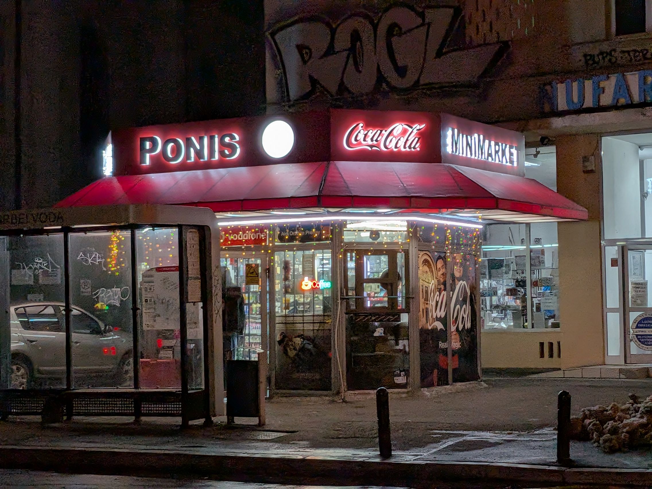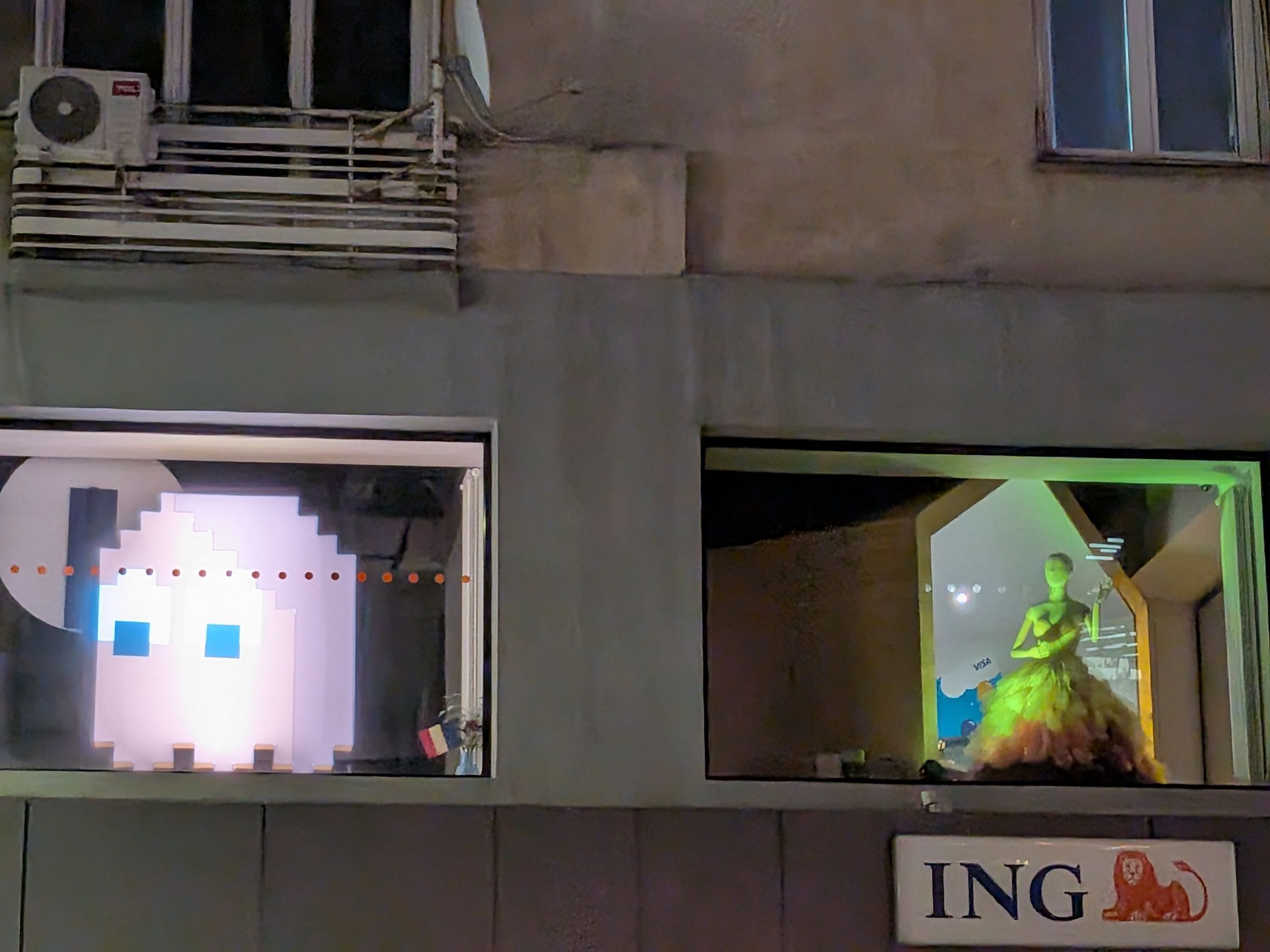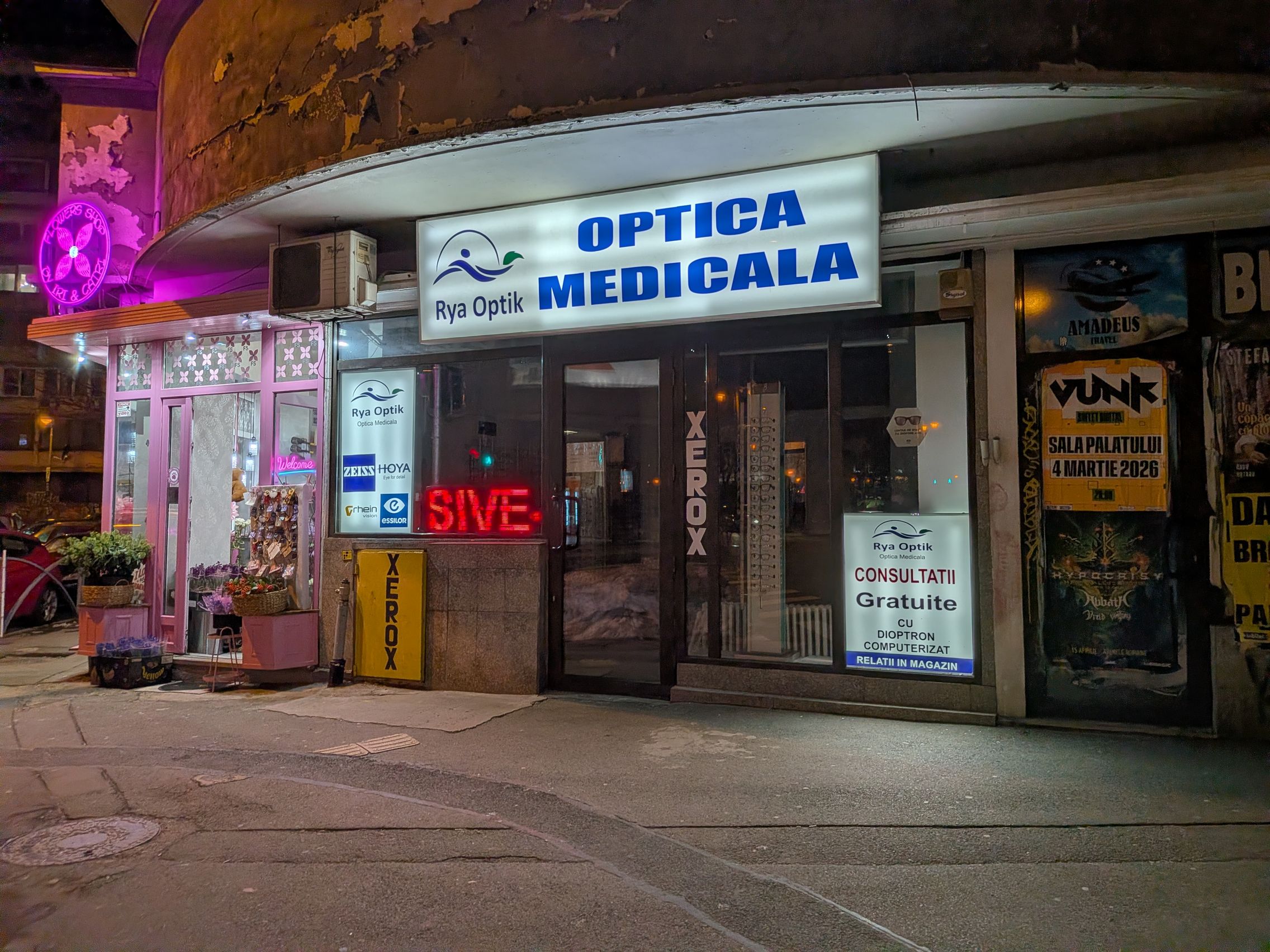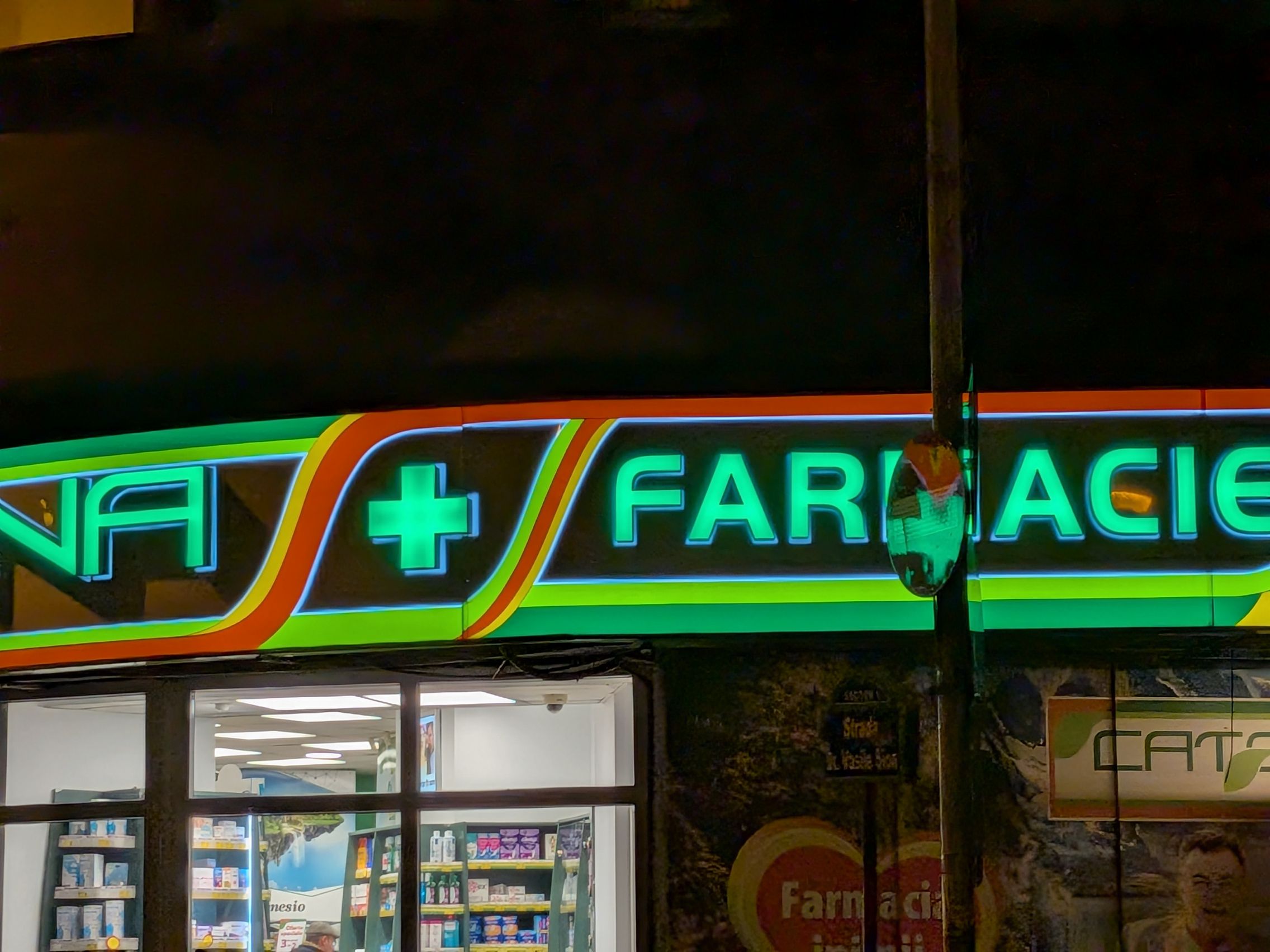 Camera și bokeh pe noapte și am încercat și pe un hidrant de pe Victoriei, reușit! Casa care găzduiește pizzeria Adagio are un iz parizian dacă nu te-ai uita la bannere-le de pariuri. Îmi place ce văd și la logo-ul farmaciei verde. Camera optimizează bine luminile puternice atunci când ești aproape, ceva probleme având cu lumini mai depărtate.