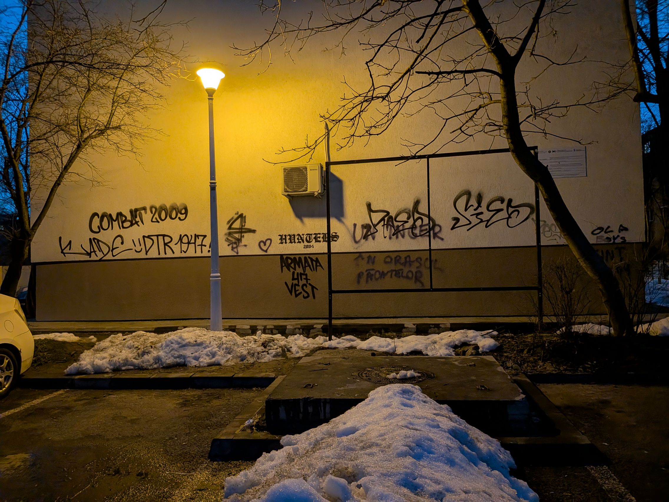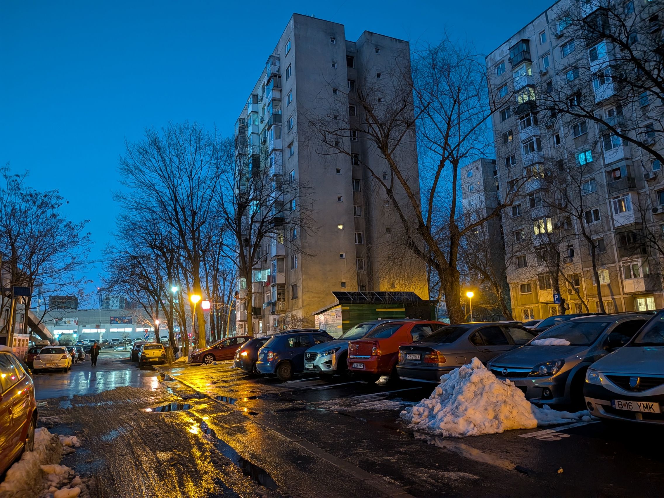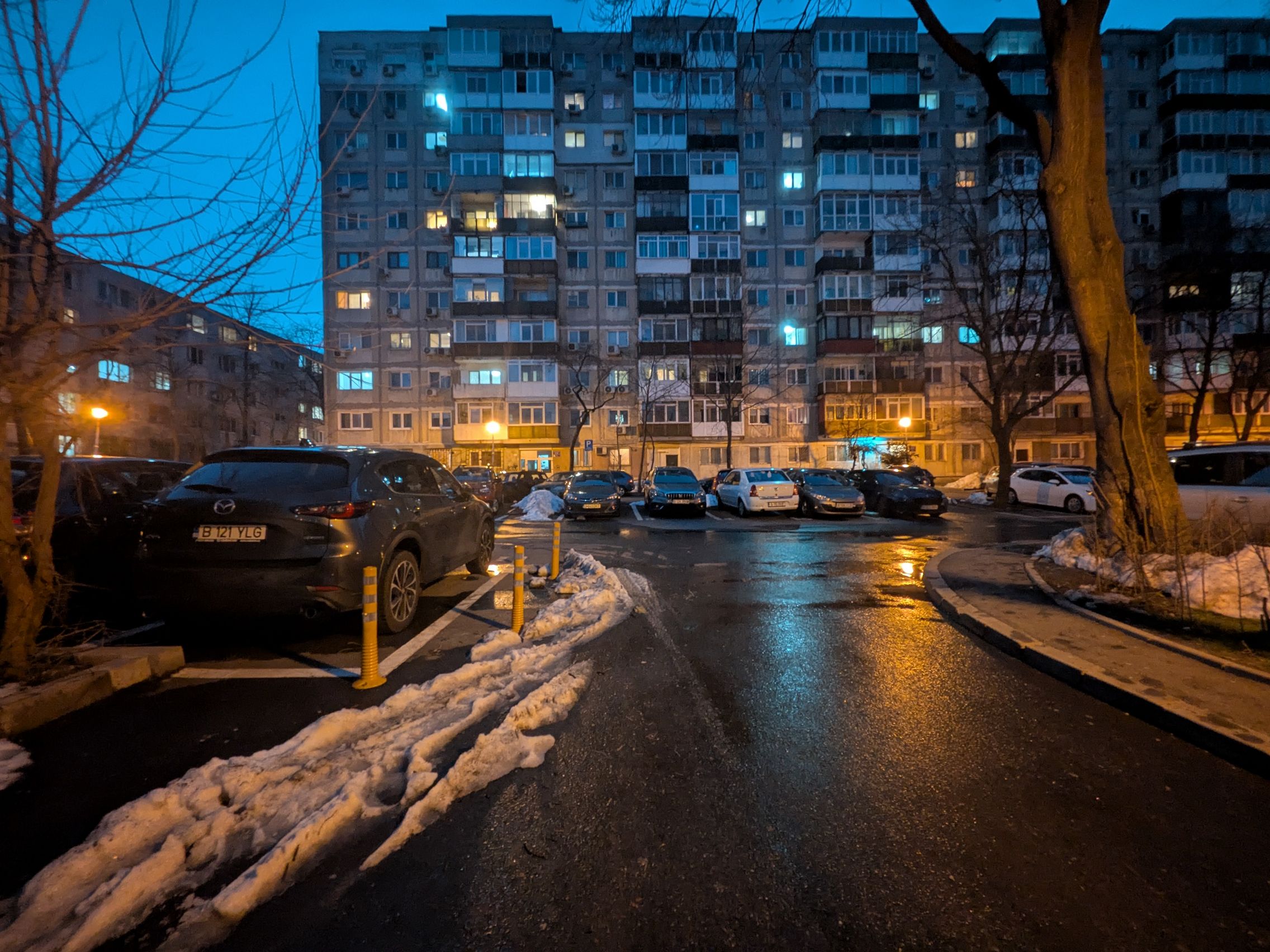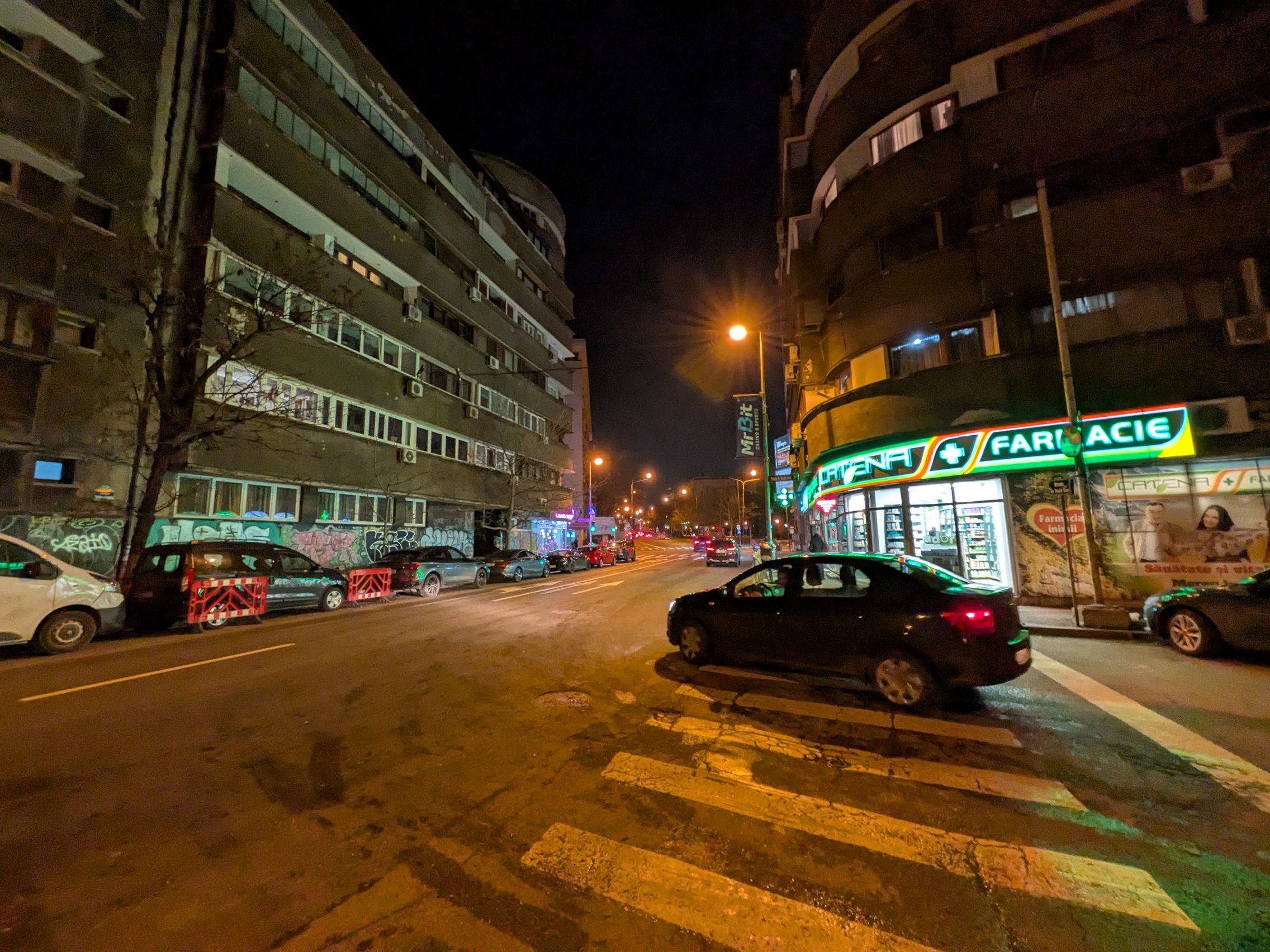 Pe timp de noapte cu Night Sight prima fotografie m-a cam uimit la modul cum a echilibrat lumina de la stâlp, unde e haloul? Sigur, sunt nuanțe de galben, dar chiar și acestea nu acoperă întreg cadrul. Neașteptat! În continuarea plimbării nocturne spre înserat mi-au plăcut cum se vedeau în zare aceste lumini de la stâlpi, asfaltul lucios și reflexiile din mașini. Nici ultrawide-ul nu a fost deloc rău la prima încercare printre străduțe.