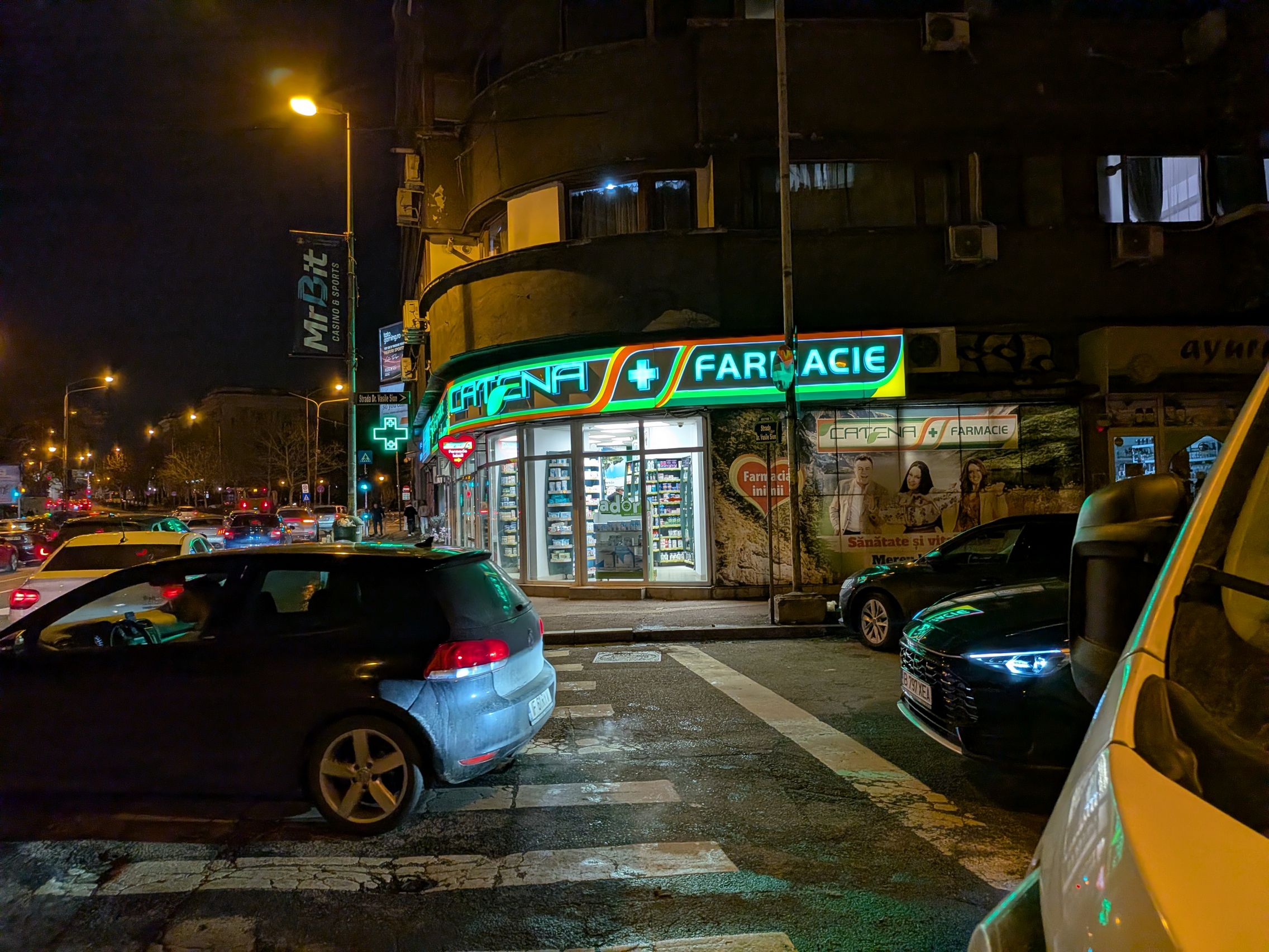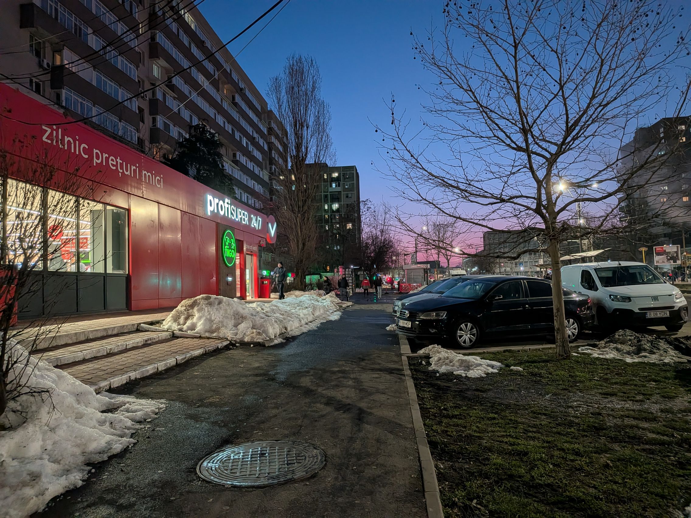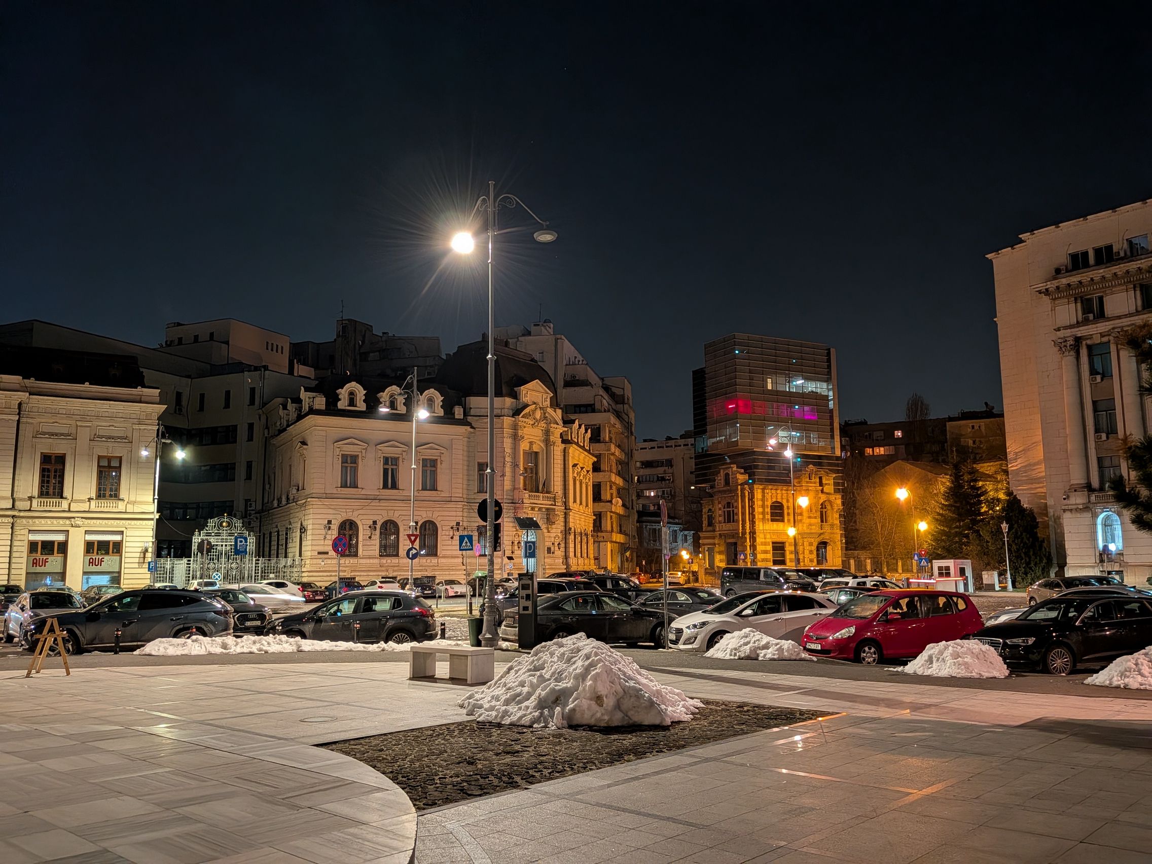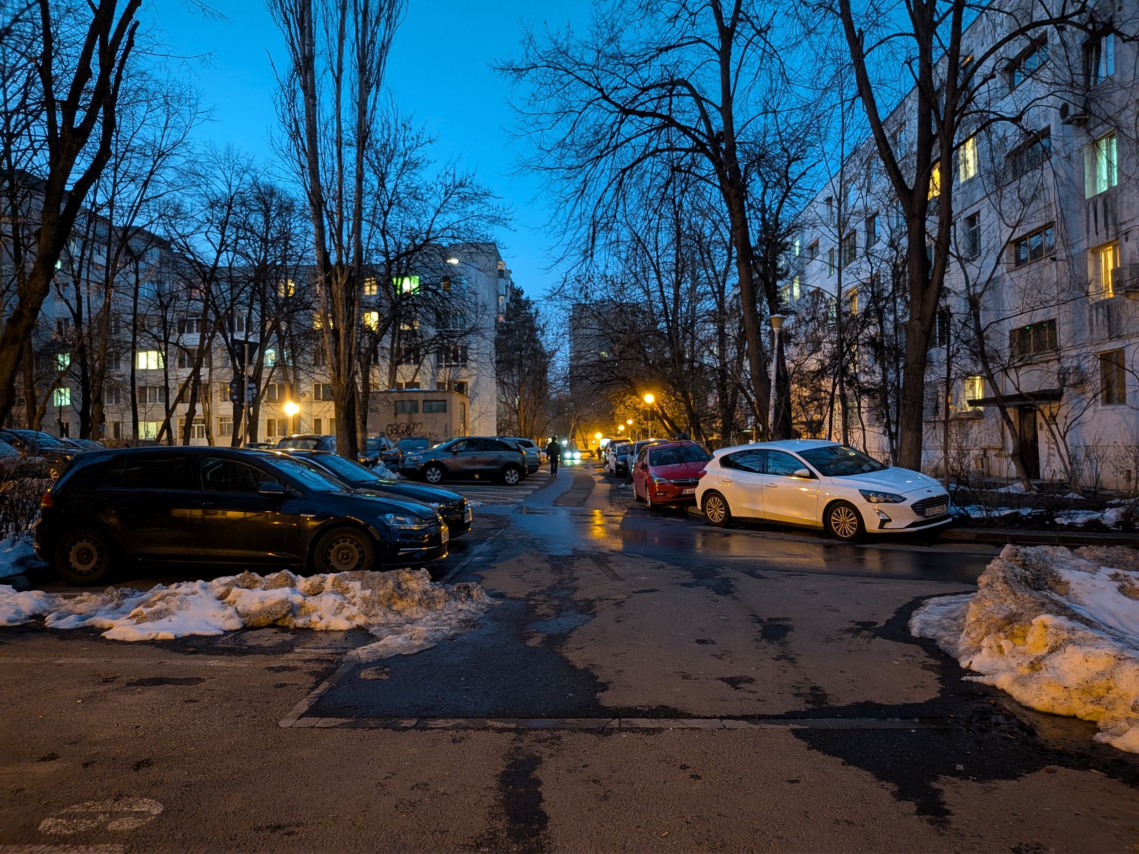 Pe timp de noapte cu Night Sight prima fotografie m-a cam uimit la modul cum a echilibrat lumina de la stâlp, unde e haloul? Sigur, sunt nuanțe de galben, dar chiar și acestea nu acoperă întreg cadrul. Neașteptat! În continuarea plimbării nocturne spre înserat mi-au plăcut cum se vedeau în zare aceste lumini de la stâlpi, asfaltul lucios și reflexiile din mașini. Nici ultrawide-ul nu a fost deloc rău la prima încercare printre străduțe.
