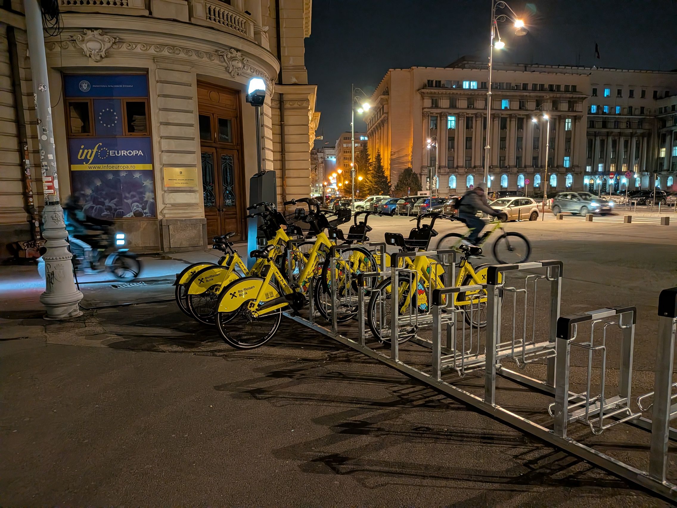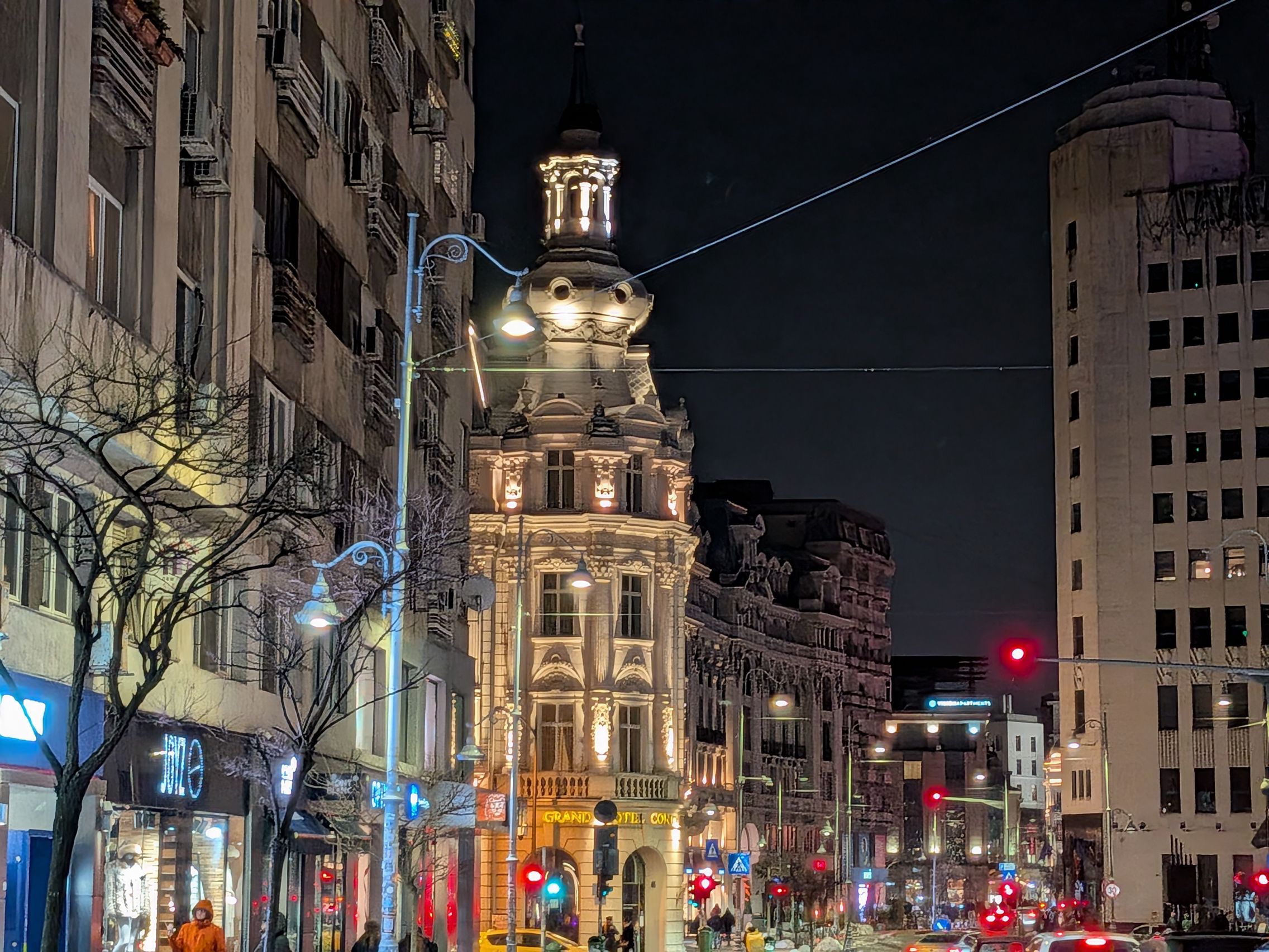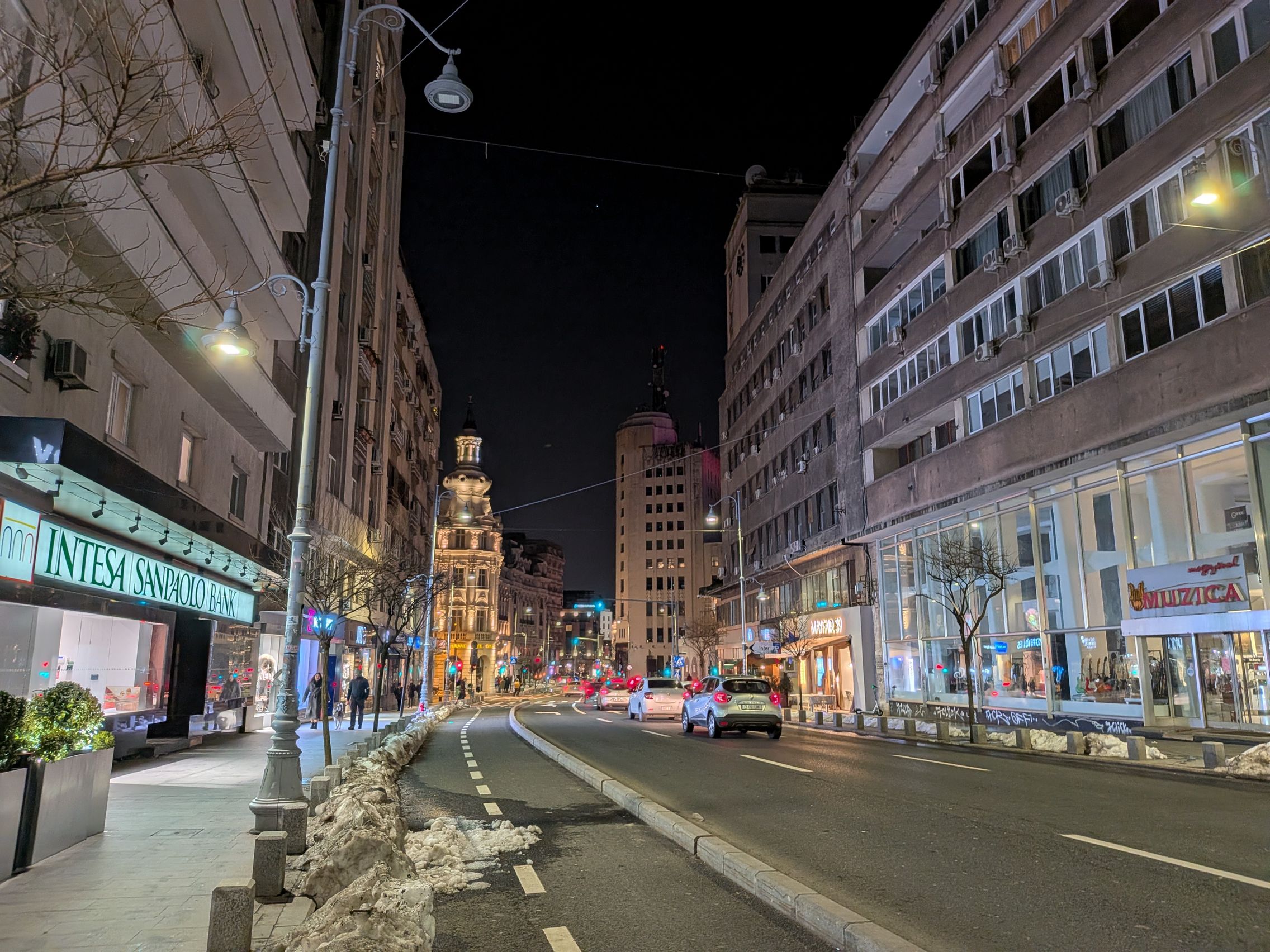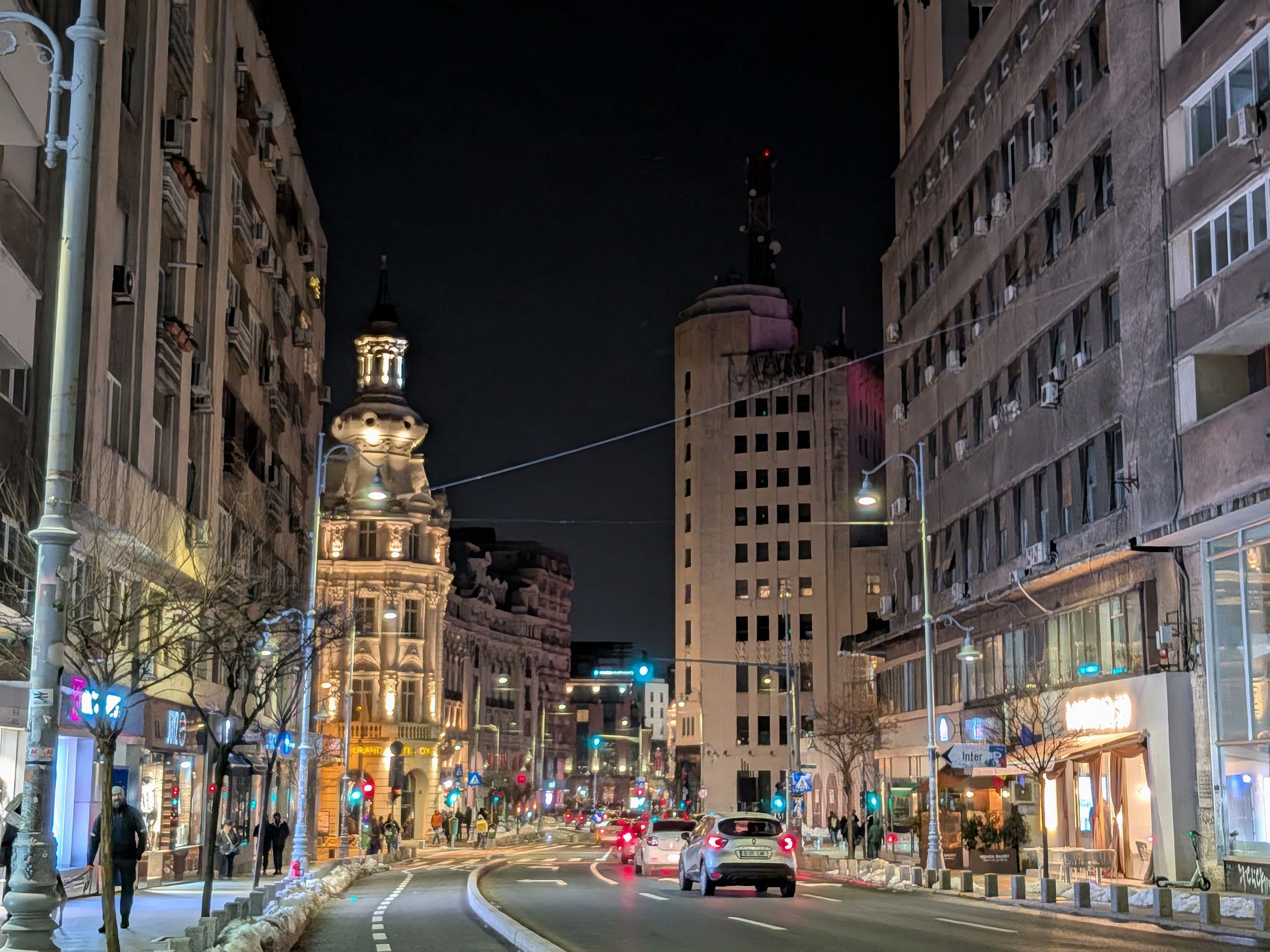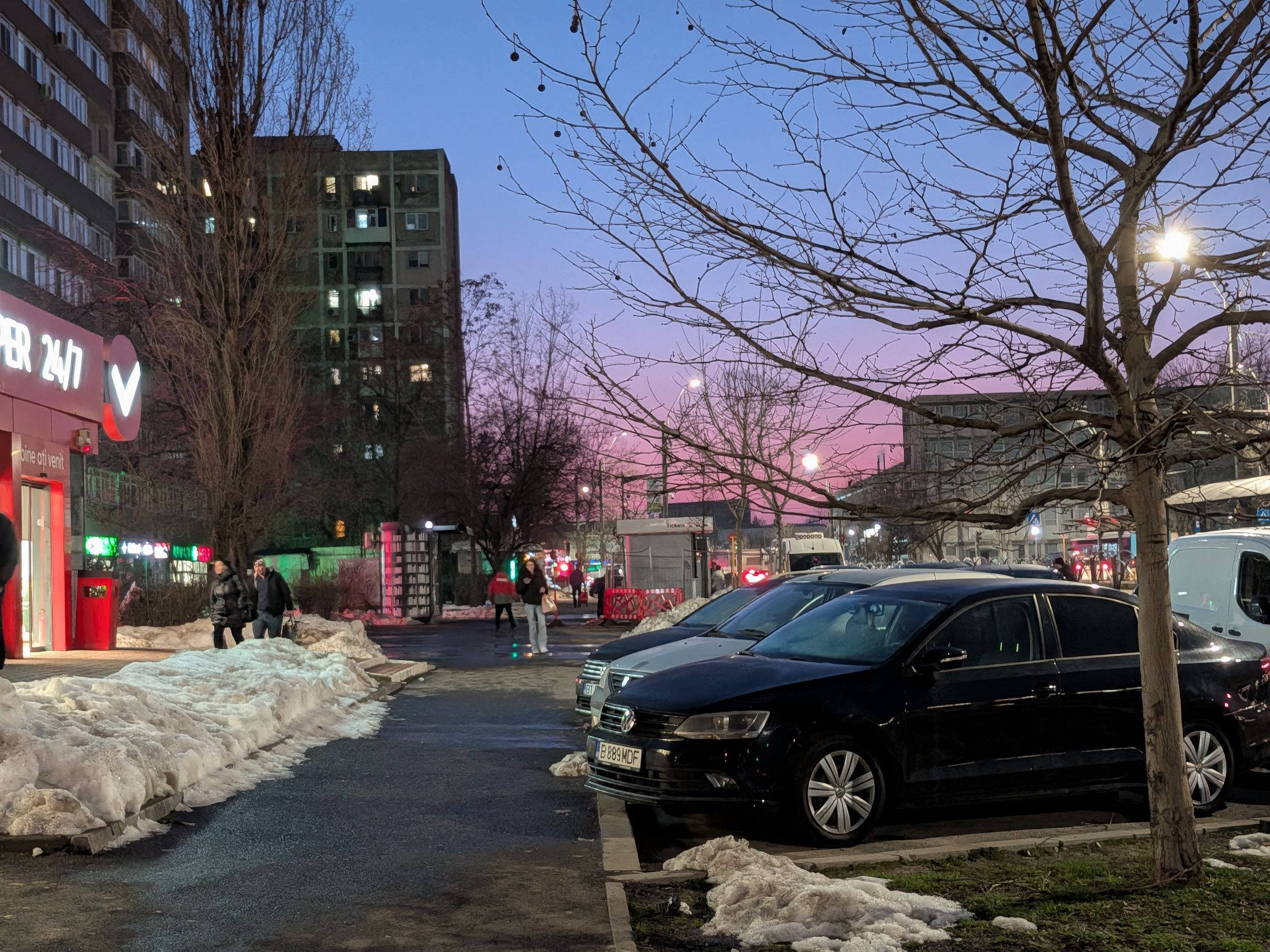 Pe timp de noapte cu Night Sight prima fotografie m-a cam uimit la modul cum a echilibrat lumina de la stâlp, unde e haloul? Sigur, sunt nuanțe de galben, dar chiar și acestea nu acoperă întreg cadrul. Neașteptat! În continuarea plimbării nocturne spre înserat mi-au plăcut cum se vedeau în zare aceste lumini de la stâlpi, asfaltul lucios și reflexiile din mașini. Nici ultrawide-ul nu a fost deloc rău la prima încercare printre străduțe.