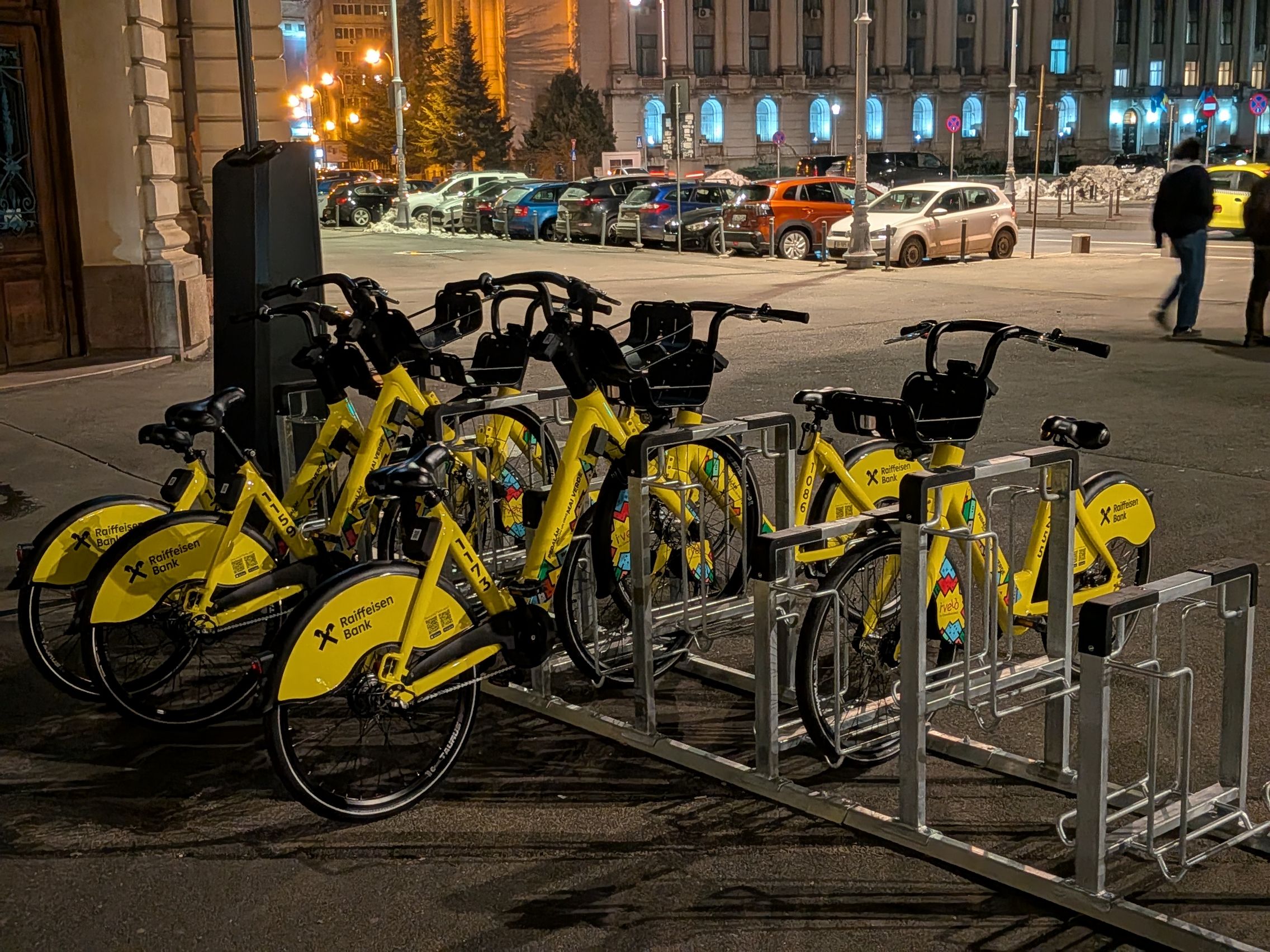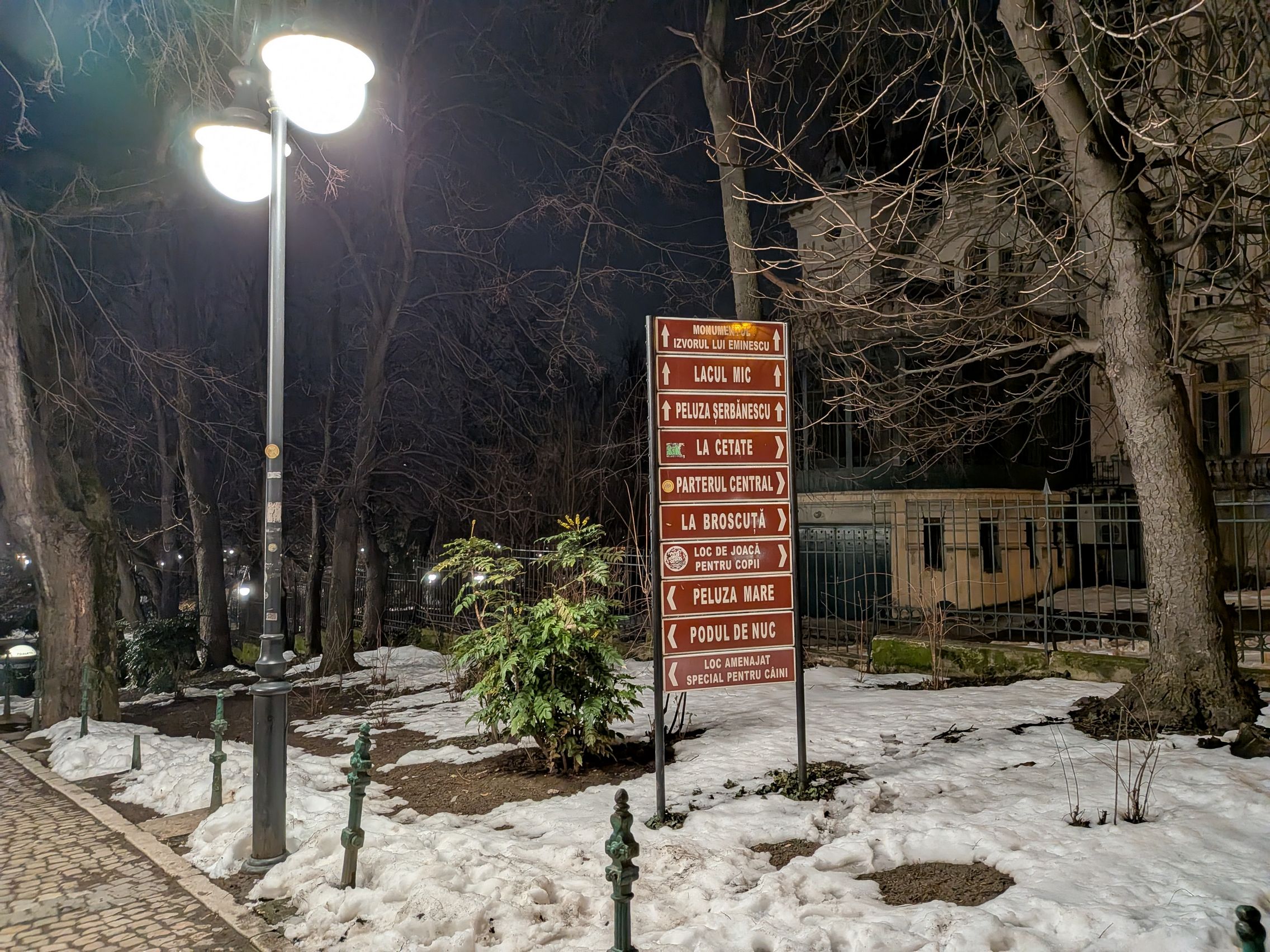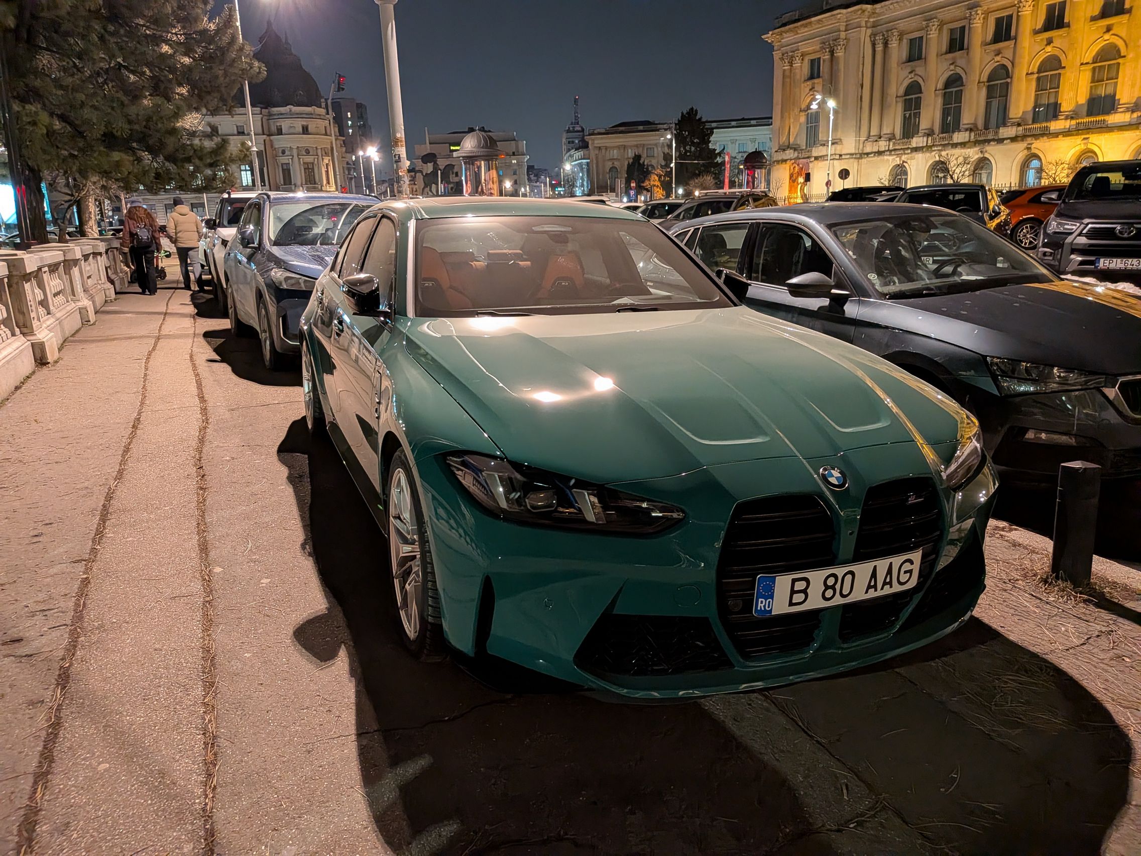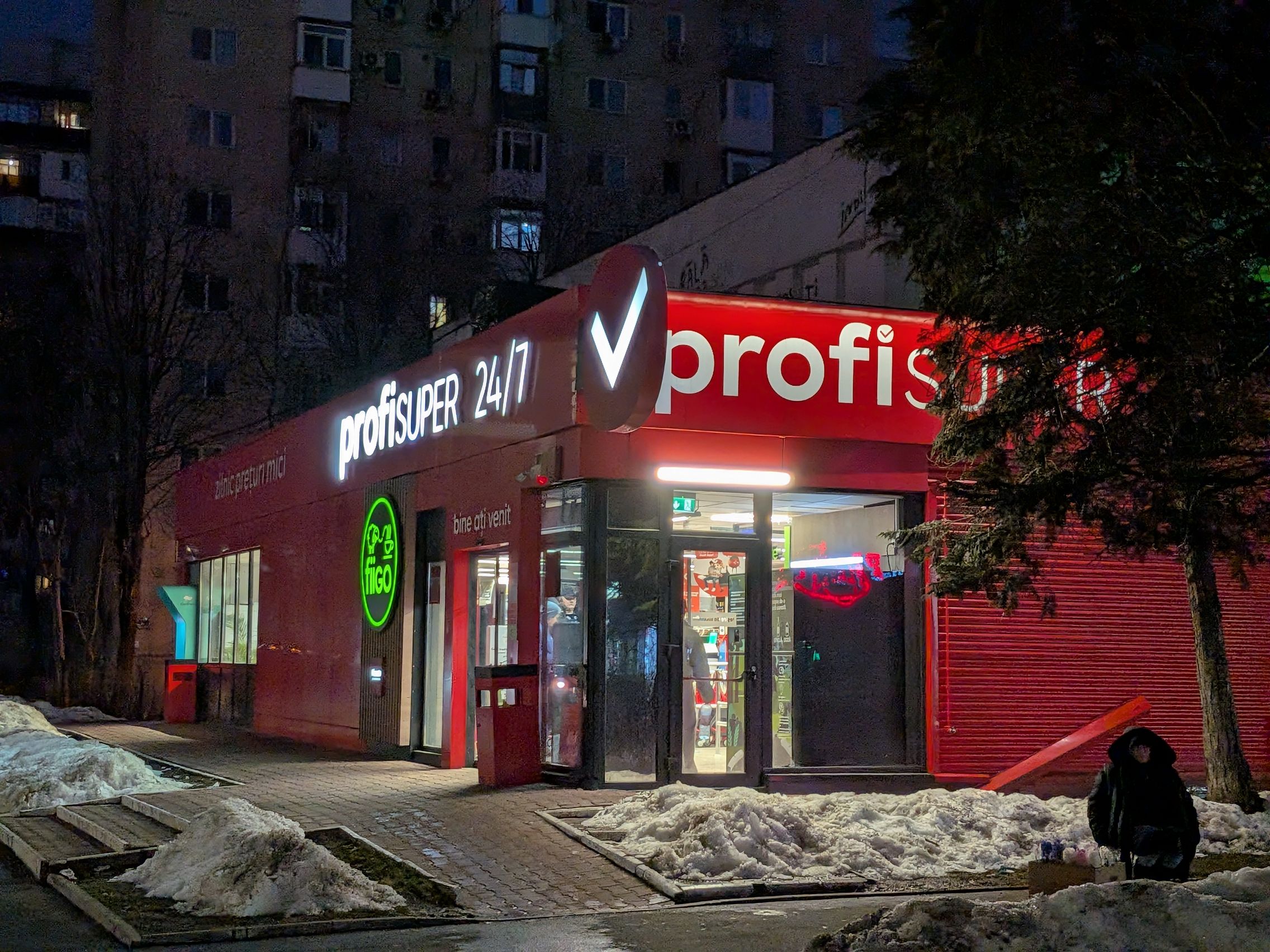 Pe timp de noapte cu Night Sight prima fotografie m-a cam uimit la modul cum a echilibrat lumina de la stâlp, unde e haloul? Sigur, sunt nuanțe de galben, dar chiar și acestea nu acoperă întreg cadrul. Neașteptat! În continuarea plimbării nocturne spre înserat mi-au plăcut cum se vedeau în zare aceste lumini de la stâlpi, asfaltul lucios și reflexiile din mașini. Nici ultrawide-ul nu a fost deloc rău la prima încercare printre străduțe.