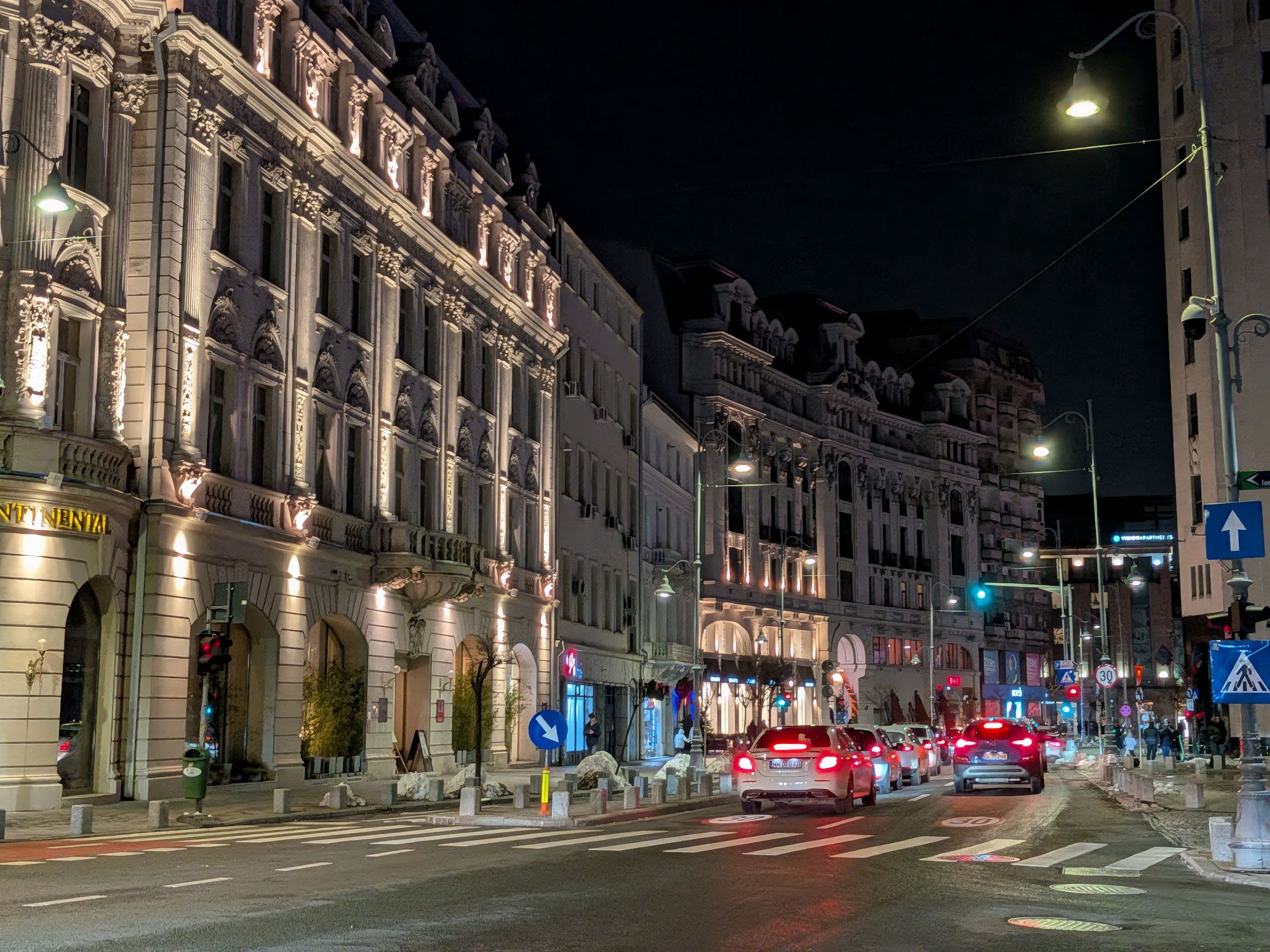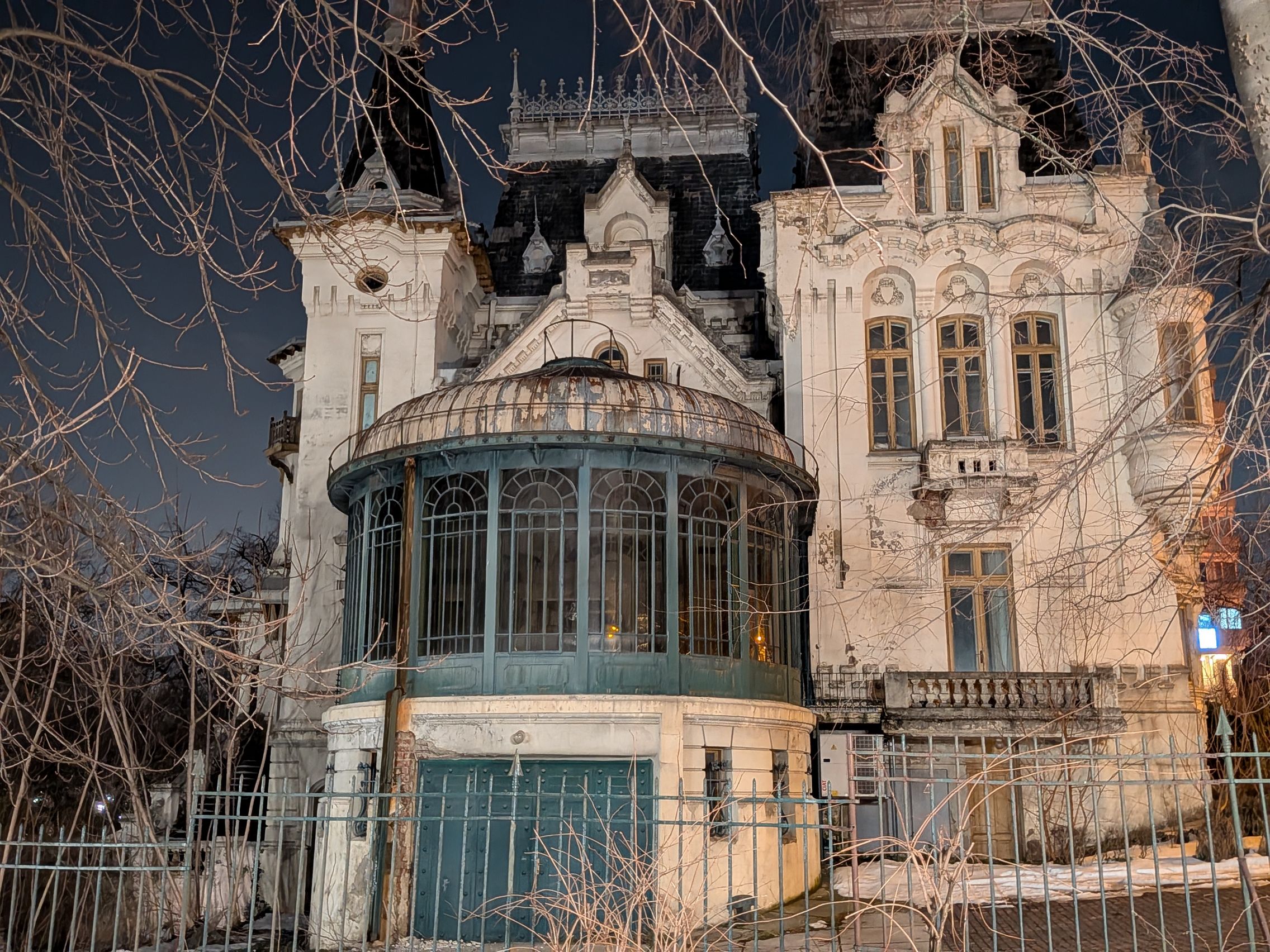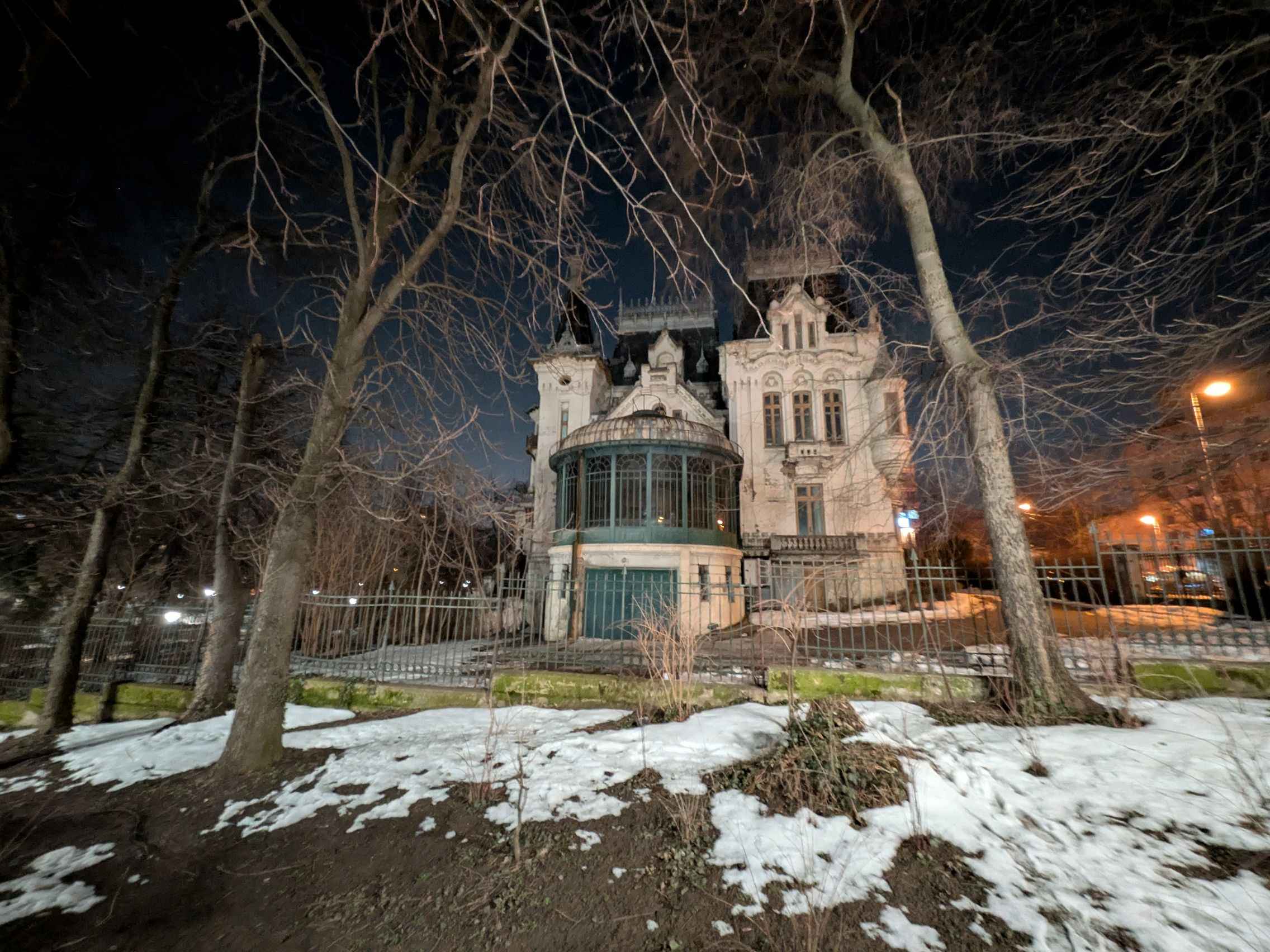 La bulevard am prins și culorile apusului, pink hour și arată foarte bine totul în depărtare. A redat corect și roșul acelor garduri de lângă stația STB, ușor decolorate de timp iar mai apoi m-am mutat în zona Cișmigiu. S-a mai întunecat, halourile au mai prins curaj dar nu s-a exagerat. Acel palat de lângă parc a fost prins în adevărata lui splendoare, chiar și pe timp de noapte. Am dat și puțin zoom pe el.