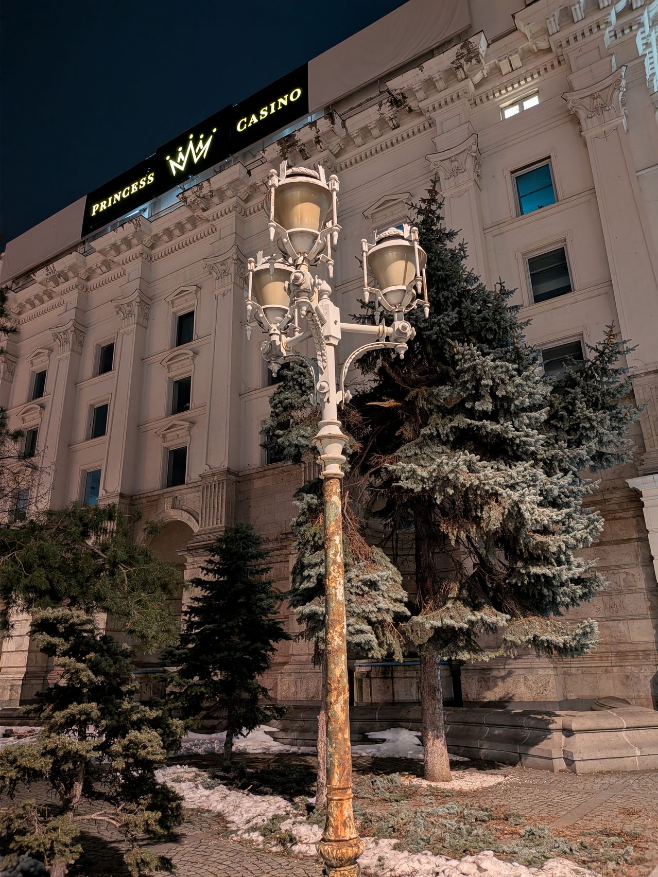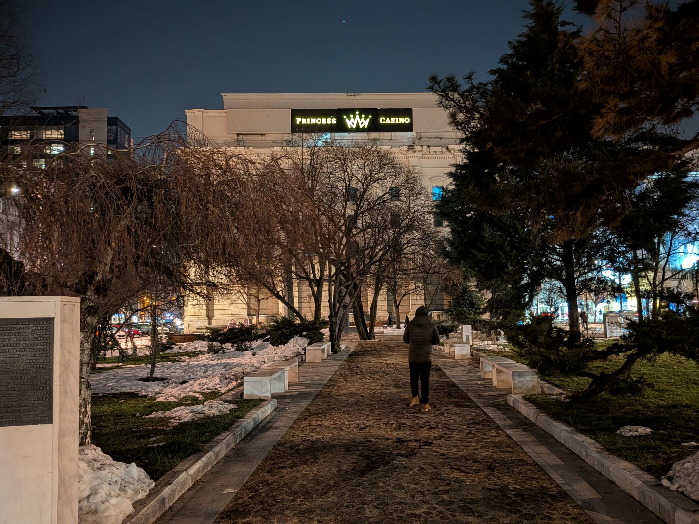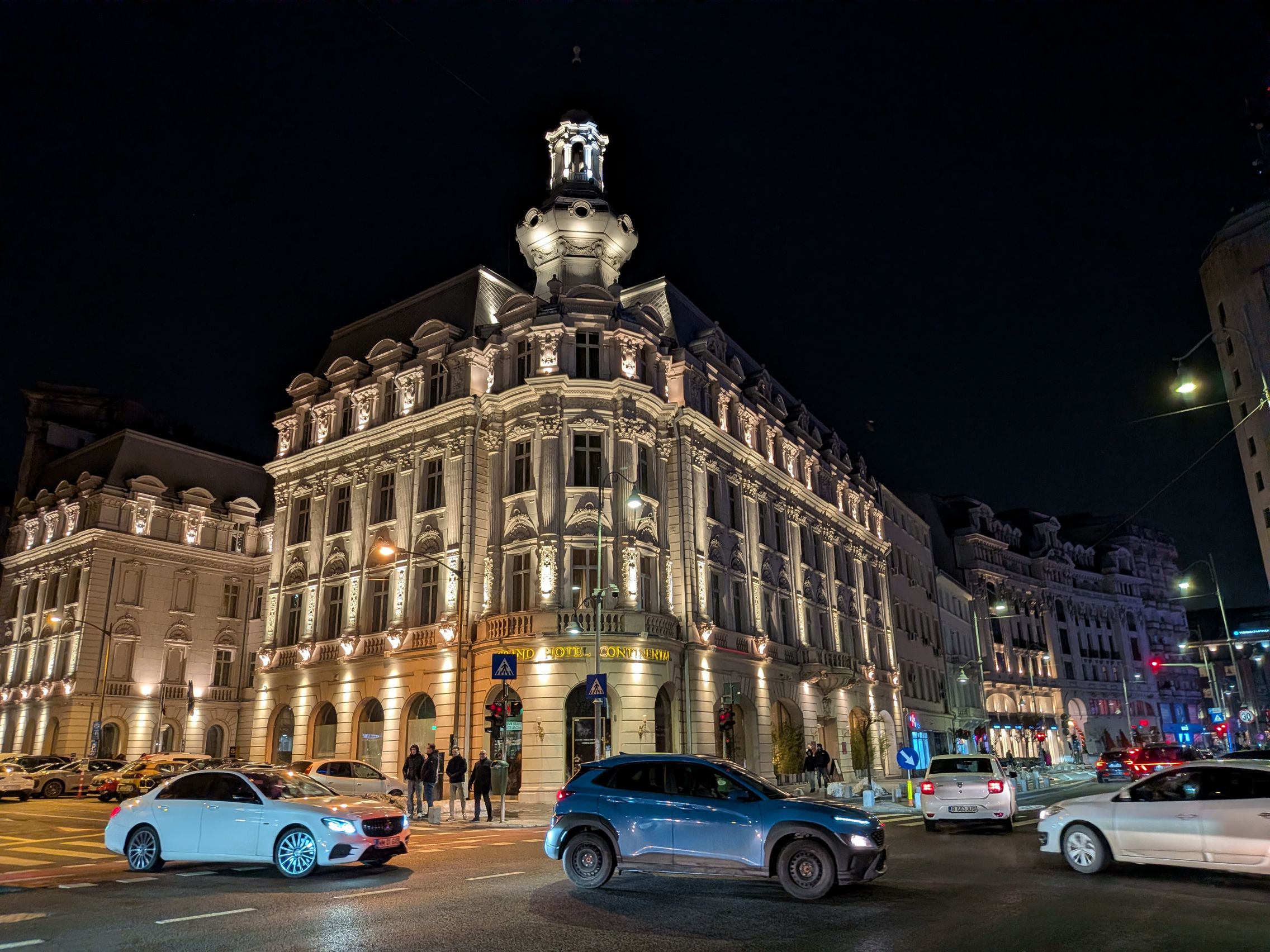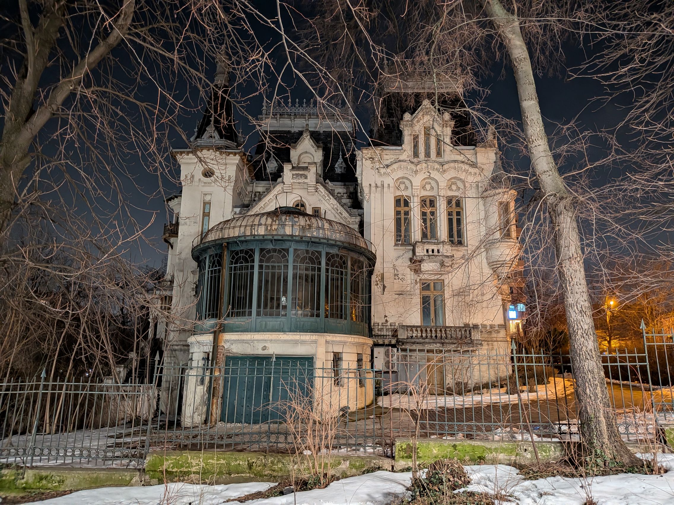 La bulevard am prins și culorile apusului, pink hour și arată foarte bine totul în depărtare. A redat corect și roșul acelor garduri de lângă stația STB, ușor decolorate de timp iar mai apoi m-am mutat în zona Cișmigiu. S-a mai întunecat, halourile au mai prins curaj dar nu s-a exagerat. Acel palat de lângă parc a fost prins în adevărata lui splendoare, chiar și pe timp de noapte. Am dat și puțin zoom pe el.