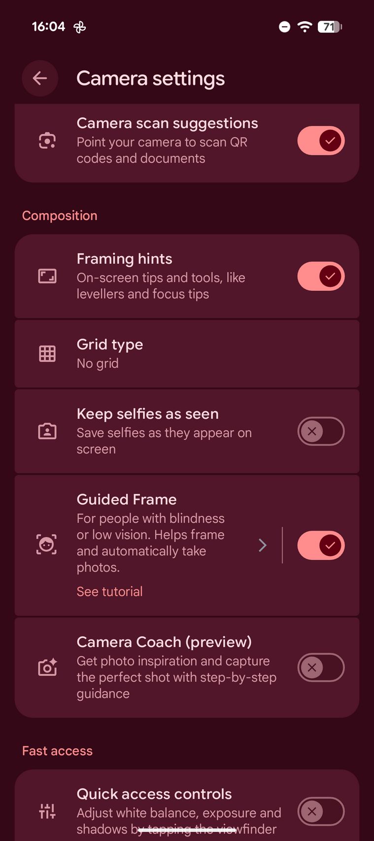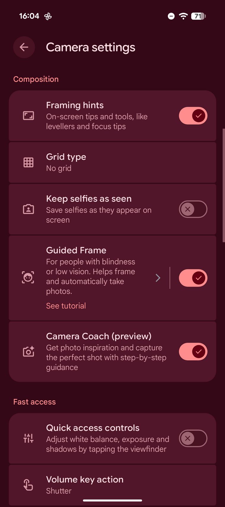 Jos avem modurile Long Exposure, Add Me, Portrait, Photo, Night Sight, Pano, asta pentru foto, iar la video Pan, Video, Slow Motion și Timelapse. Zoom-ul digital la foto este maxim 8x, la la video 5x. Filmarea se face până la 4K@60fps. În setări sunt opțiuni de Camera Coach, tutorial de încadrare și o funcție de Guided Frame pentru cei cu deficiențe de vedere care vor fi ghidați vocal pentru a realiza fotografii.