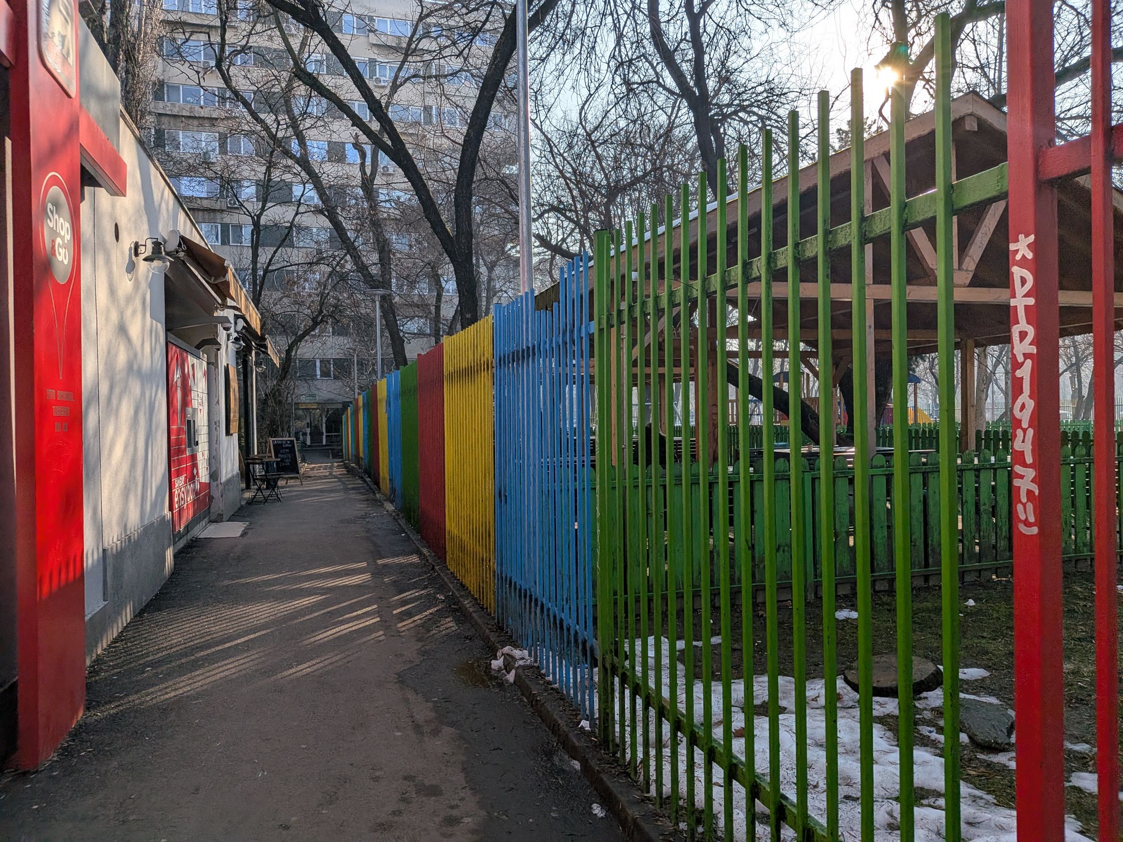 Că tot vorbeam de culori și cele ale gardului sunt 1:1 cu realitatea, mai puțin contrastante, după anii trecuți fără straturi noi de vopsea. Îmi surâde și cum a ieșit filmarea de pe acel trotuar uriaș din Drumul Taberei cu pomi ce își etalau crengile maestuos deasupra. Panoramarea e foarte stabilă și cu mici momente în care HDR-ul are nevoie de ajustări, eu zic că e bine.