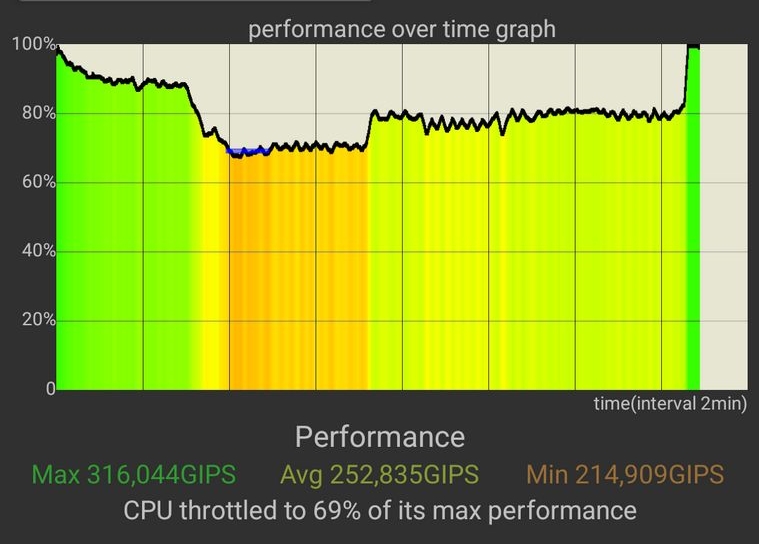 Există și ceva throttling din păcate, cu 31% din performanță pierdută după 15 minute de benchmark CPU Throttling Test. Temperaturile au urcat până la pragul de fierbinte, cu 38.9 grade Celsius la benchmark și 34.2 grade la gaming. Aici e bine la cel din urmă test.
