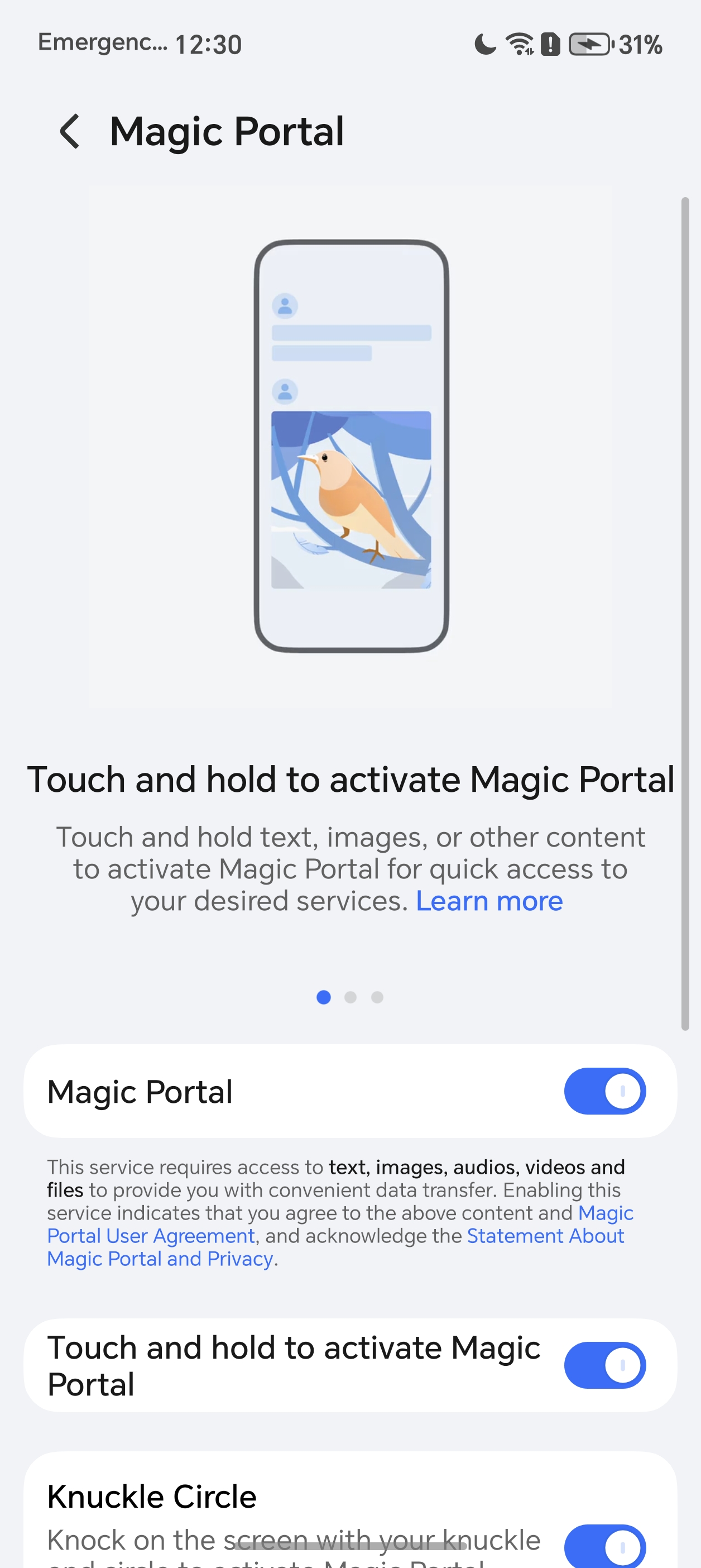 Magic Portal ne e deja familiar de ceva vreme. Apare ca o bară laterală atunci când selectezi imagini sau text, afișând aplicații relevante pentru partajare, notare sau căutare. Selectarea acestora se face printr-un sistem AI destul de reușit, însă integrarea cu aplicațiile Google și terțe nu este întotdeauna uniformă. Knuckle to Search și Circle to Search sunt prezente și funcționează similar implementărilor de pe alte telefoane Android, cu avantajul că pot trimite rezultate direct în Magic Portal.