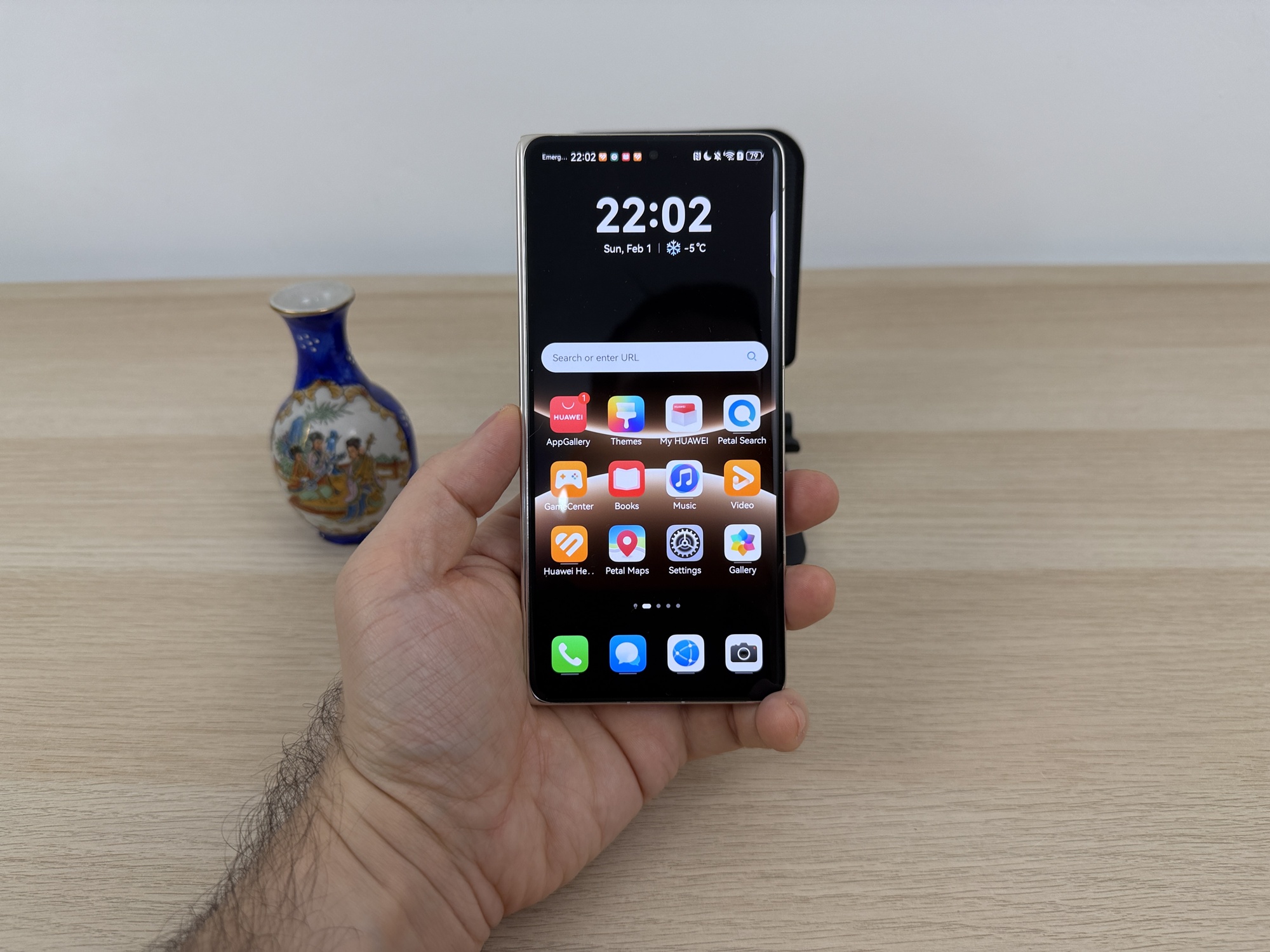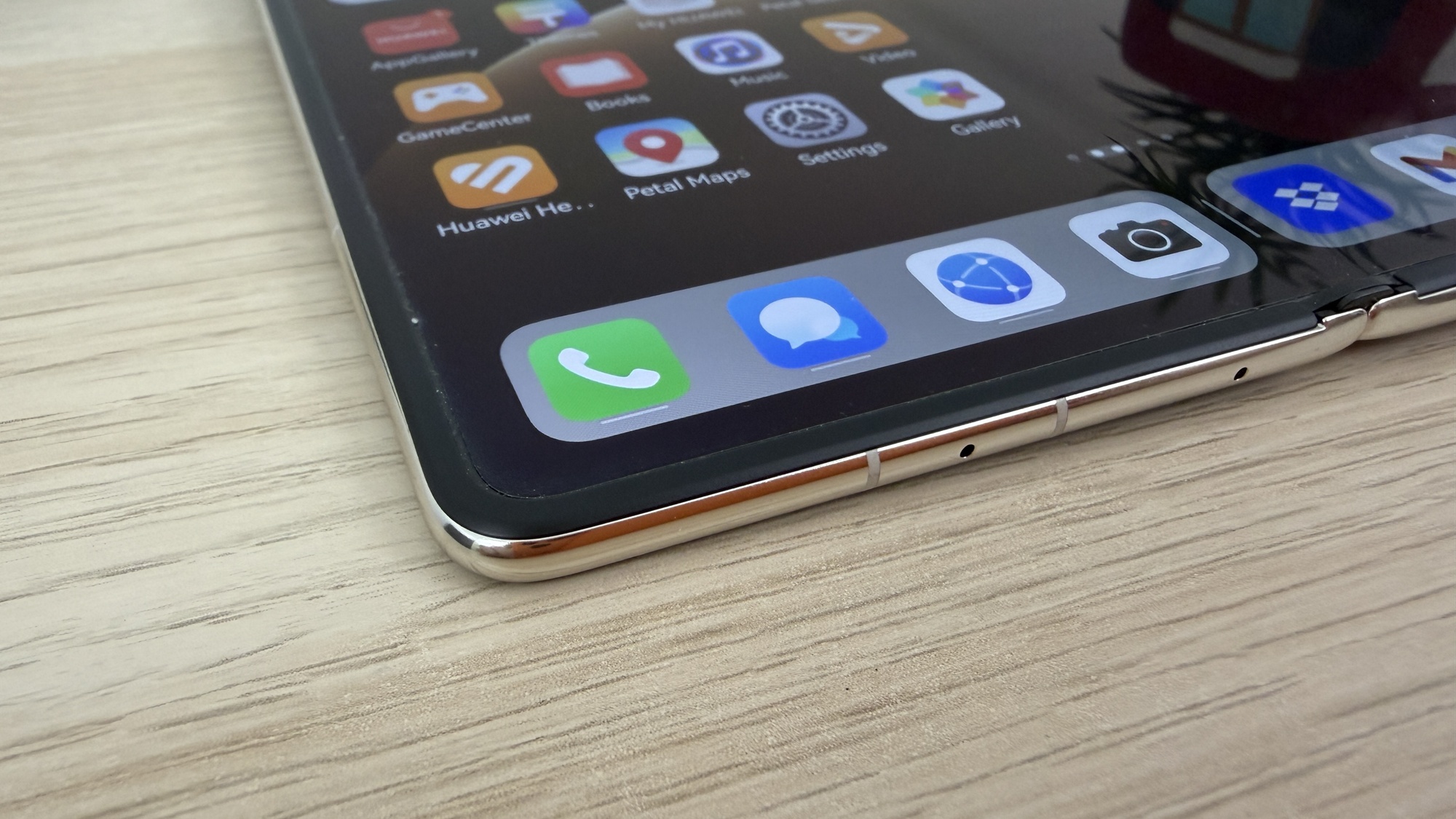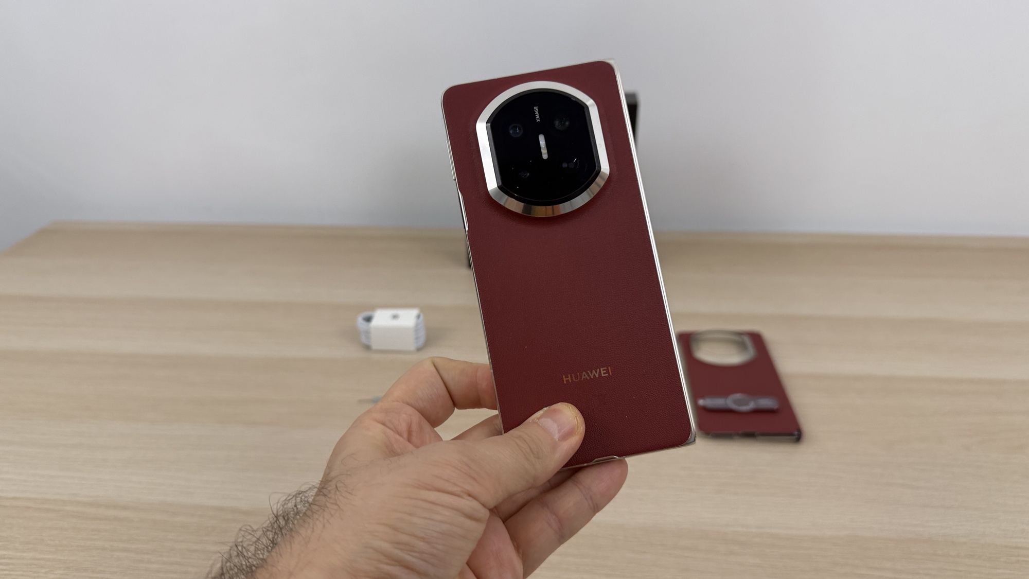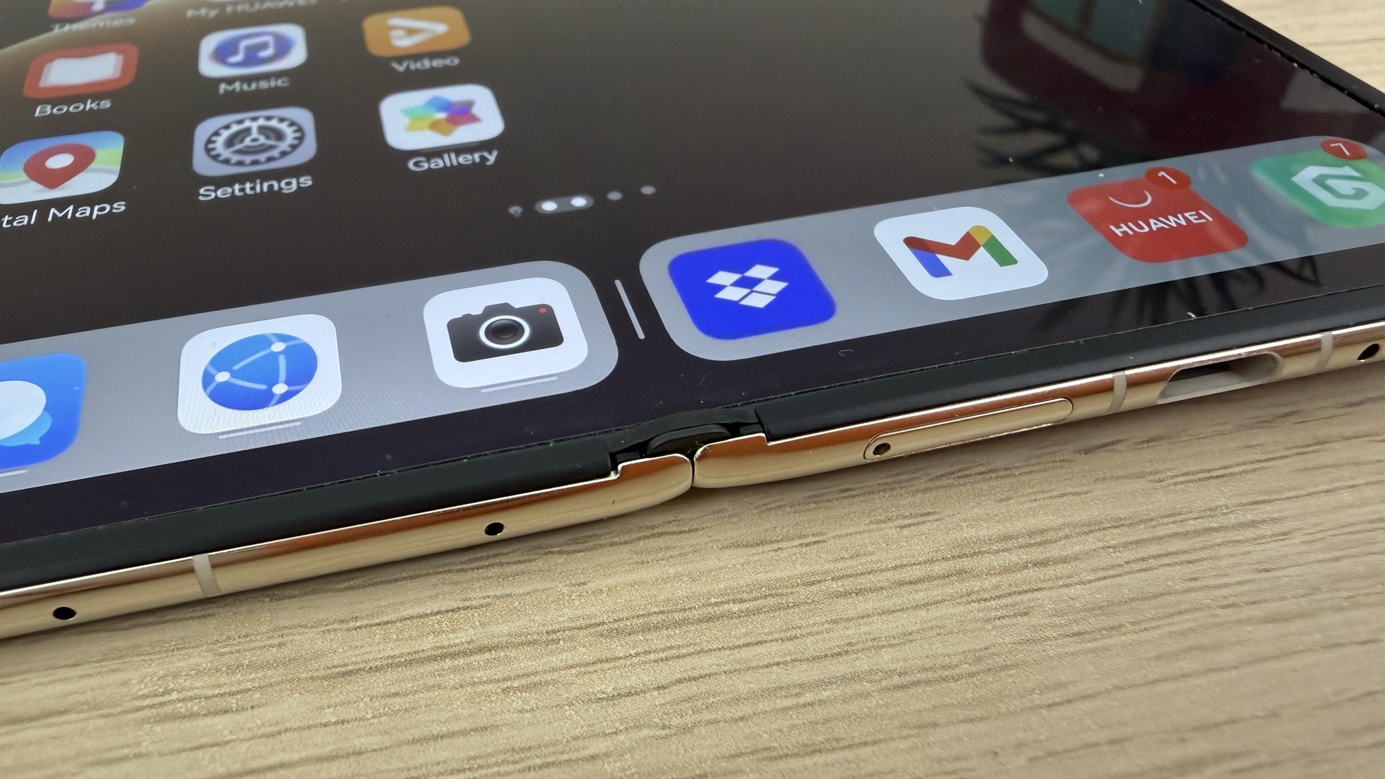 Rama este realizată dintr-un cadru de aluminiu compozit, suficient de ușor pentru a menține portabilitatea unui pliabil premium. În mână, Mate X7 oferă o senzație de obiect bine echilibrat, simetric și compact, mai ales datorită profilului subțire și modului în care muchiile sunt finisate pentru confort.