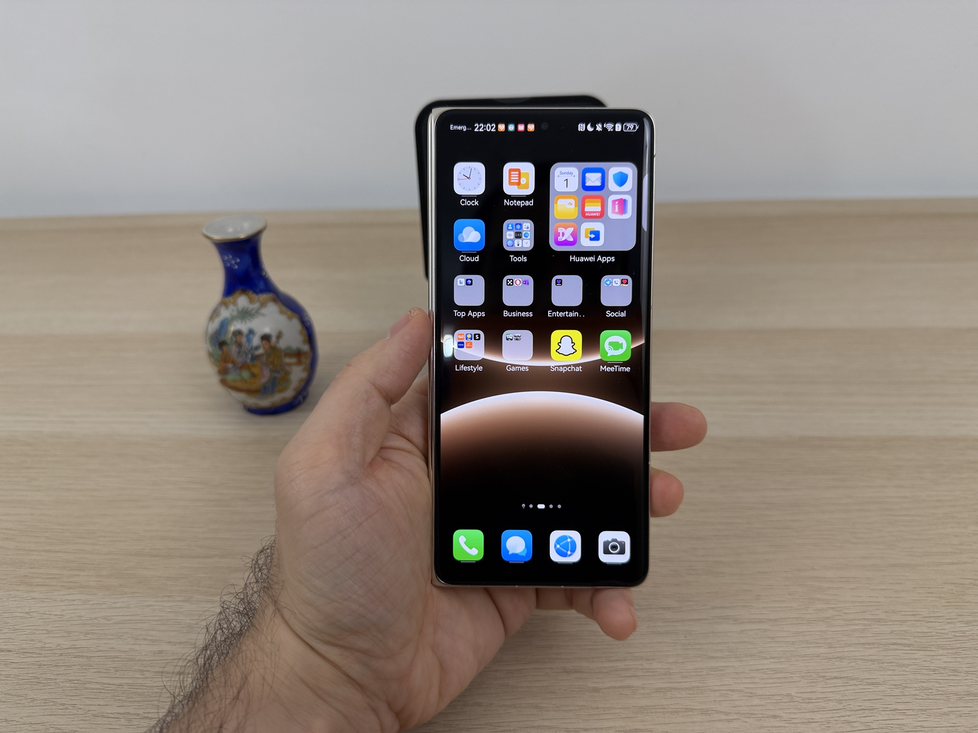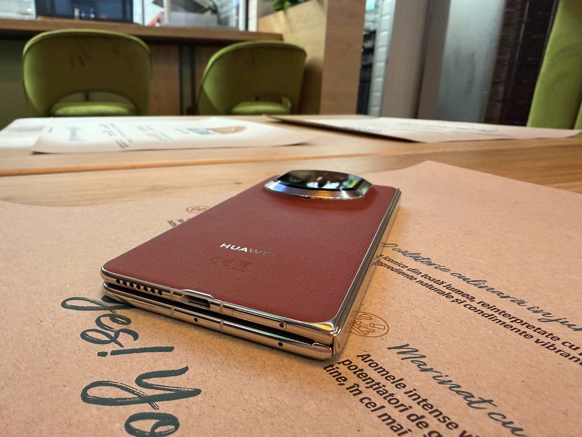 Balamaua este una dintre piesele de rezistență ale designului. Sistemul Advanced Precision Hinge folosește oțel ultra-rezistent cu o duritate de 2350 MPa, echivalentul unei rezistențe la tracțiune superioare titanului. În practică înseamnă pliere impecabilă și constantă în timp. Huawei indică o creștere de 100% a rezistenței la îndoire față de Mate X6, un detaliu care confirmă evoluția longevității balamalei. Deschiderea și închiderea sunt fluide, lipsite de vibrații, iar telefonul rămâne stabil în orice unghi de folosire.