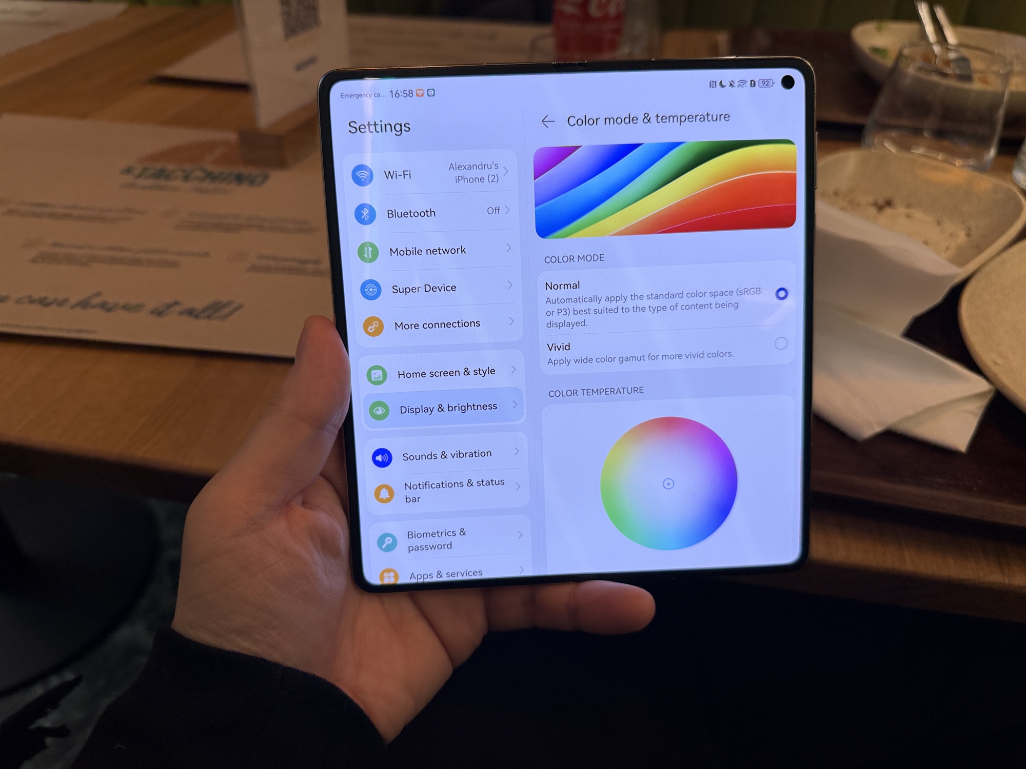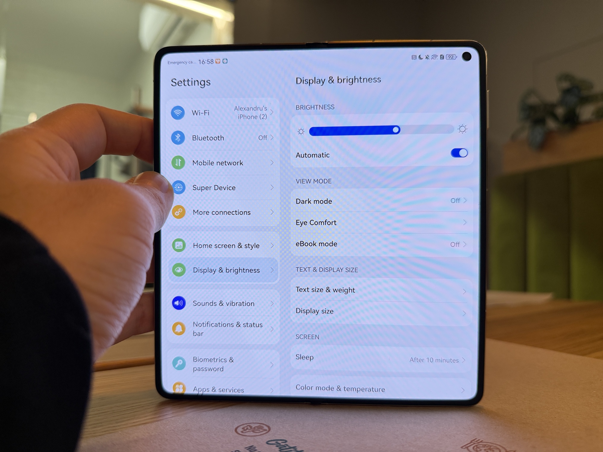 Setările ecranului includ luminozitate, Dark Mode, Eye Comfort, mod eBook şi mărime text şi afişaj. Modul eBook poate fi şi alb/negru, iar apoi vine zona Color Mode & Temperature, cu reglaje sRGB/P3 sau Vivid. Avem chiar şi o paletă reglabilă pentru temperatura culorii.