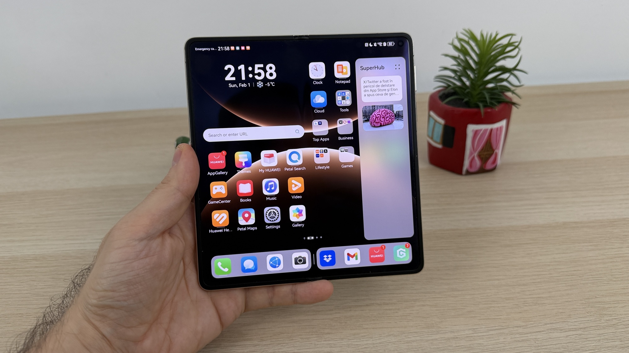 Rămâne totuşi un telefon pentru productivitate, suplinitor de tabletă cu ecran de 8 sau 9 inch. Gândit pentru split screen în mail, notiţe, galerie. Cu SuperHub la îndemâna ca un clipboard vizual. A crescut şi capacitatea bateriei cu 10% şi trecem şi la un CPU nou. Deşi la prima vedere acest telefon împrumuta chiar senzorul foto principal de pe Huawei Pură 80 Ultra, sunt câteva aspecte unde Mate X7 bate şi seria Pură 80.