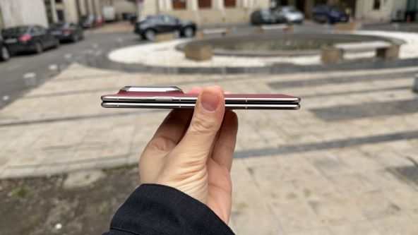 E şi mai subţire decât acel model cu 0.1 mm. Această subțiere nu sacrifica rigiditatea, deoarece structura internă folosește un compozit în trei straturi ultra-tough, creat tocmai pentru a menține rezistența mecanică în zona critică a ecranului interior. Rezultatul este un pliabil care nu flexează și nu creează impresia de fragilitate, chiar și atunci când este deschis complet.