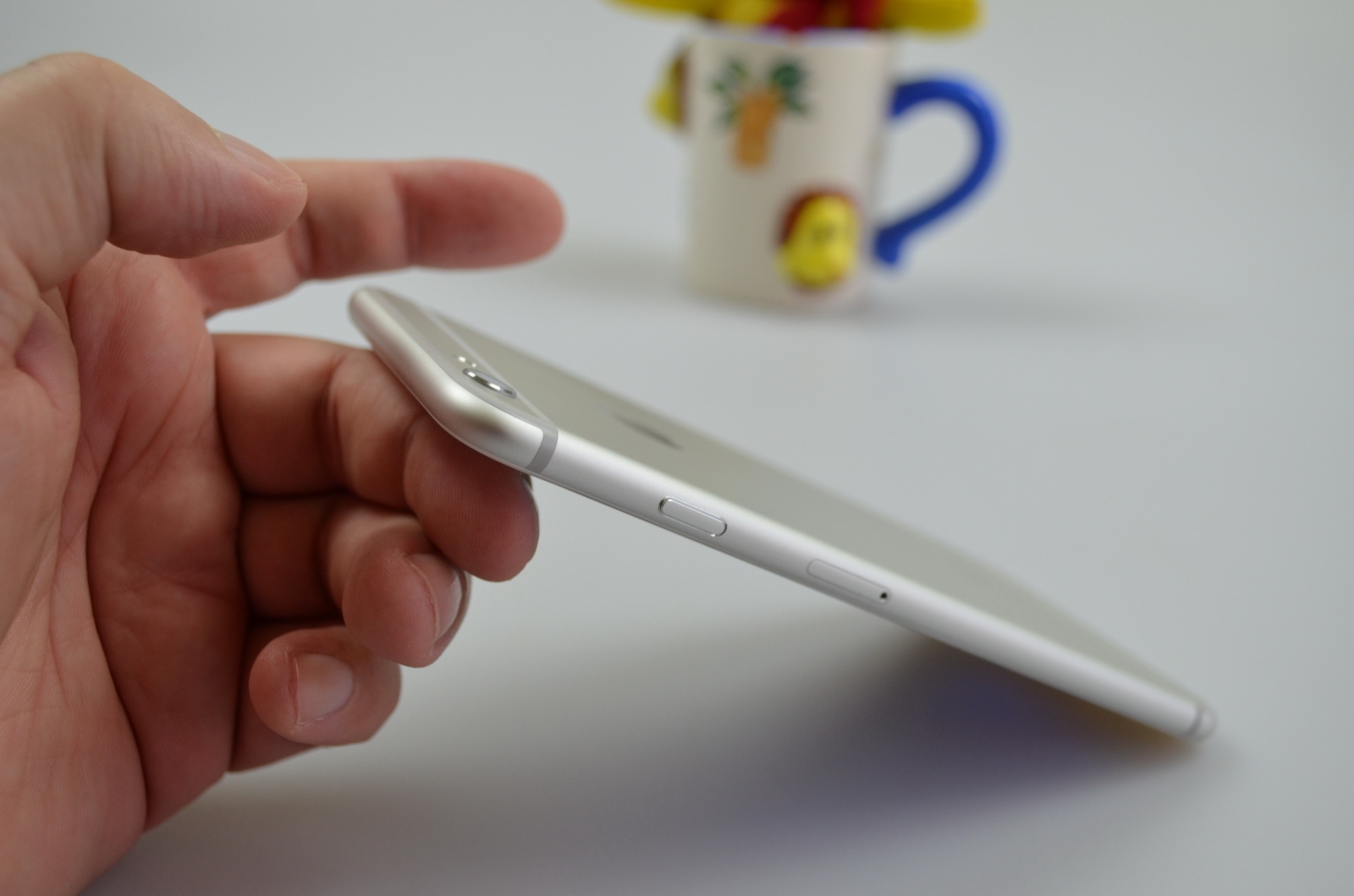 în spate se află camera principală, cu blitz dual tone și microfon, iar în dreapta găsim butonul On/Off de sus în acea zonă și slotul nano SIM, care se accesează cu o cheiță metalică. în stânga se află butoanele de volum în formă de pilulă, împrumutate de la iPad Mini și butonul mute. Aparent găurile făcute pentru butoanele de volum ar fi cauzat #bendgate și vulnerabilitatea structurală, dar rămâne de văzut dacă utilizarea de zi cu zi aduce și ea acest tip problemă.
