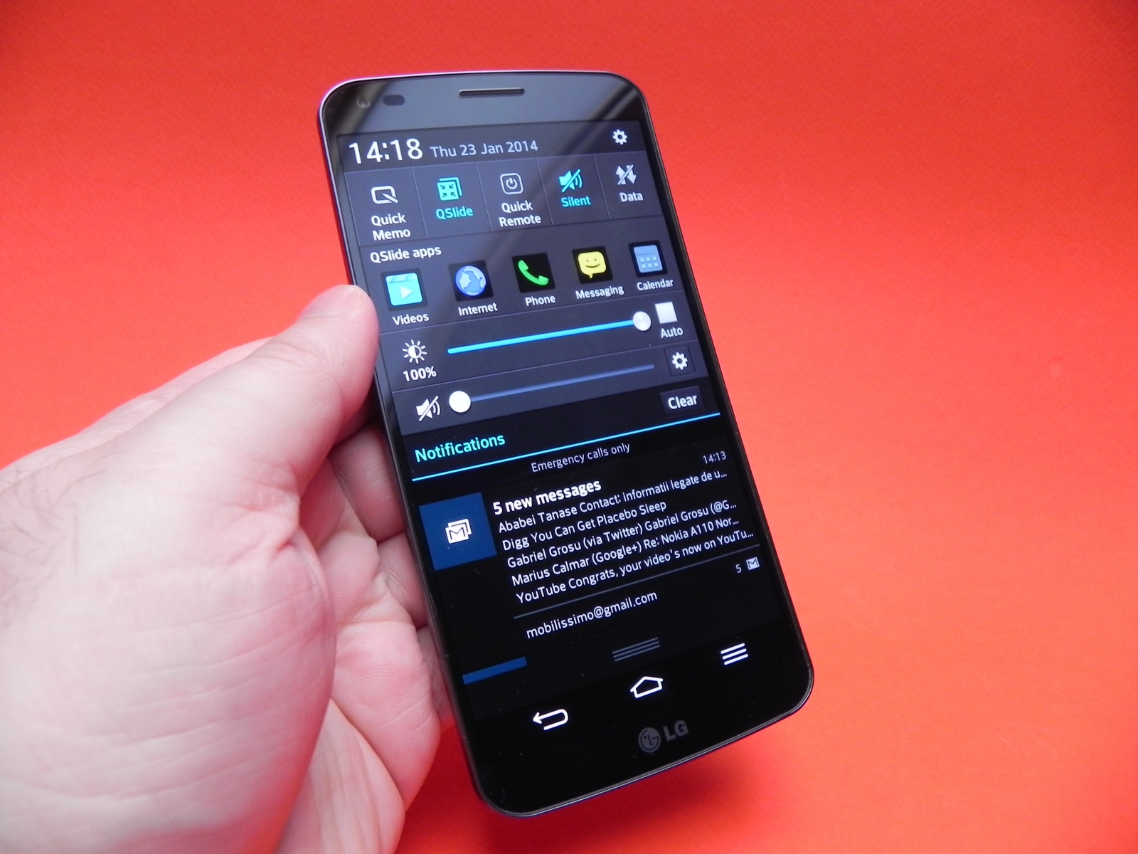 și scorul din BrowserMark 2.0 a fost bun: 2665, semn că browserul chiar este rapid. în concluzie acest model este aproape de rivalii săi cu Snapdragon 800, deși se cam simte lipsa unui ecran mai bun. Analizăm în video review și zona de notificări și setări, cu aceleași opțiuni ca și LG G2, de la Quick Memo și Q Slide (un fel de pop up play cu floating windows), la Quick Remote. în zona de setări descoperim și cele câteva variante de multitasking de pe acest handset.