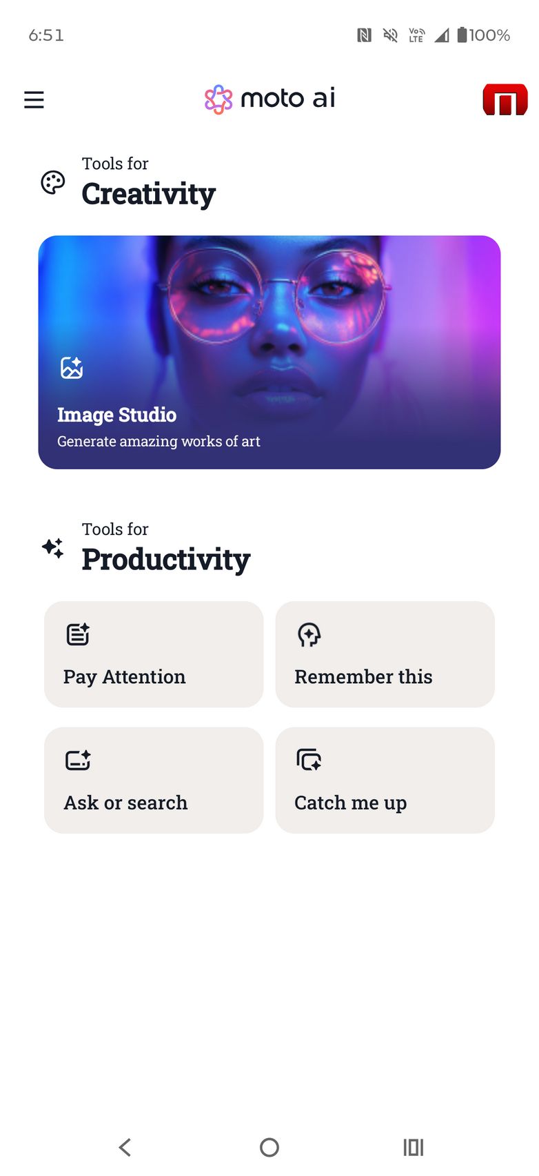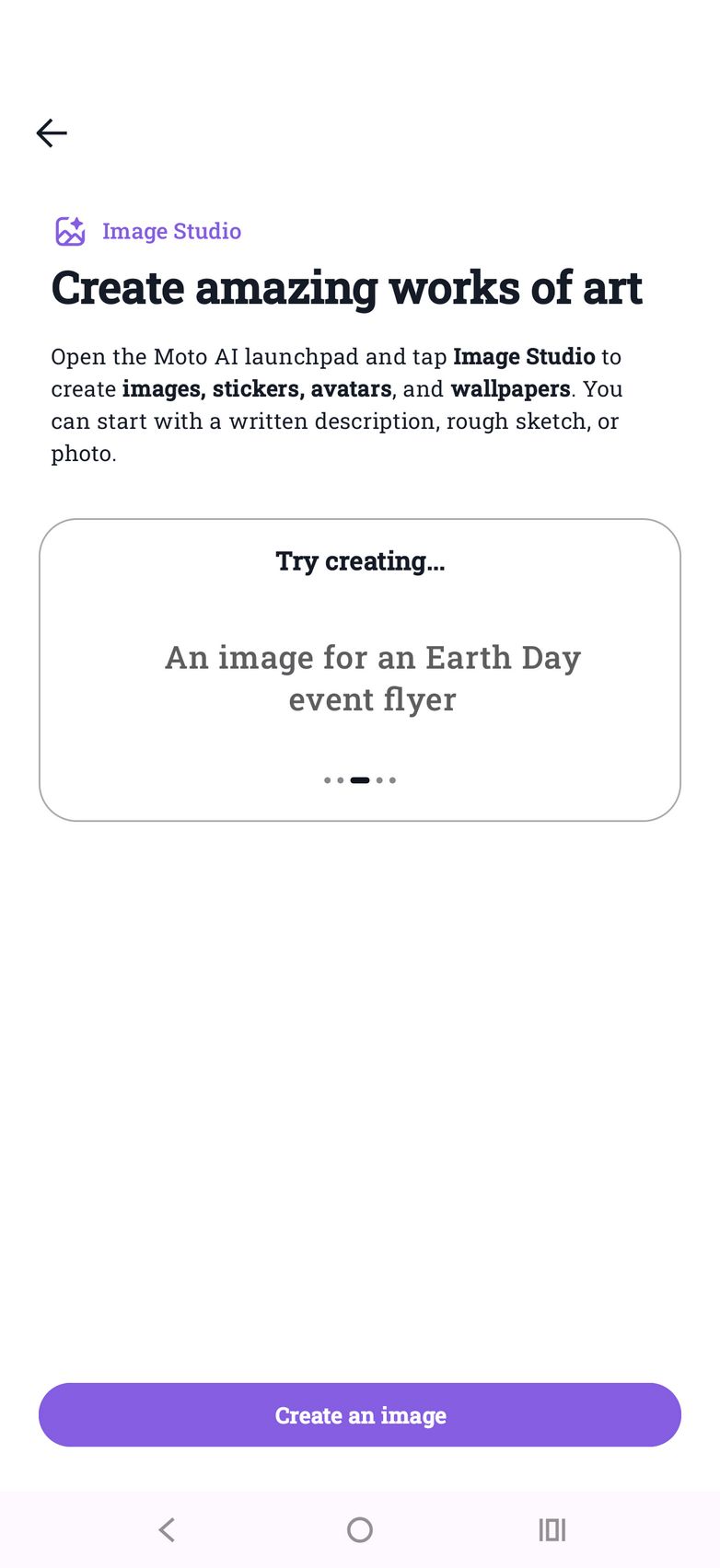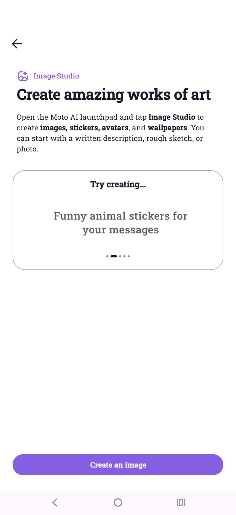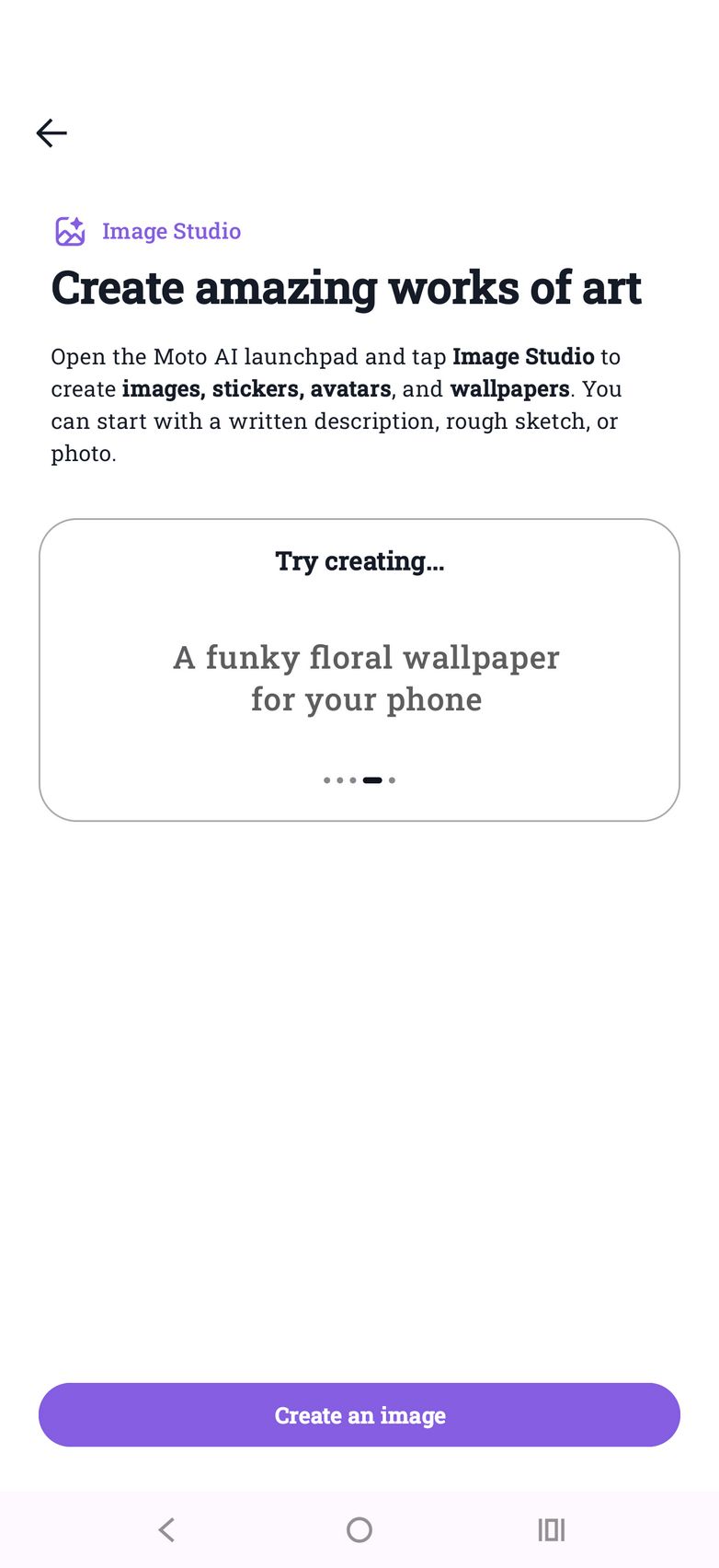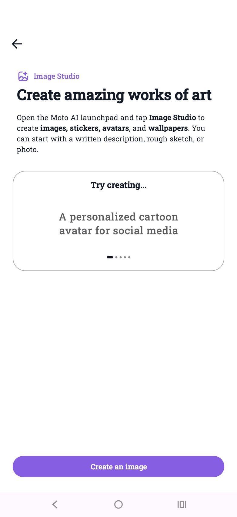 Moto AI are o aplicație dedicată pe telefon de unde am accesat zona de creativitate Image Studio. Aici se pot crea imagini pe bază de prompt text și sunt limite zilnice de generare imagini. Se pot crea și stickere, un avatar, crea un wallpaper preluând culorile ținutei tale sau transforma desenele tale în opere de artă profi watercolor, realiste, schiță sau cerneală.