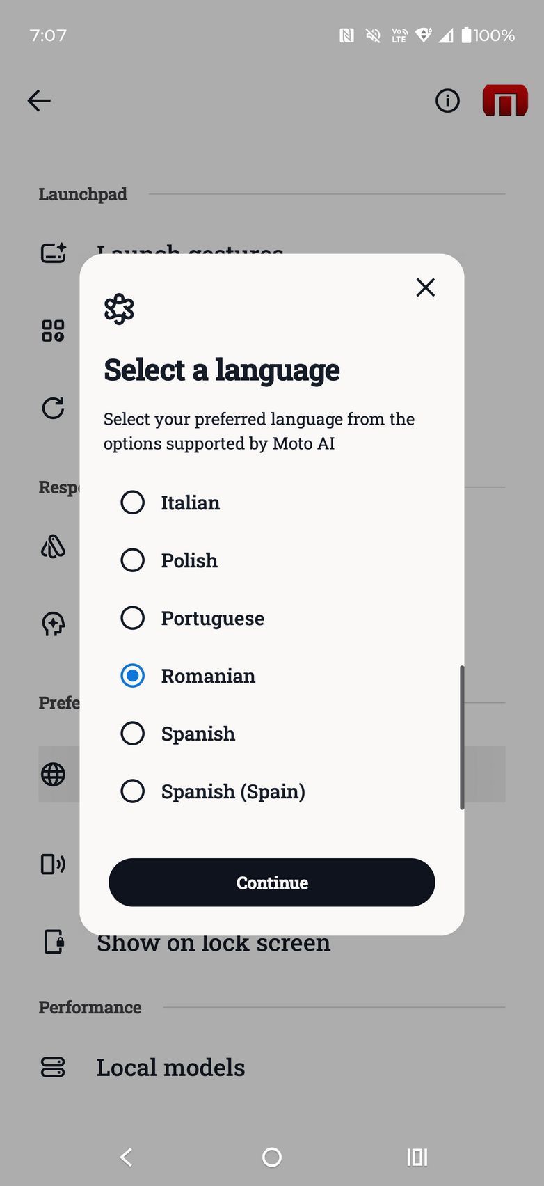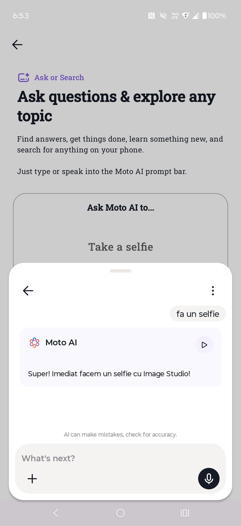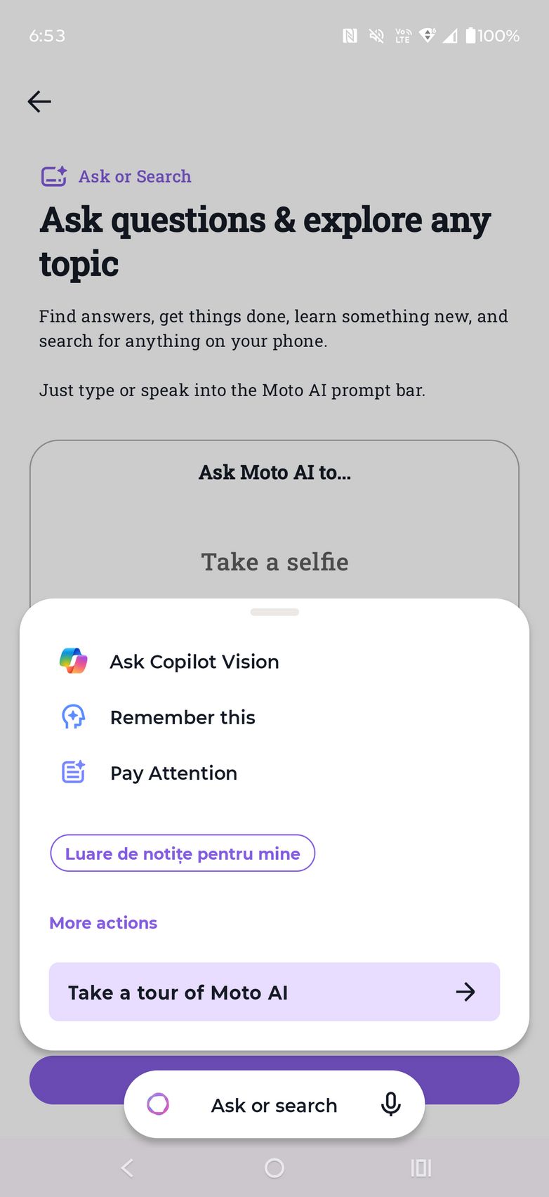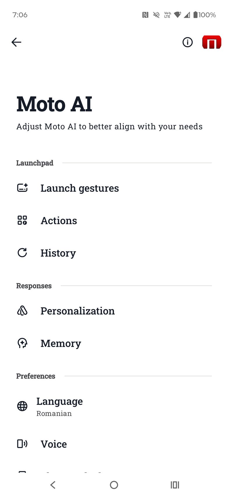 Avem și Perplexity preinstalat, Copilot, Circle to Search, Gemini, plus editări foto în Google Photos. Nu există acel buton lateral dedicat AI-ului ca pe alte telefoane Moto, dar poți asocia Moto AI butonului power. Suita Moto AI este disponibilă și în limba română.