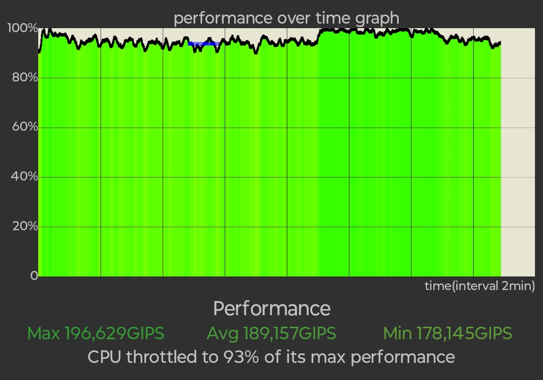 Avem și rezultate din CPU Throttling Test unde stăm foarte bine, cu doar 7% din performanță pierdută după 15 minute de rulare, pe locul 17 din 25. Ca temperatură, nu e cazul de îngrijorare, cu 34,9 grade Celsius maxim după benchmark-uri și doar 30,5 grade după 15 minute de gaming light.