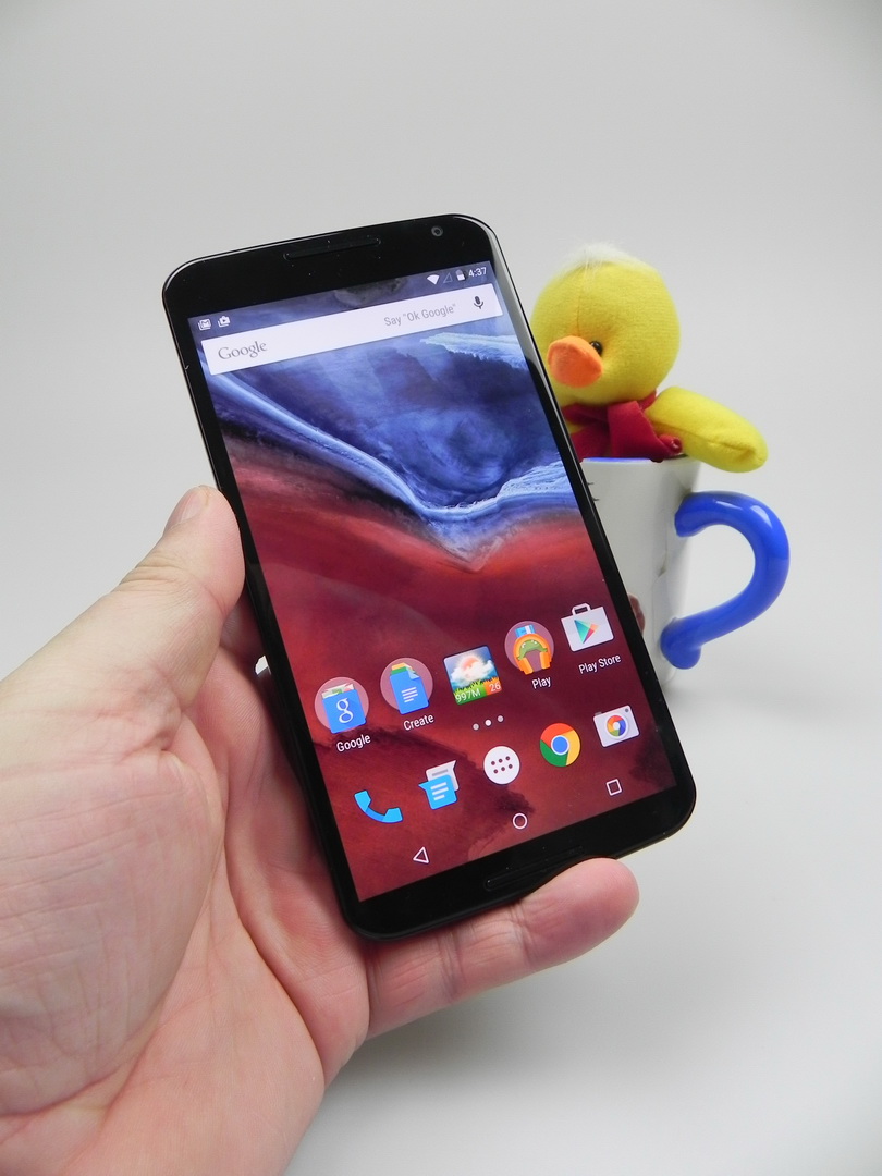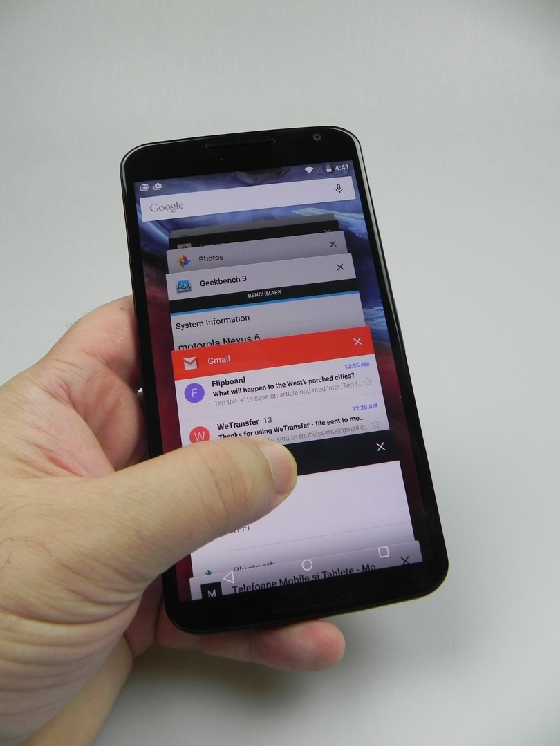 Nexus 6 câștigă 3 din 10 bătălii, dar în general are scoruri bune în benchmark-uri. în plus, nu suferă de lag, are UI foarte fluid și poate rula orice joc cu grafică 3D. Că OS avem Android 5.0 Lollipop, cunoscut inițial ca Android L, în formă prezentată ca prototip cu luni în urmă. Lollipop se remarcă prin Material Design, care schimba abordarea de look a lui Android. Astfel, totul e mai colorat, mai bombastic și animațiile sunt mai ample. Iluminarea și umbrele din UI sunt mai realiste, iar totul e mai responsiv. Fonturile și iconurile sunt acum noi și avem parte și de noi efecte.