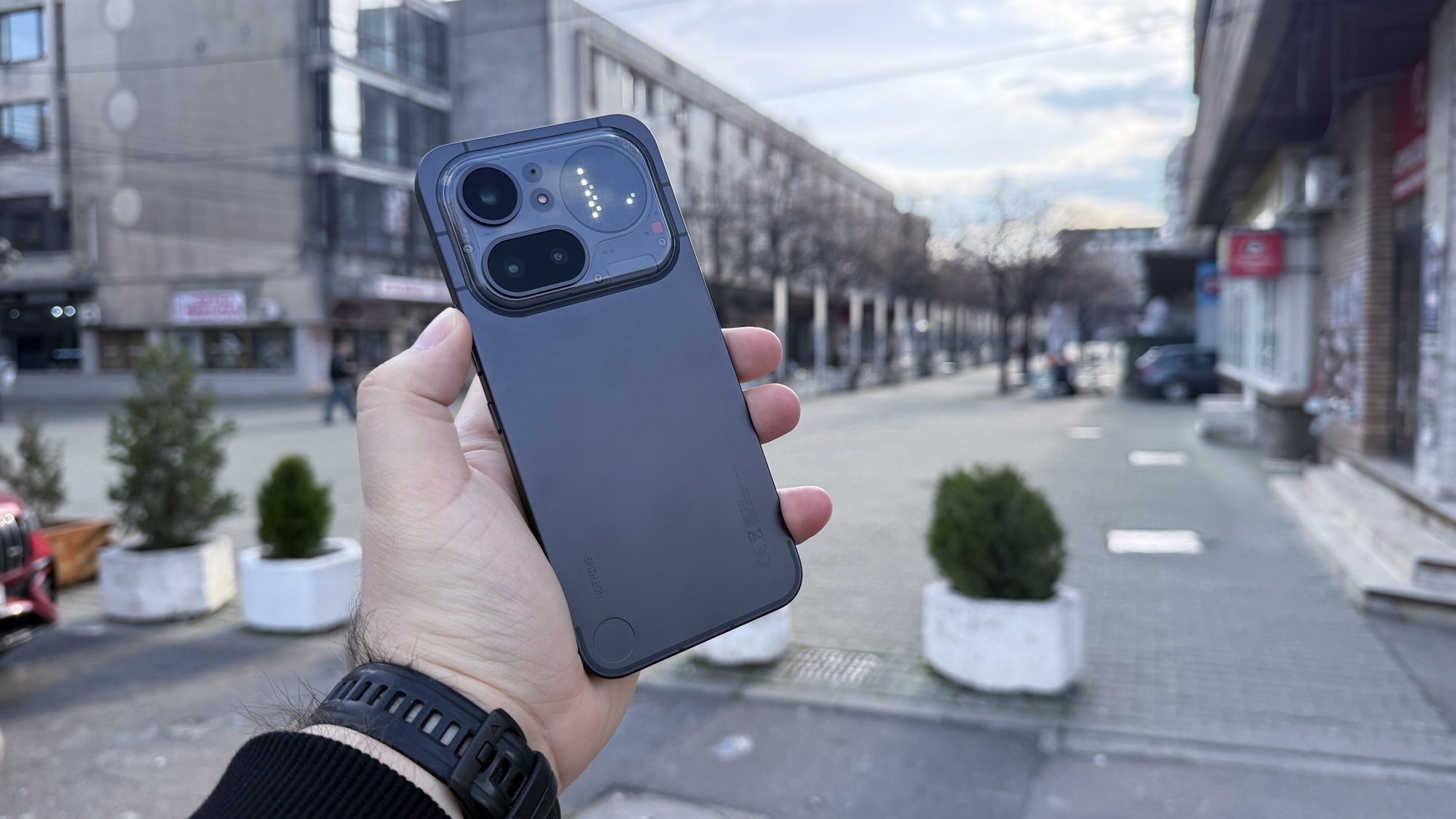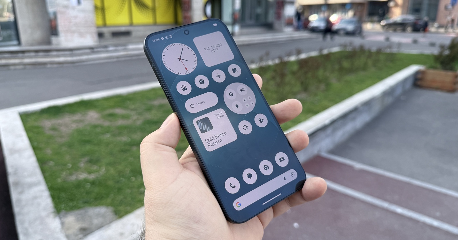 Aș zice că Nothing a reușit să își construiască o identitate vizuală solidă, chiar dacă discutăm despre o companie încă nouă pe nișa telefoanelor mobile. A ales să renunțe la interfața luminoasă Glyph în schimbul așa-zisului „Glyph Matrix”, o zonă circulară integrată în spate, în modulul foto, lângă camera triplă. Se schimbă însă și construcția față de predecesor, întrucât avem de-a face aici cu aluminiu de grad militar, unibody, tare plăcut la atingere.