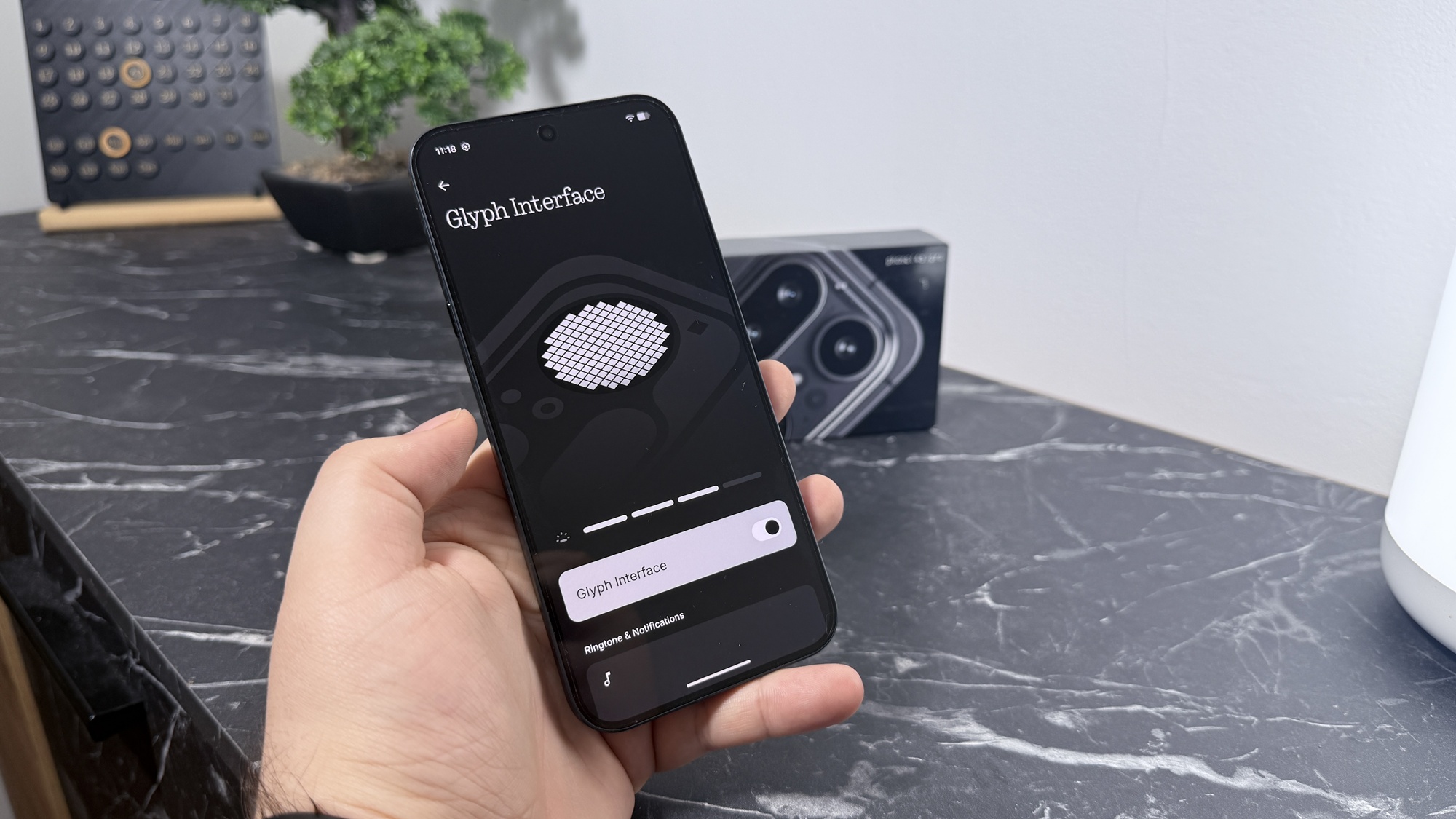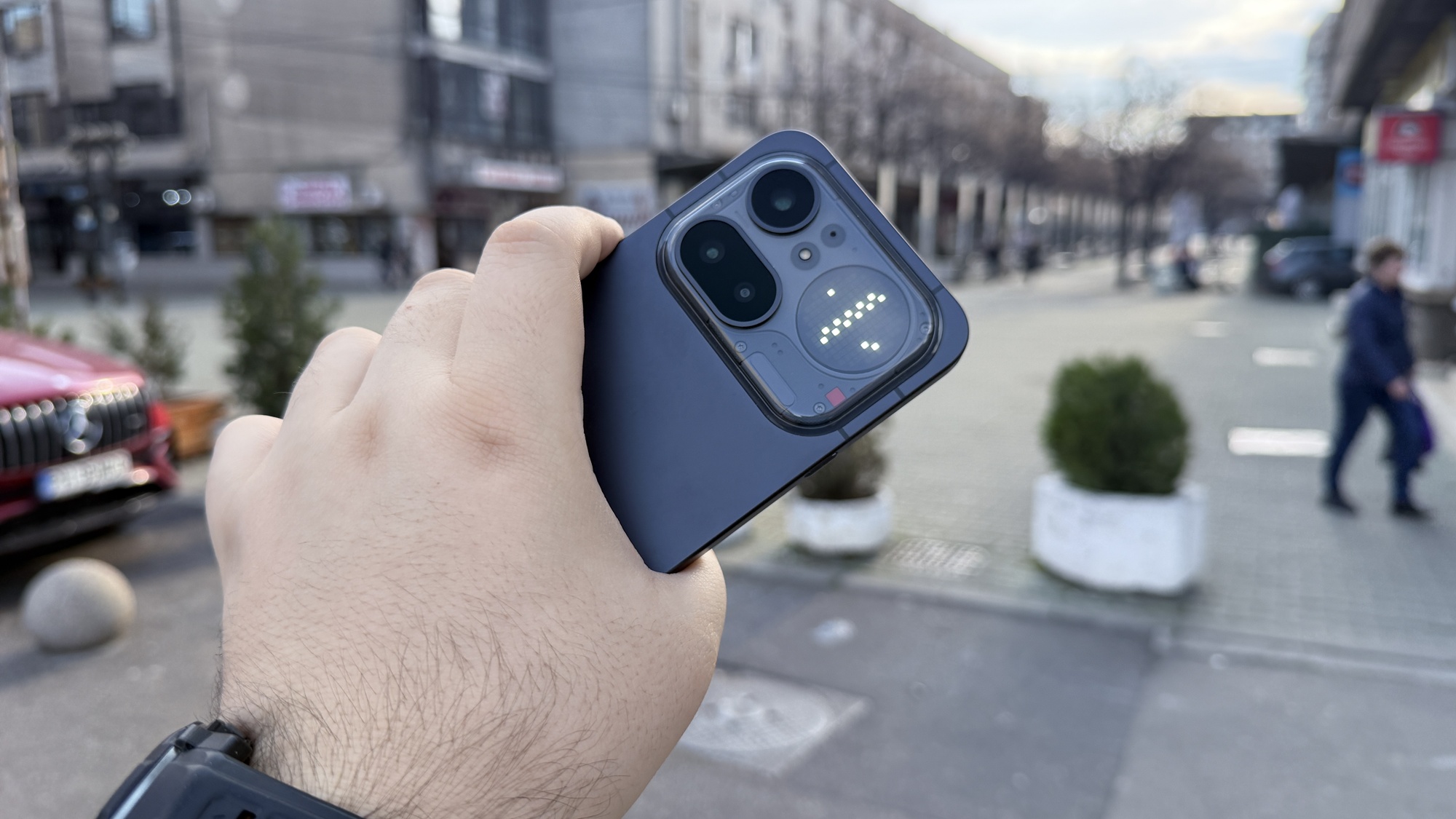 Per total discutăm despre un look curat, chiar business, mergem în zona flagship-urilor cu pretenții datorită materialelor folosite. Revenind la Glyph Matrix, el aduce o luminozitate de până la 3000 nits și implică 137 de mini-LED-uri care afișează un soi de Pixel Art. Putem alege simboluri custom pentru afișarea notificărilor, precum o inimă atunci când suntem sunați sau primim mesaje de la iubită / nevastă.